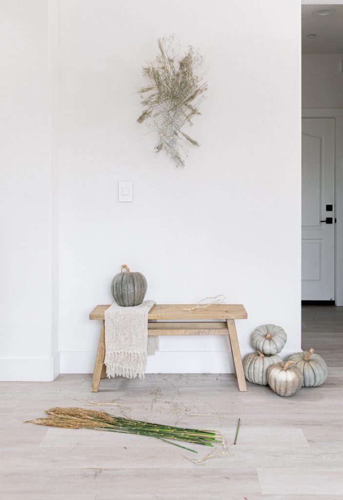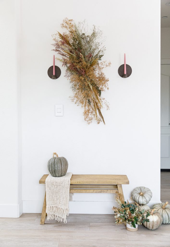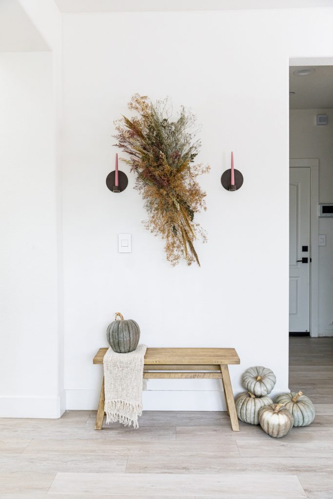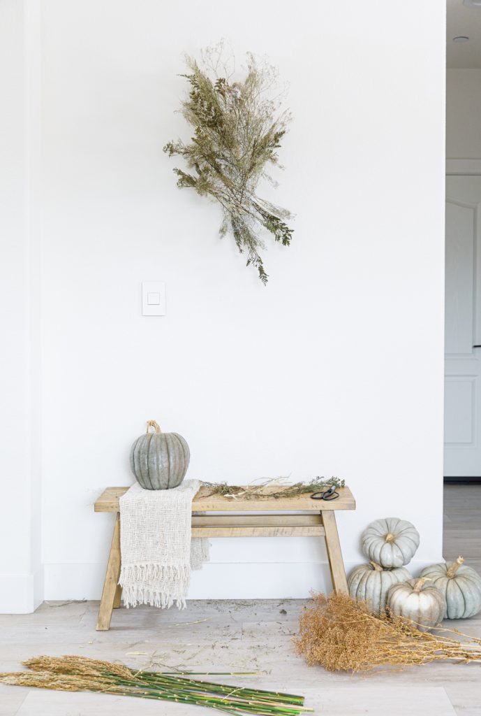 Sammy makes it super easy for us! It’s all about adding layers upon layers. Have about three different types of dried florals to work with for this fall DIY.