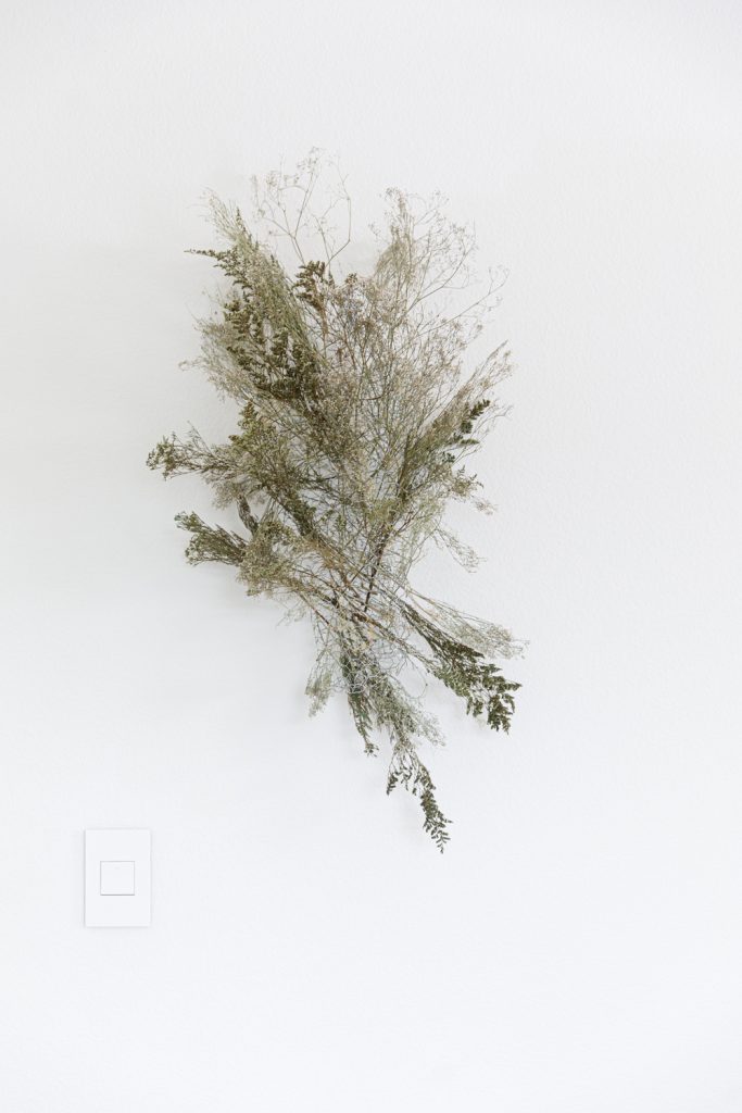 Cut and roll up the chicken wire into a ball to create more areas for your foliage to stick. When you make your chicken wire cage try to make the desired shape. Secure the base with command hooks. Now it’s time to have some fun! Start with the thickest foliage to help shape your piece. Add different layers of dried florals as you go. Adding longer pieces to create an organic look. Tip: Place the foliage in different directions to add dimension. You can’t go wrong; it’s your creation! Have fun with it!