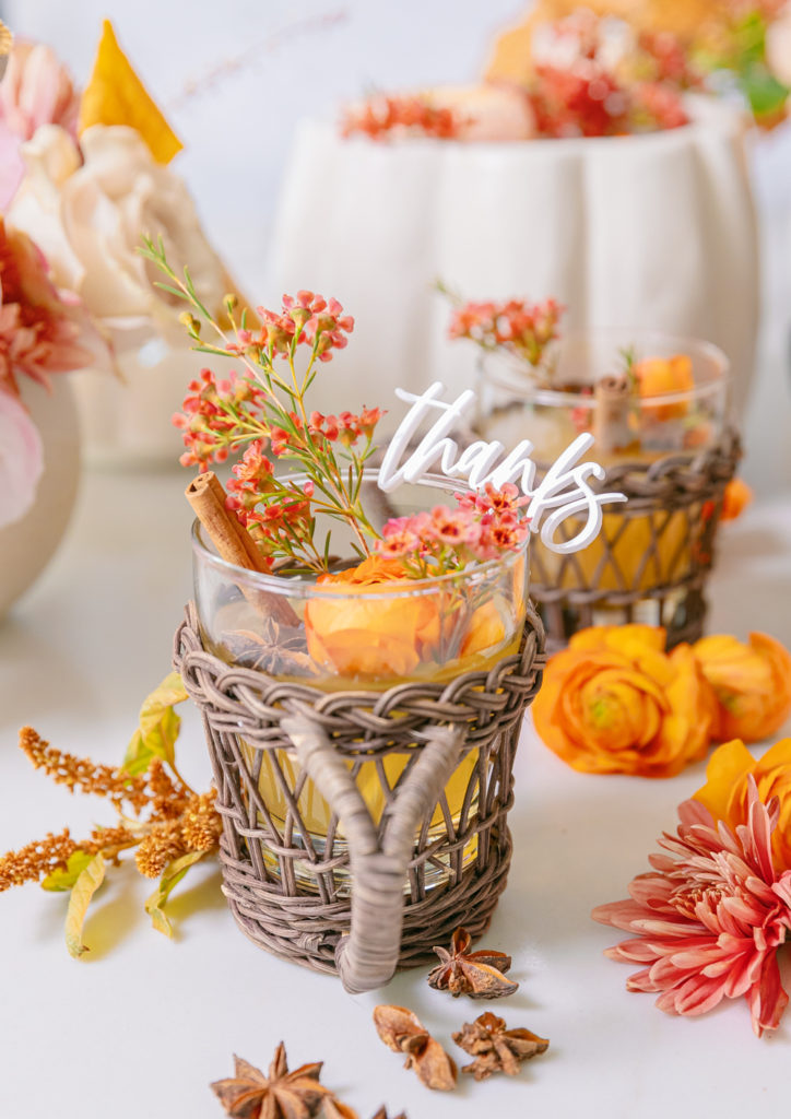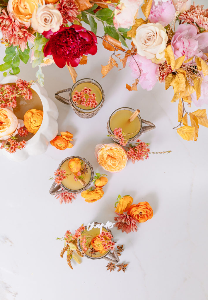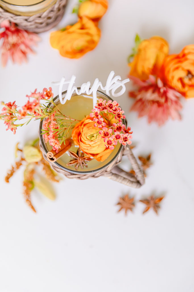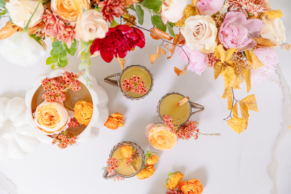 In your pumpkin bowl, combine the apple cider, orange juice, lemon juice, pumpkin butter, vodka, and brandy. Chill until ready to serve. When you’re ready to serve, grab your pumpkin bowl, and add the chilling punch mix. Then add the ginger beer, pomegranate arils, and apple slices. Garnish with flowers, and you are ready to serve up! If desired, rim glasses in cinnamon sugar, fill with ice. Garnish with apple slices and cinnamon sticks, flowers, and some fun thanksgiving themed cocktail stirs from David and Leanna.