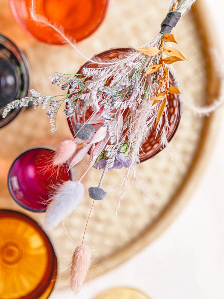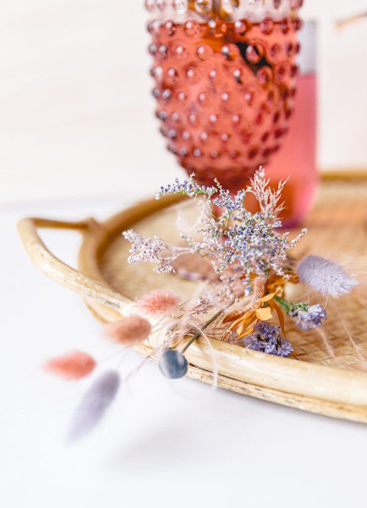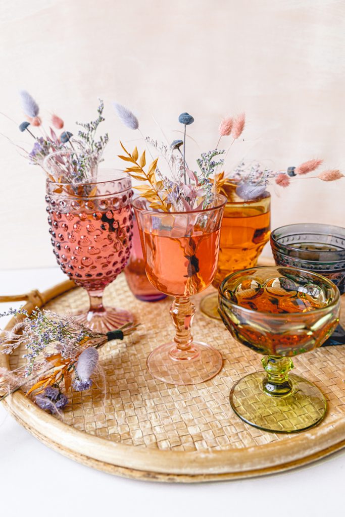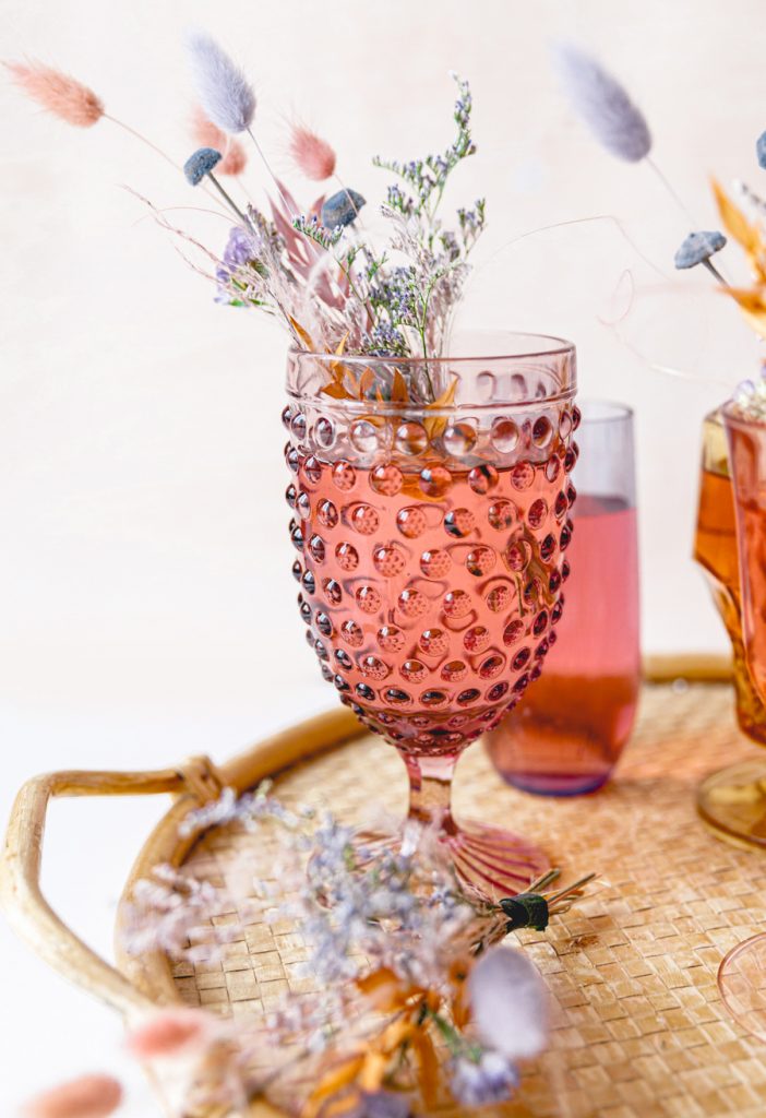 Dressing up your cocktails is just as important as the cocktail itself, especially for holidays like St. Patrick’s Day. We love everything rainbow, and this pastel-colored dried floral bundle makes this simple cocktail the belle of the ball. Dried floral arrangements are definitely something we are swooning over these past months. Not only are they really pretty to look at, but you can use them again and again. Today, we are using the rainbow pastel-themed arrangement by Wild Botanicals. Jacquelyn and I were saying how much we love this color combo of lilac, pinks, mustards, and blues.