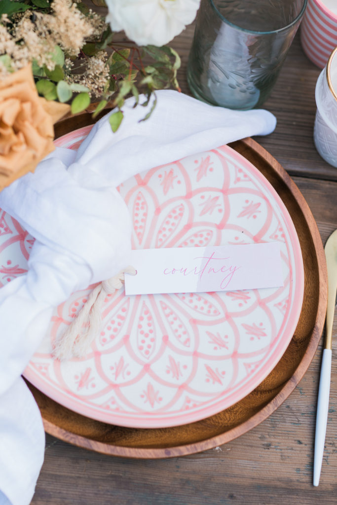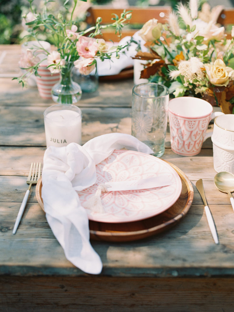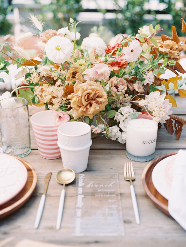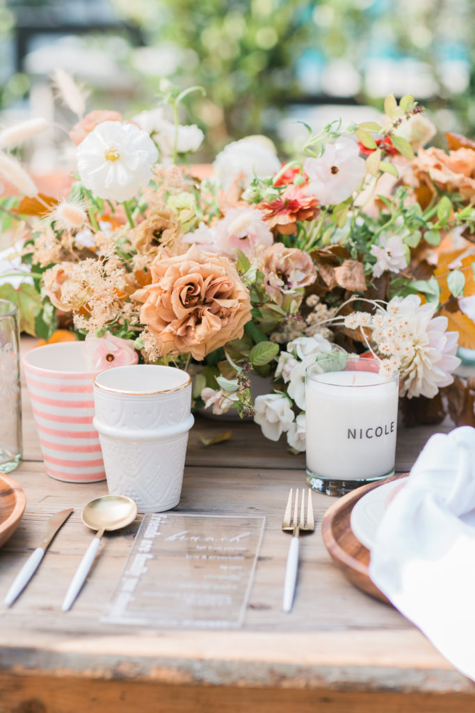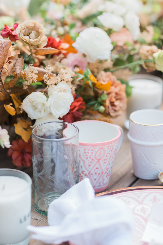 The table was set outside because when you live in Southern California you can do that! Especially when you have a pretty spot like this. I used The Little Market’s beautiful tabletop items to set the table and it was adorned with pretty Fall flowers by Third & Park.
