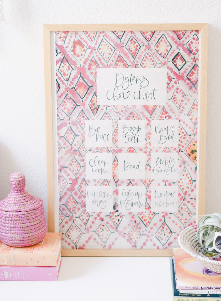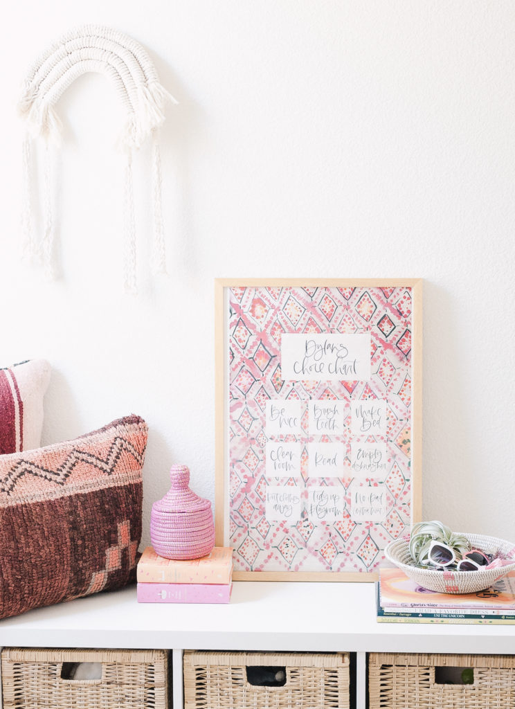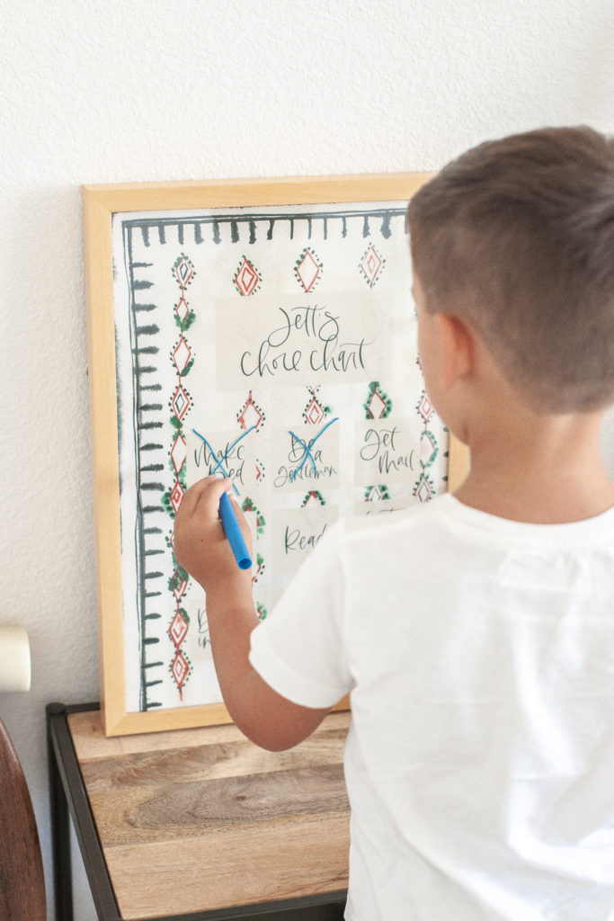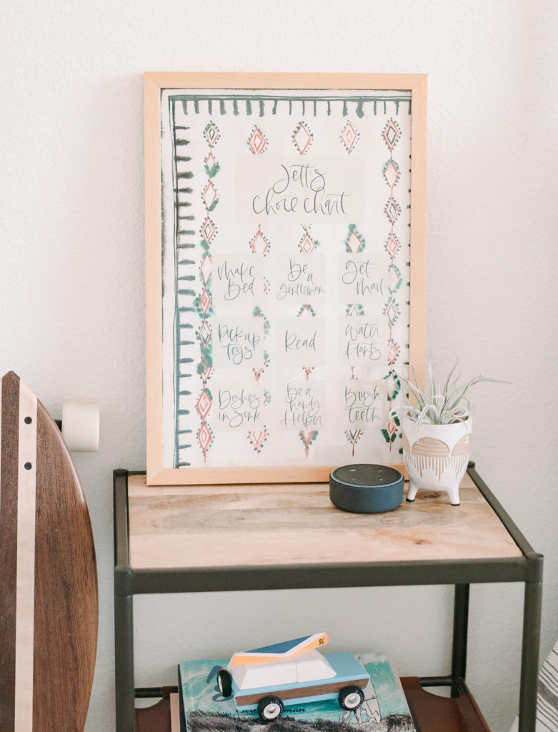 When I started to think of how I wanted to do this chore chart, my designer mind always went straight to the look vs. functionality. I searched Etsy for some fun art prints to use as a background. I then found a fun idea off Pinterest about framed chore charts and using tic tac toe as a way to encourage kids to complete their chores. I put my stamp on it, and we have one cute chore chart that also is an art piece in the kid’s room. Look and functionality for the win!