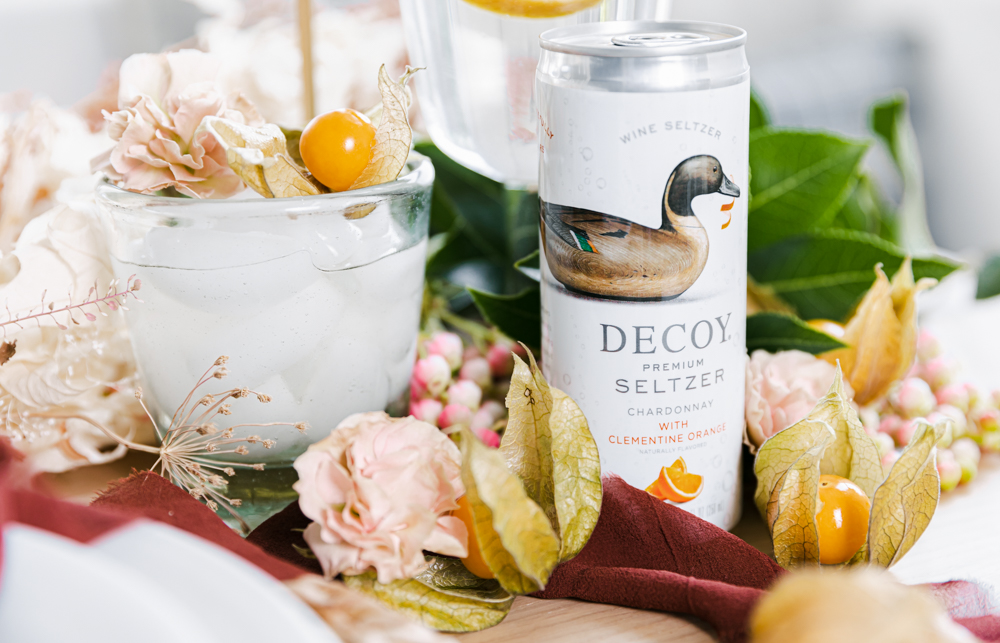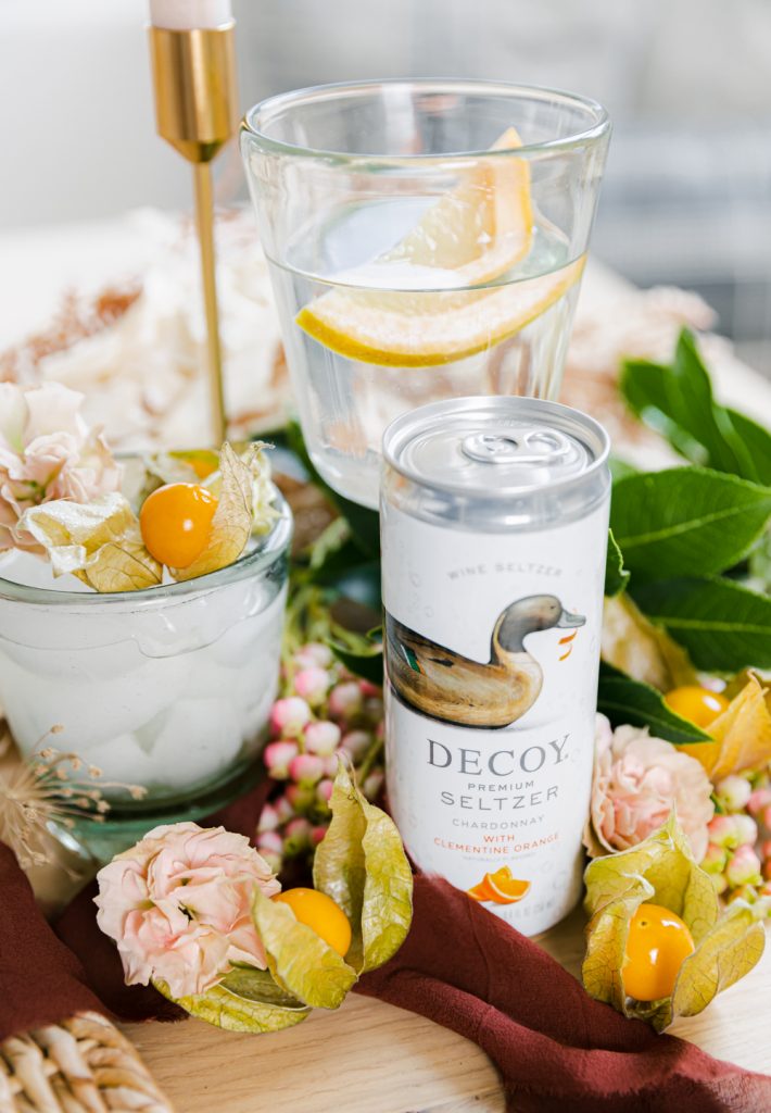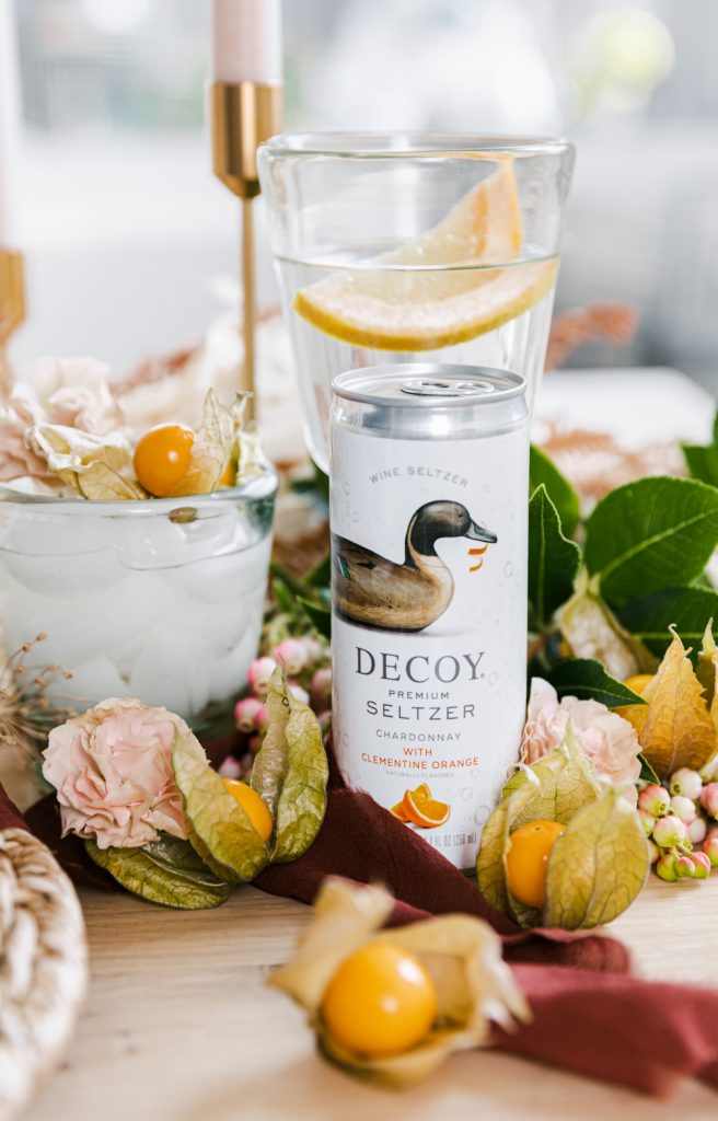 Are you looking for an easy cocktail to serve up at your next Friendsgiving? Well, here you go! Decoy wines from has come out with a new seltzer line, and we love it! It is made with their wines, sparkling water, and tantalizing fruit flavor; this refined and refreshing wine seltzer is perfect when you want something light, bubbly, and delicious. Now, you definitely can serve up on its own, but I wanted to add a little twist to it by adding some golden berries into the mix. I picked the chardonnay with clementine orange to compliment the golden berries.