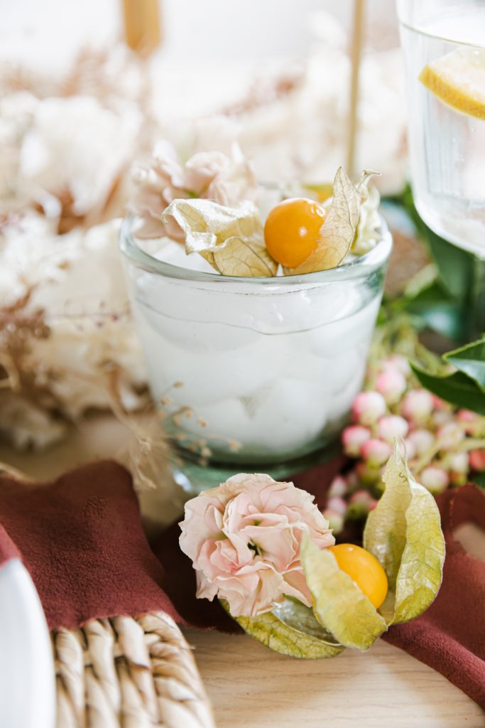 Super easy here, guys! I like to add ice, but you can omit it if you want. Fill your glass with ice. Add in a shot glass of fresh orange juice. Fresh is key here; it pairs lovely with the chardonnay. Fill the rest of the glass with the seltzer. I like to add a little bowl of husked golden berries next to each person’s plate to add to their drink. It’s super yummy to eat them right out of your drink; think of it as a cherry garnish! Top with the golden berries, and you are ready to serve up!