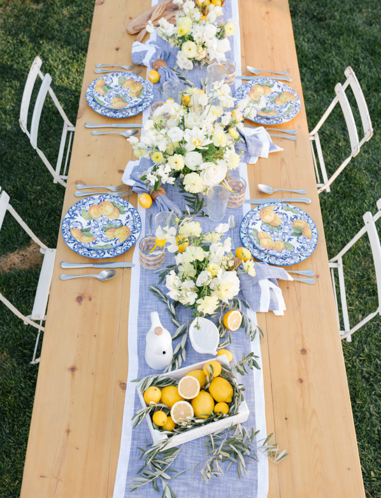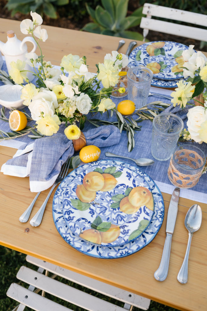 Today’s tablescape is making me feel like taking a trip to the Mediterranean! Sur La Table recently launched their Limone Collection and it was love at first sight for me. Growing up my family always used beautiful blue and white ceramics, coming from Portugal they are very common there. Add in the yellow from the lemon and it’s basically the perfect combination!