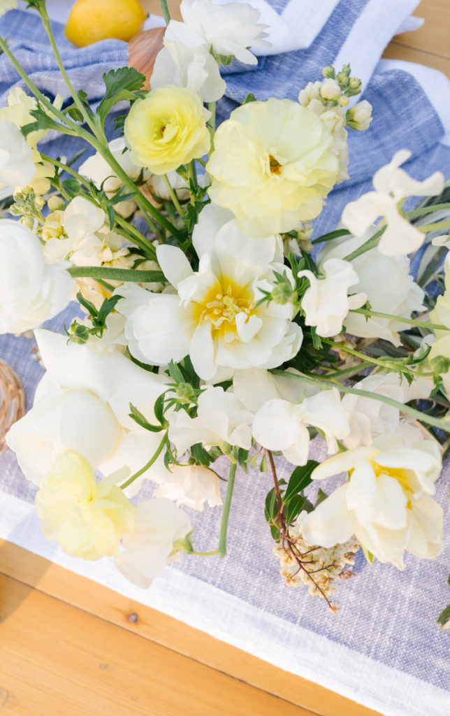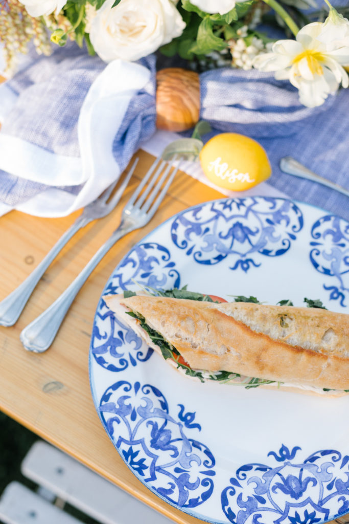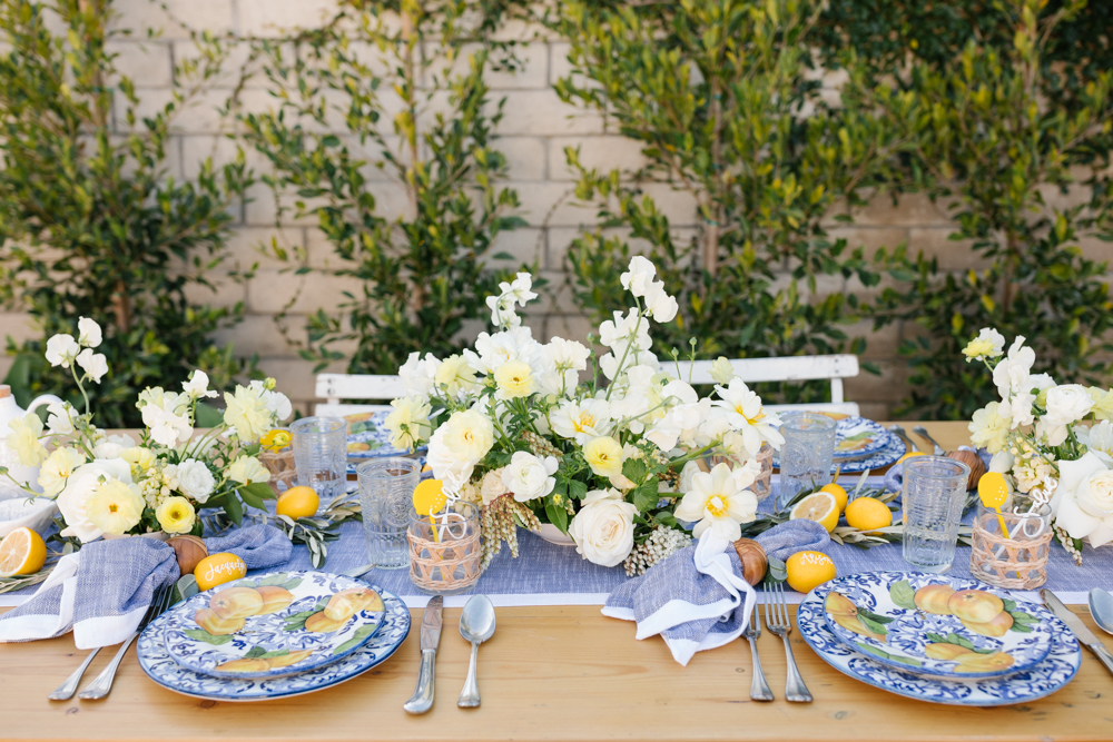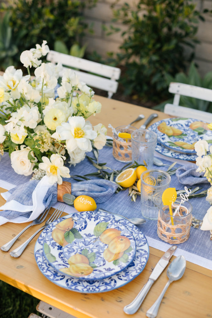 When designing a table that has a plate and salad plate with a bold print, keep everything else pretty simple. For the rest of the decor on the table we went with flowers in whites and yellow, greenery and lemons. It goes with the plate but doesn’t fight with it or over power it. That way the beautiful print stands out and is the star of the party!