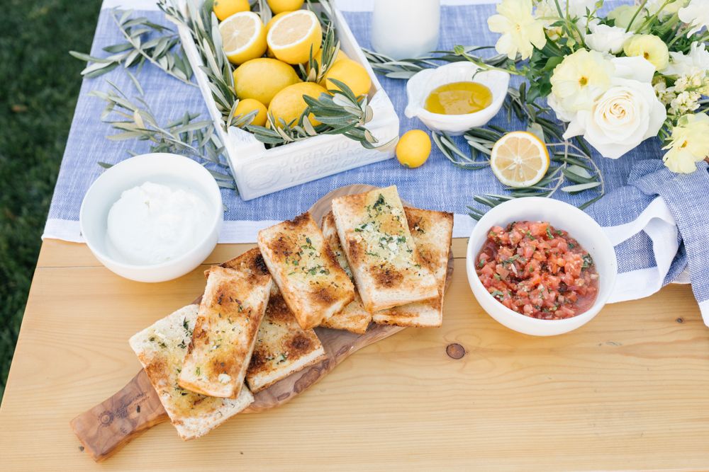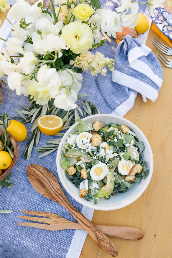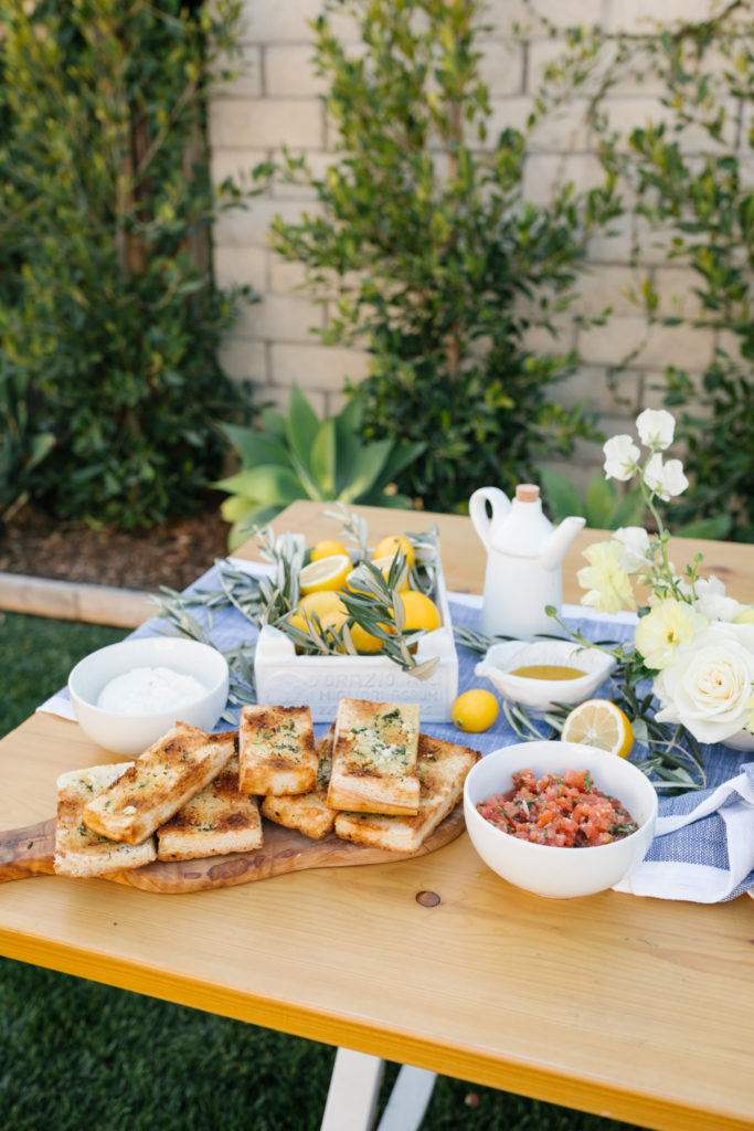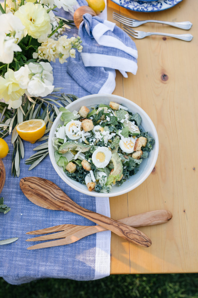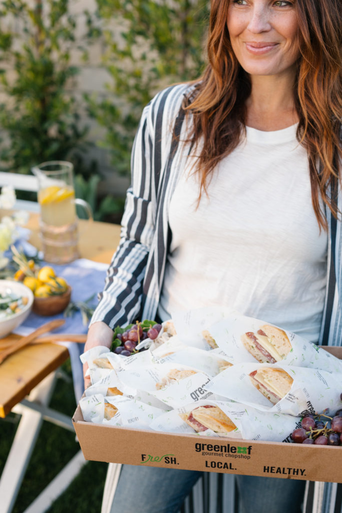 Restaurants are a great option instead! You can pick up a few catering items and serve at your parties. Trust me, it really takes the stress off. One of my favorites is Green Leaf Chop Shop because everything they make is fresh and healthy but also pretty! For this backyard party I got Caesar salad, a Crostini Platter and their Baguette Box.