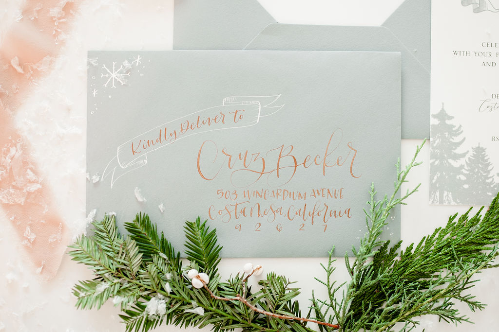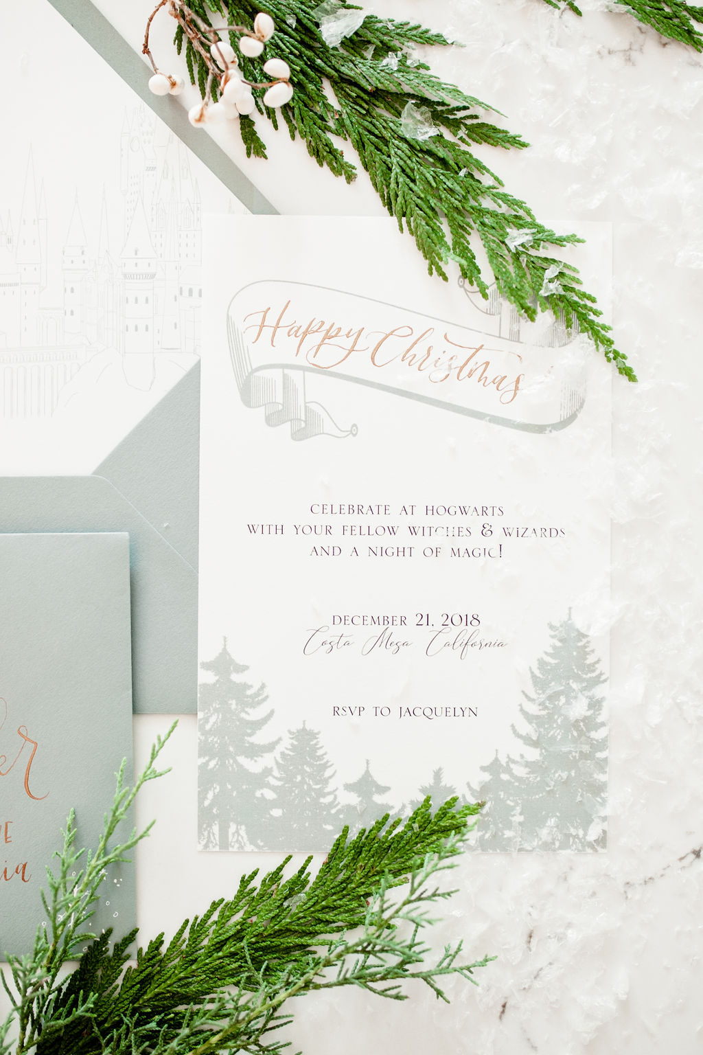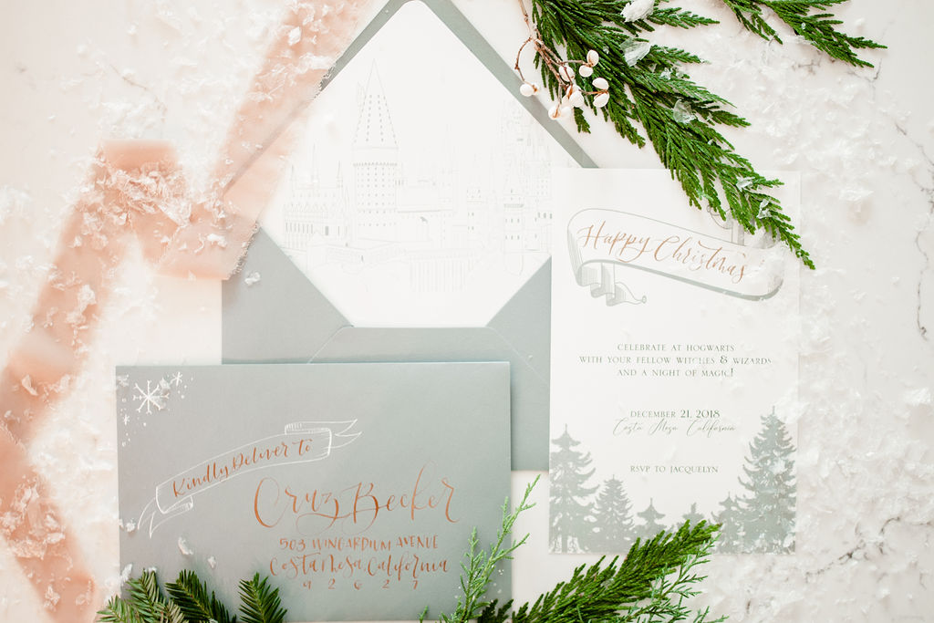 For all paper goods and calligraphy I turned to the Harry Potter aficionado herself, Andrea from Calligraphy Nerd! We have worked with Andrea before and I knew she was obsessed with Harry Potter like me so I had to ask her to jump in on this one! She of course came through with the most amazing details for this shoot, including this invite!! Isn’t it amazing?! She captured the Harry Potter holiday essence so well!