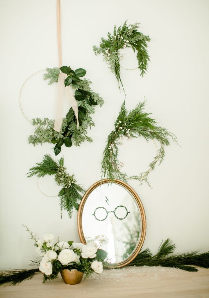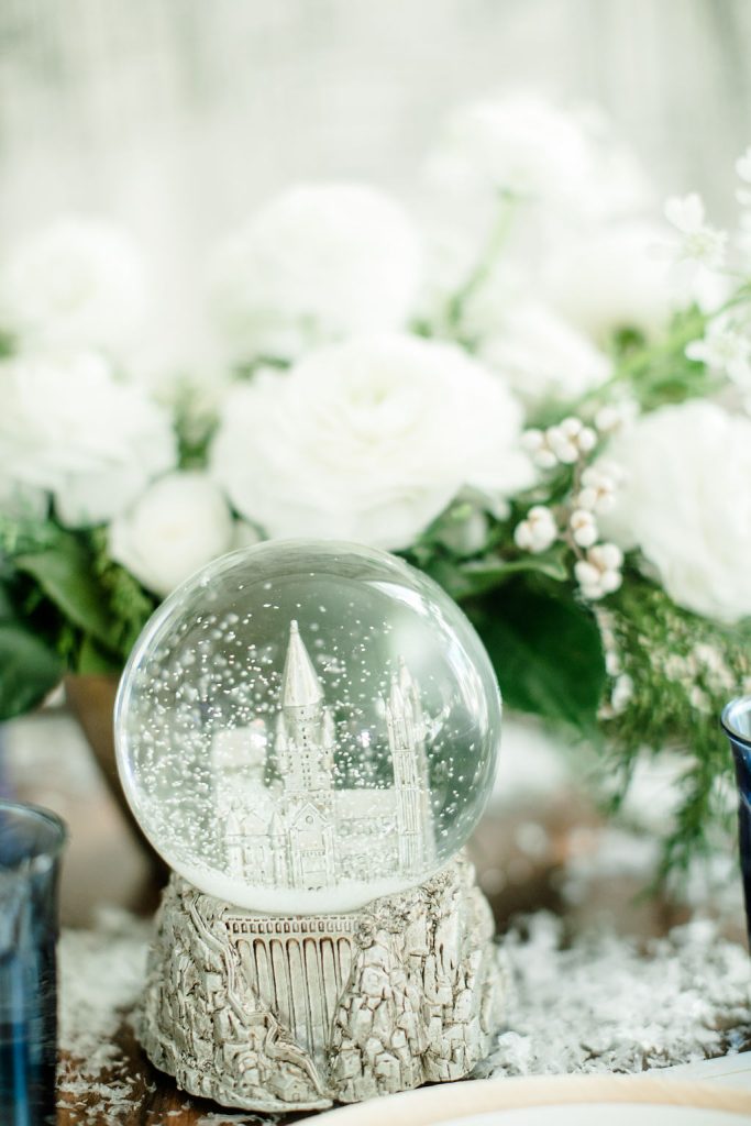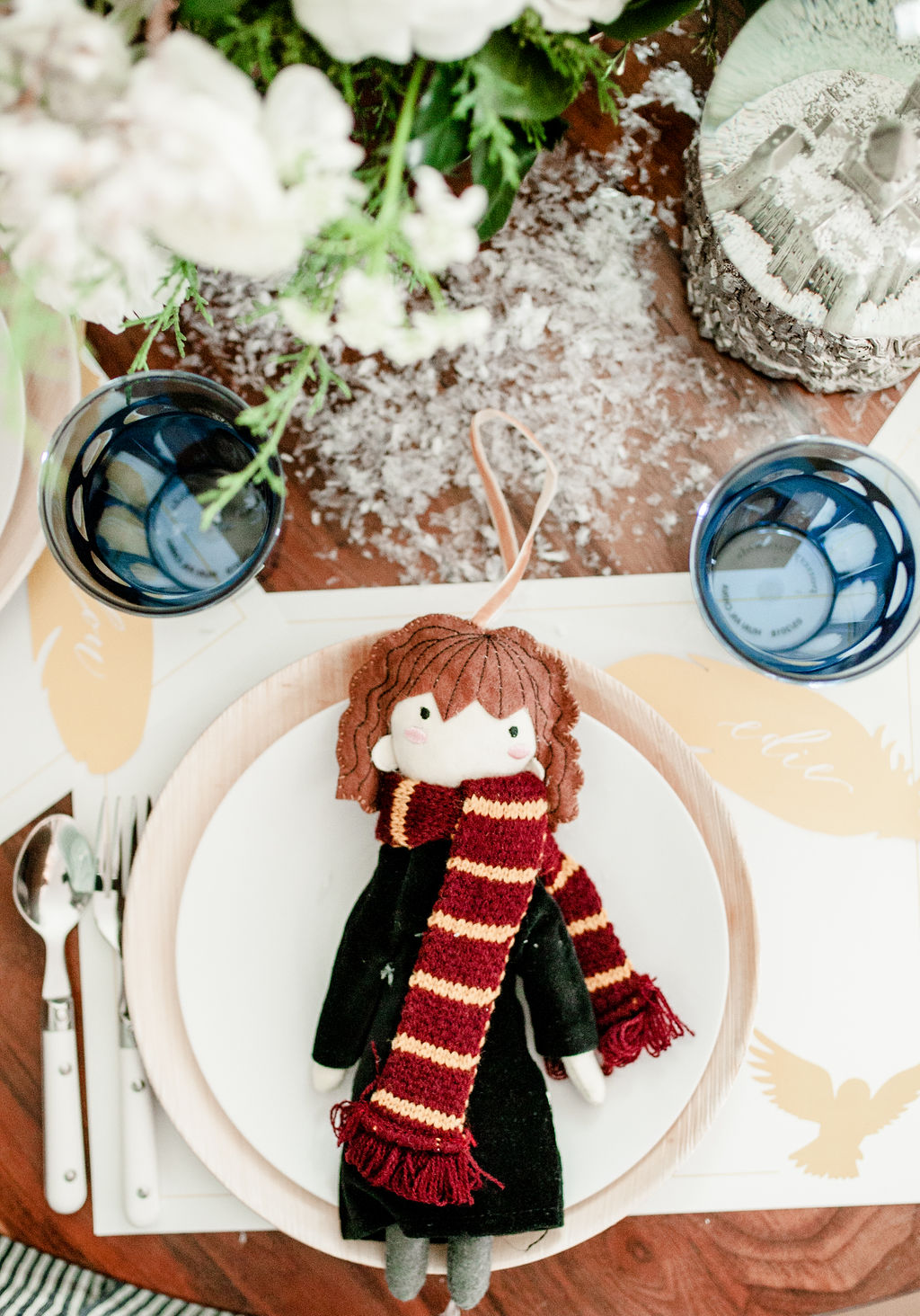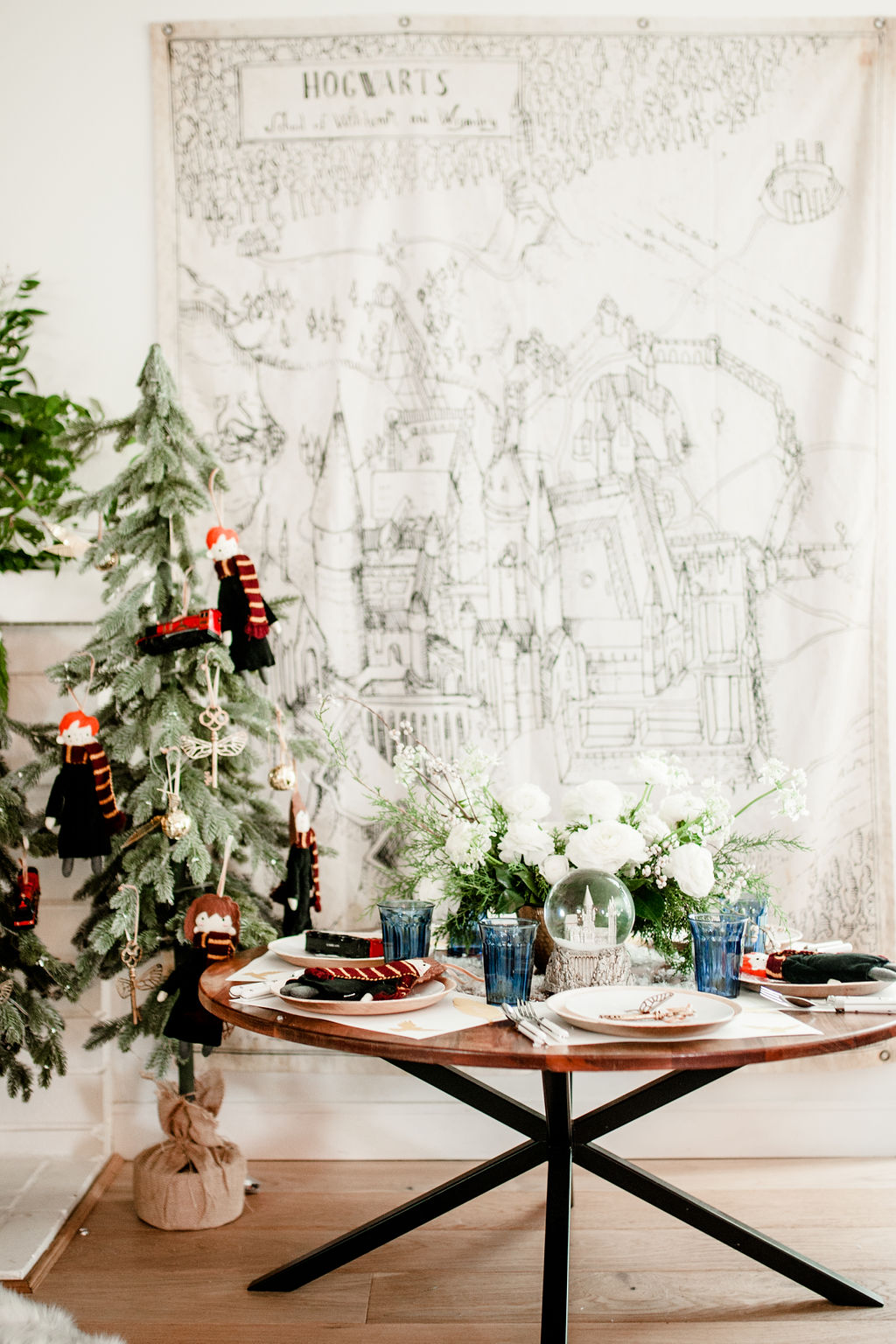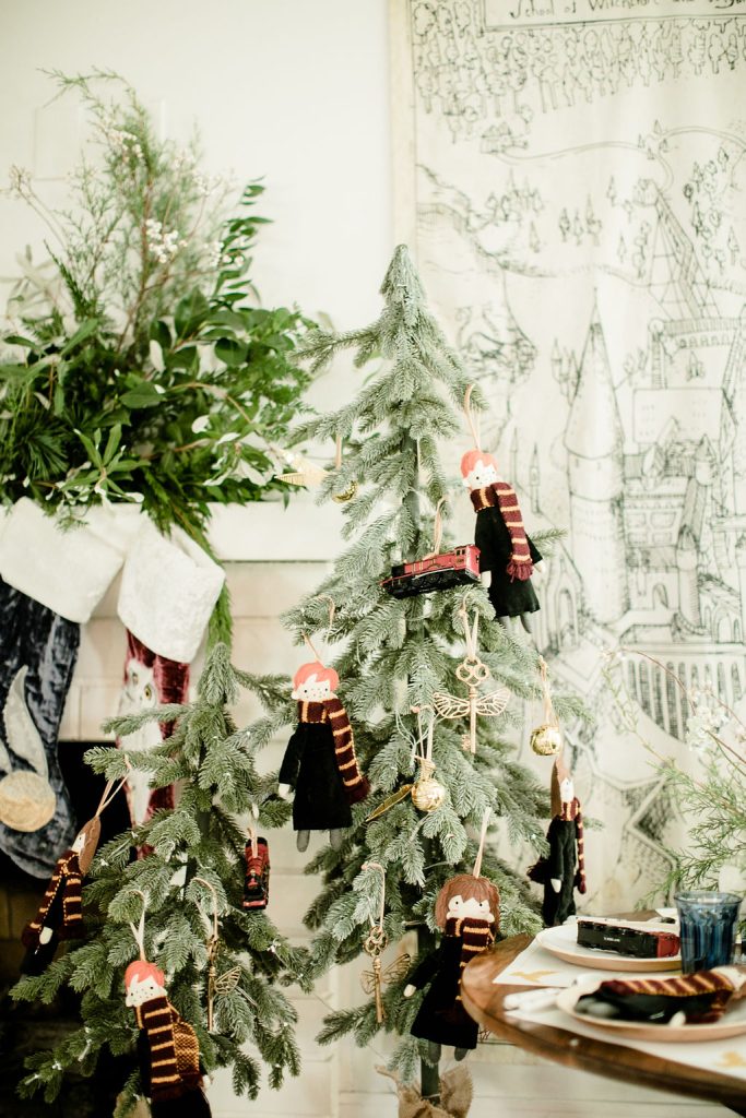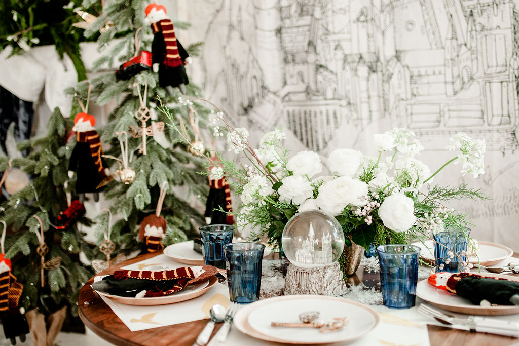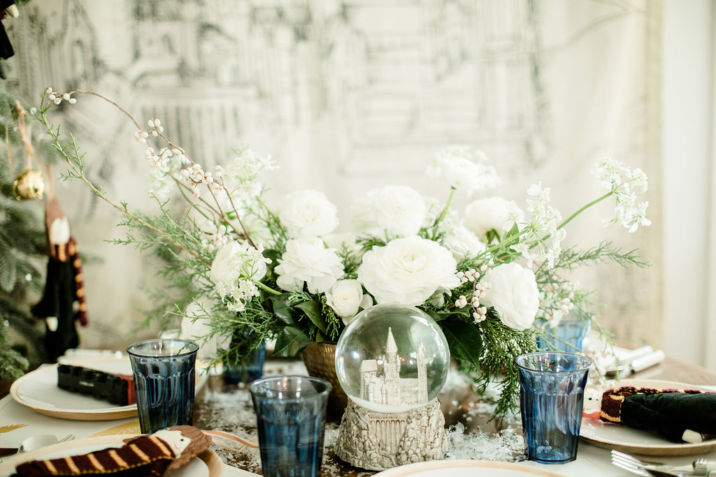 The gorgeous florals are by our friend Alex from Third & Park she nailed those winter whites and greens right?! Pottery Barn Kids has such fun ornaments all Harry Potter inspired – Harry, Hermione, Ron, the golden snitch and so much more!! And how pretty is that snow globe with Hogwarts? So magical!! I just added a little bit of fake snow to make it even more so!