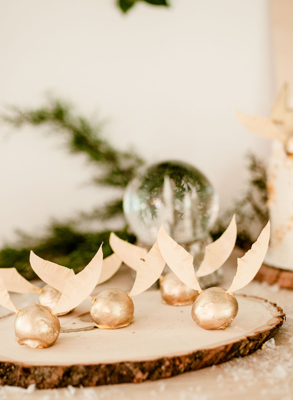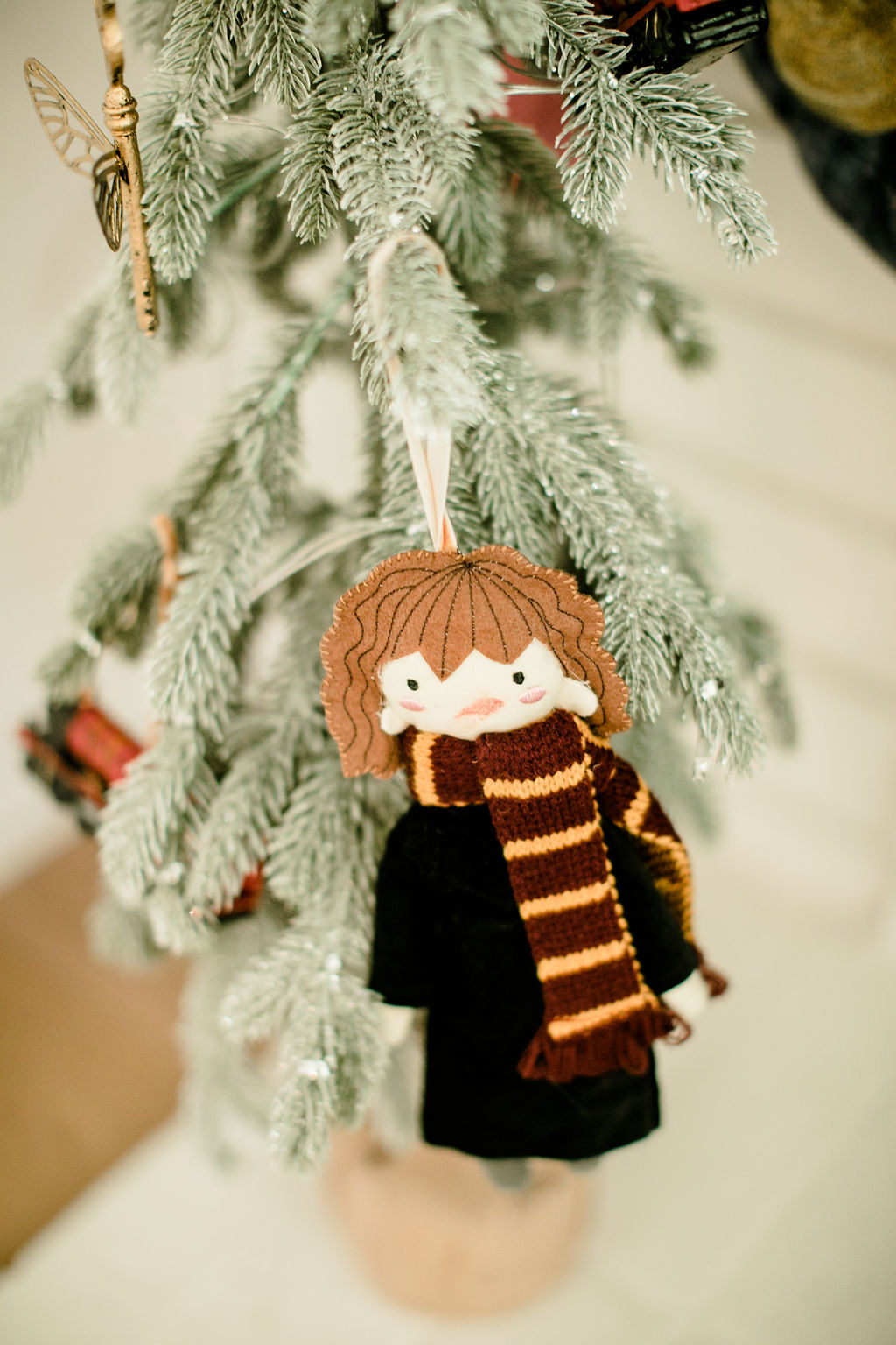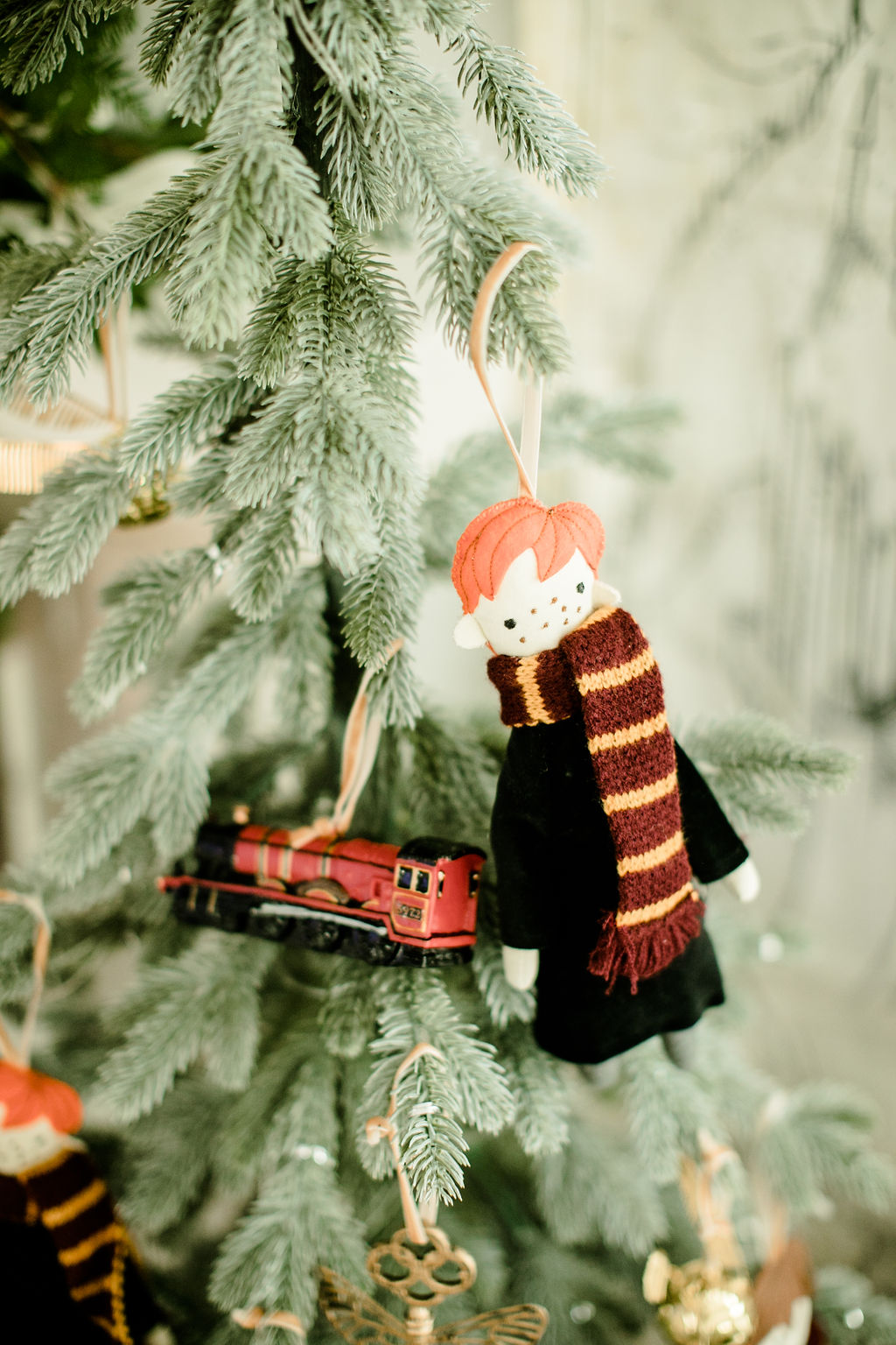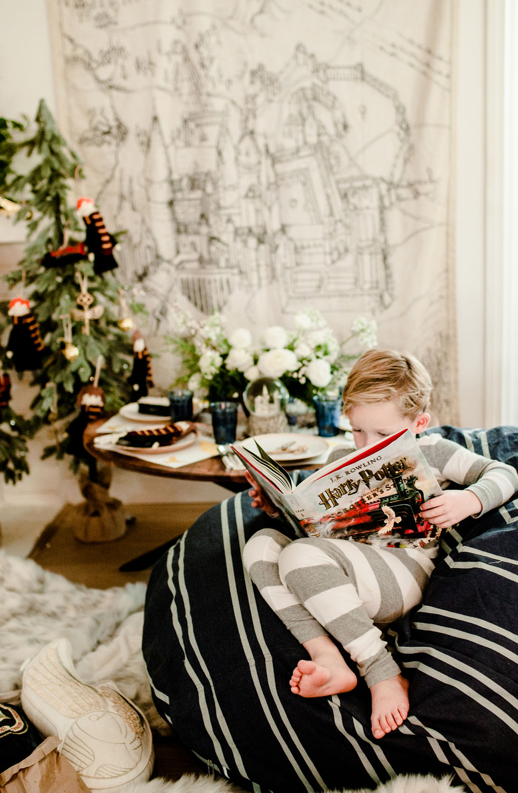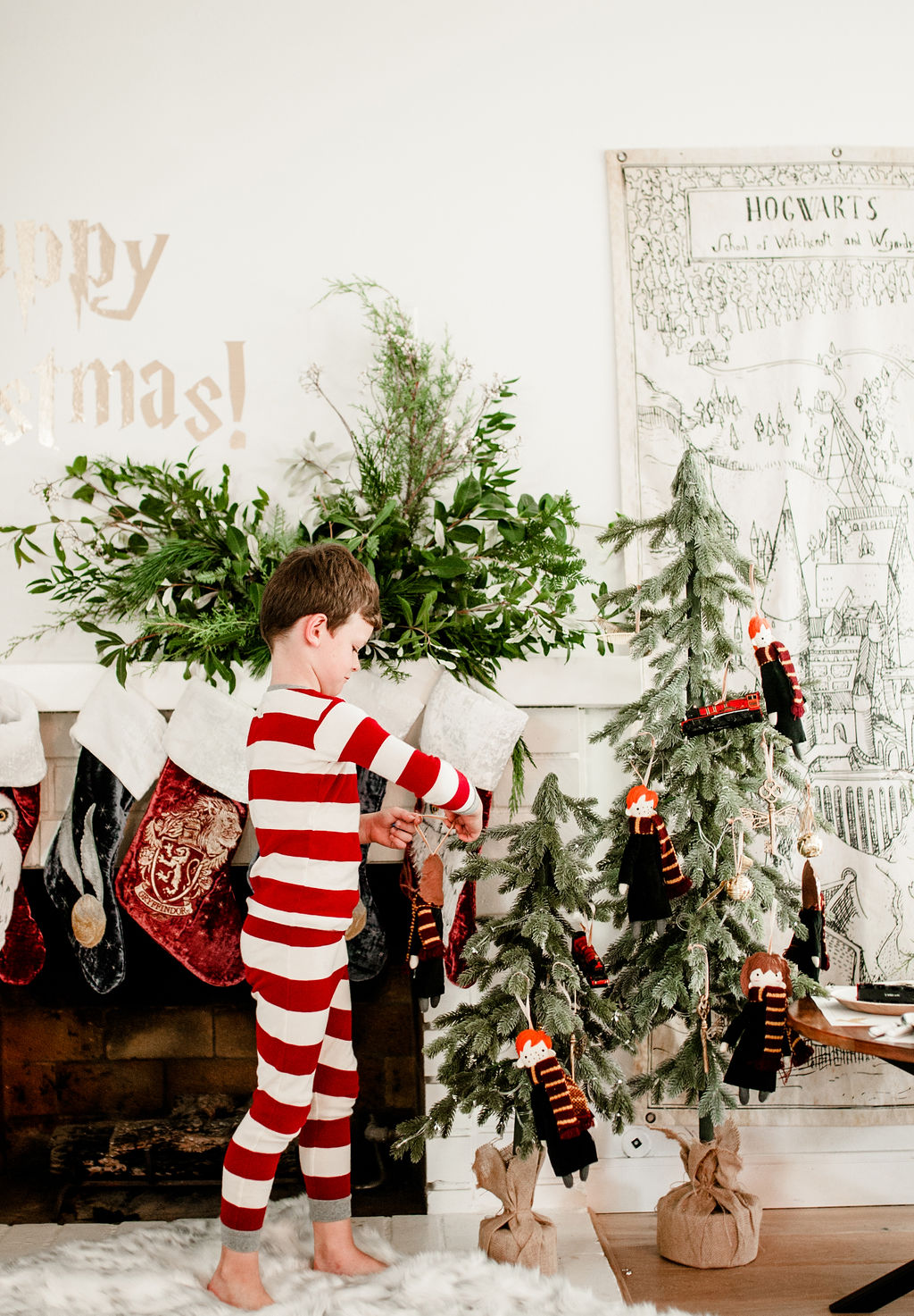 The gorgeous florals are by our friend Alex from Third & Park she nailed those winter whites and greens right?! Pottery Barn Kids has such fun ornaments all Harry Potter inspired – Harry, Hermione, Ron, the golden snitch and so much more!! And how pretty is that snow globe with Hogwarts? So magical!! I just added a little bit of fake snow to make it even more so!