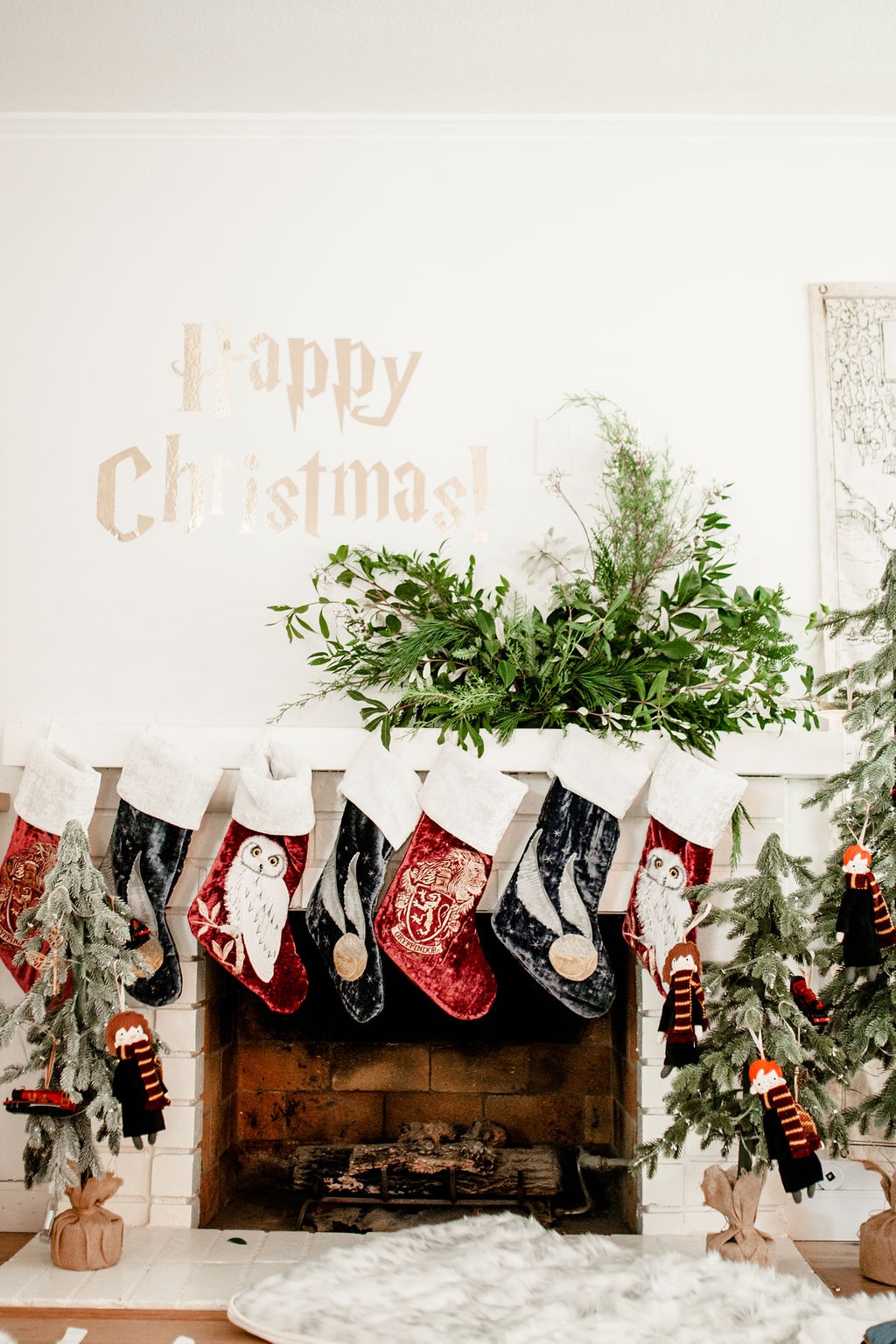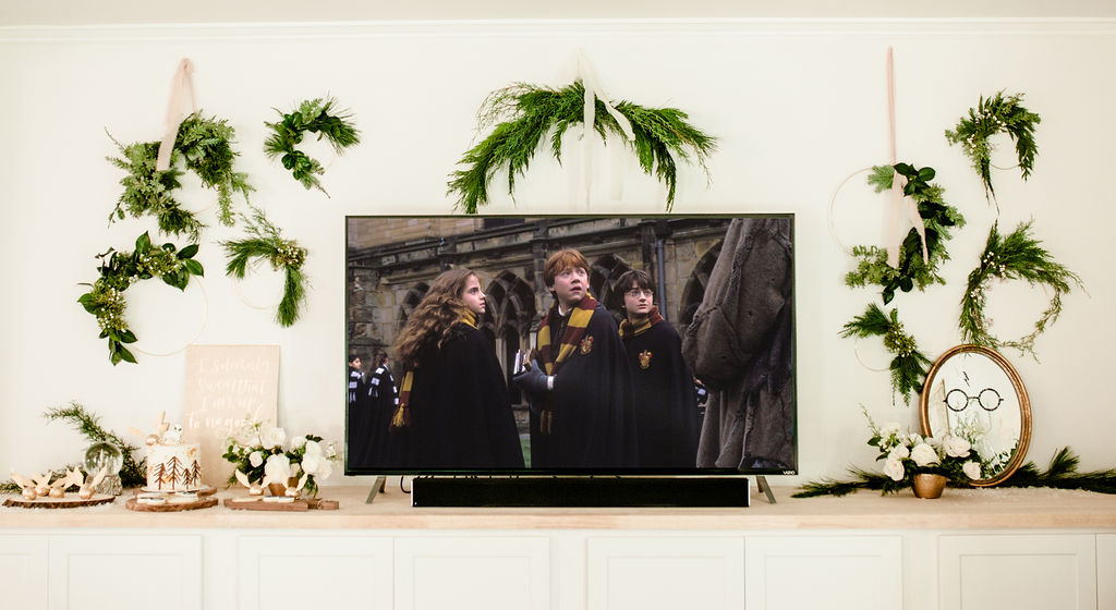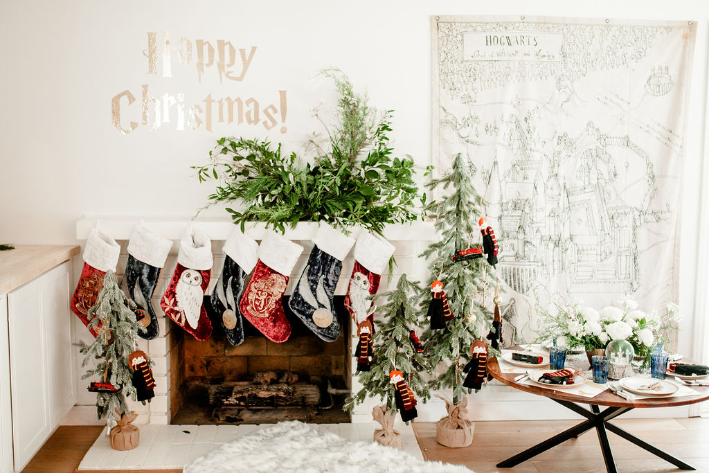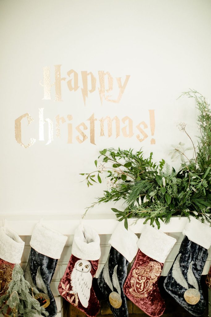 Now for my favorite part, the mantle!!! Calligraphy Nerd did the Harty Potter wording to go above the mantle and Third & Park decked it out in greens. Then we added the amazing Harry Potter stockings from Pottery Barn Kids. They are so cute and