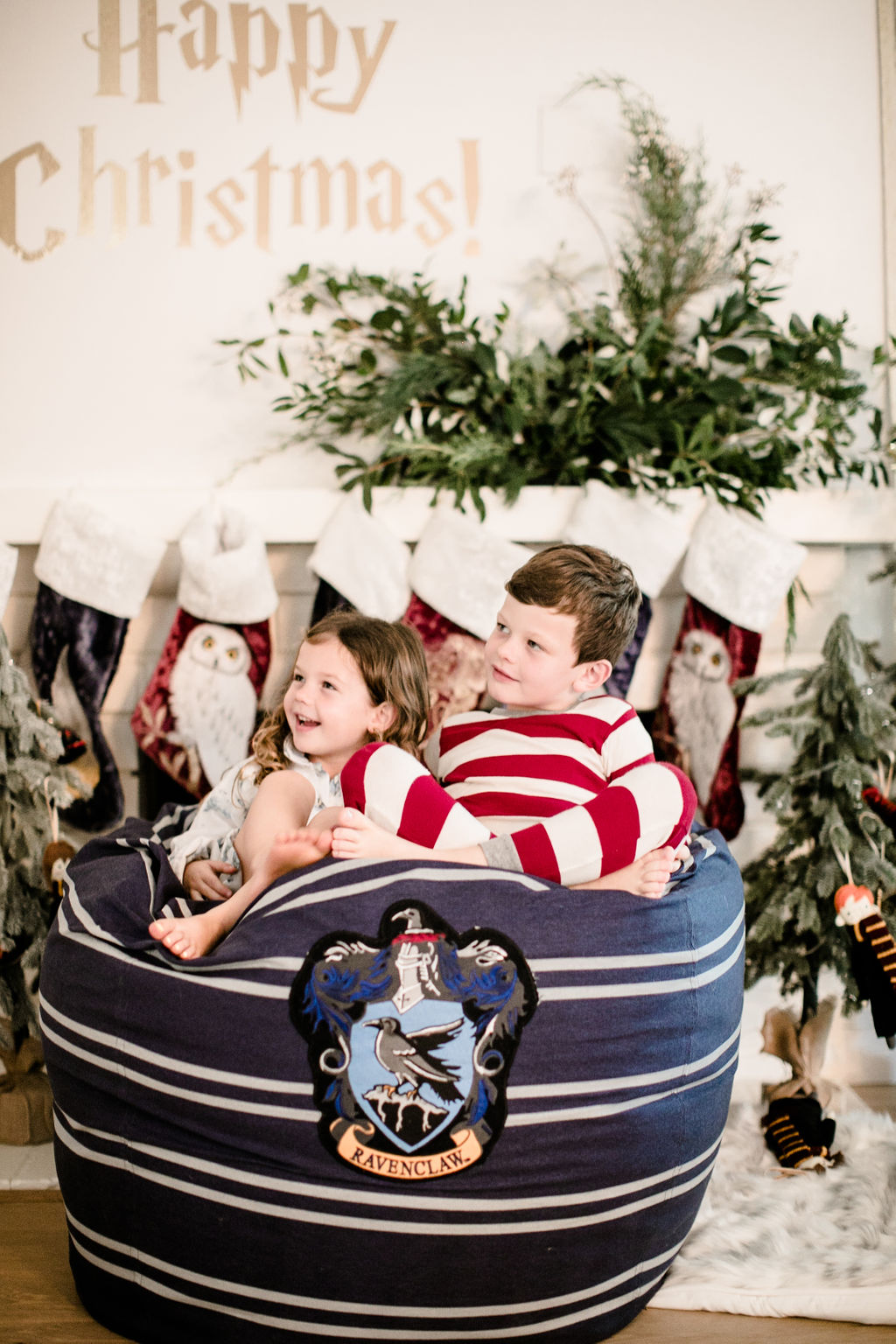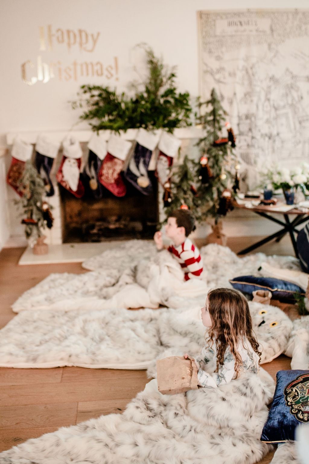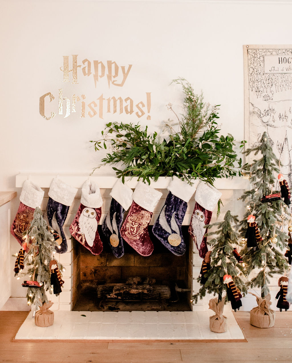 Now for my favorite part, the mantle!!! Calligraphy Nerd did the Harty Potter wording to go above the mantle and Third & Park decked it out in greens. Then we added the amazing Harry Potter stockings from Pottery Barn Kids. They are so cute and