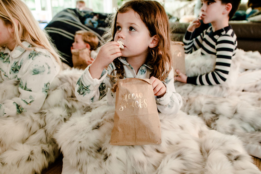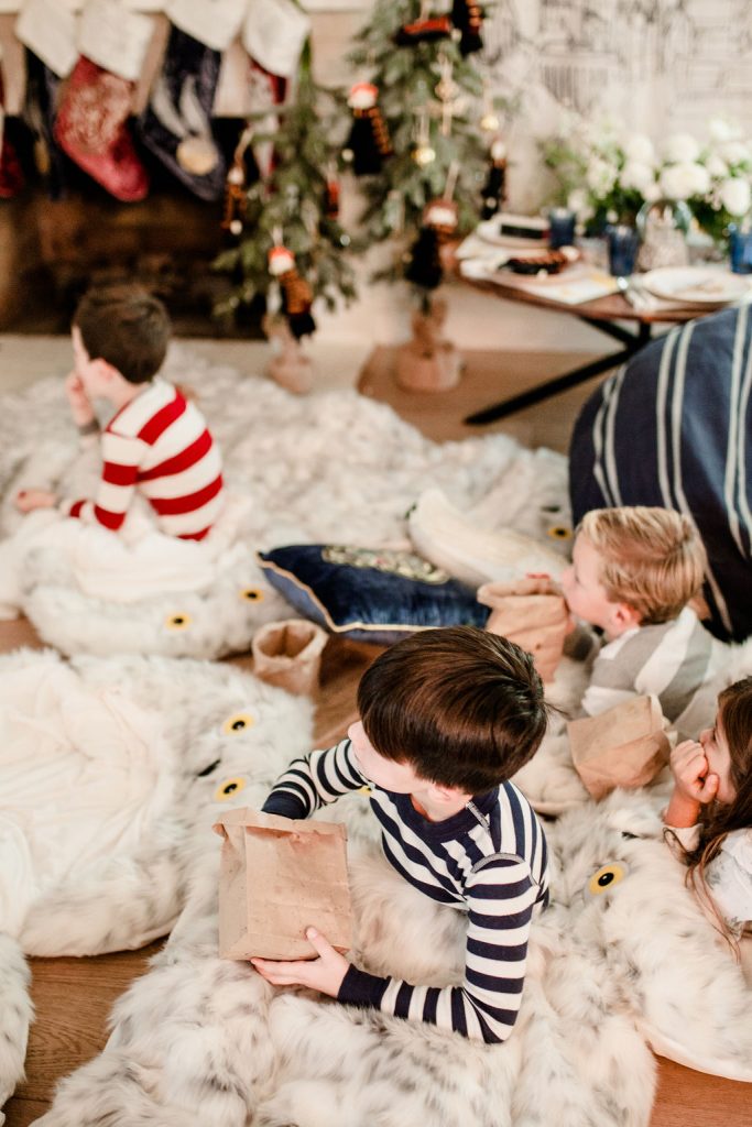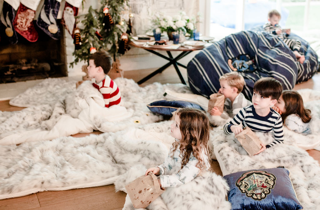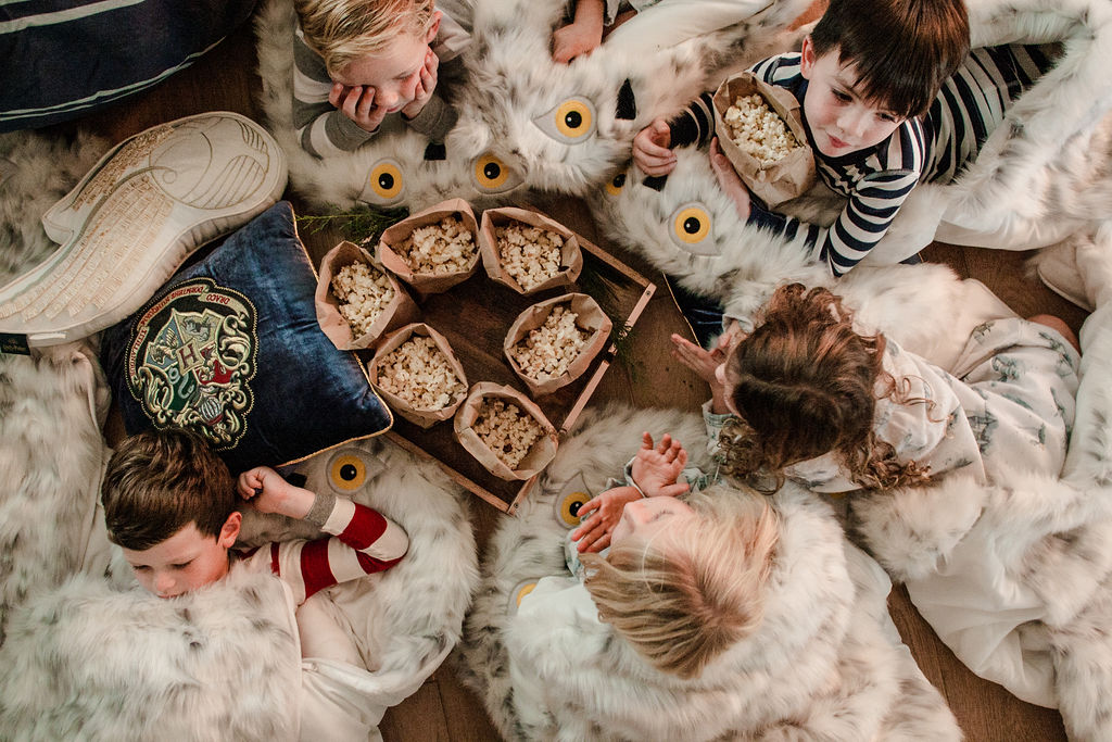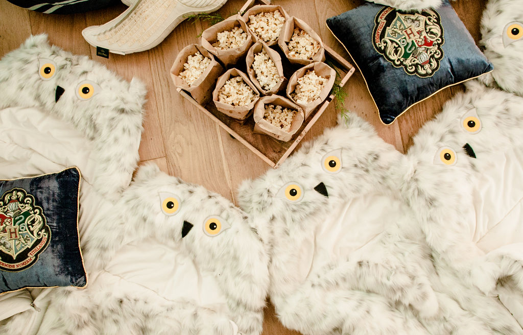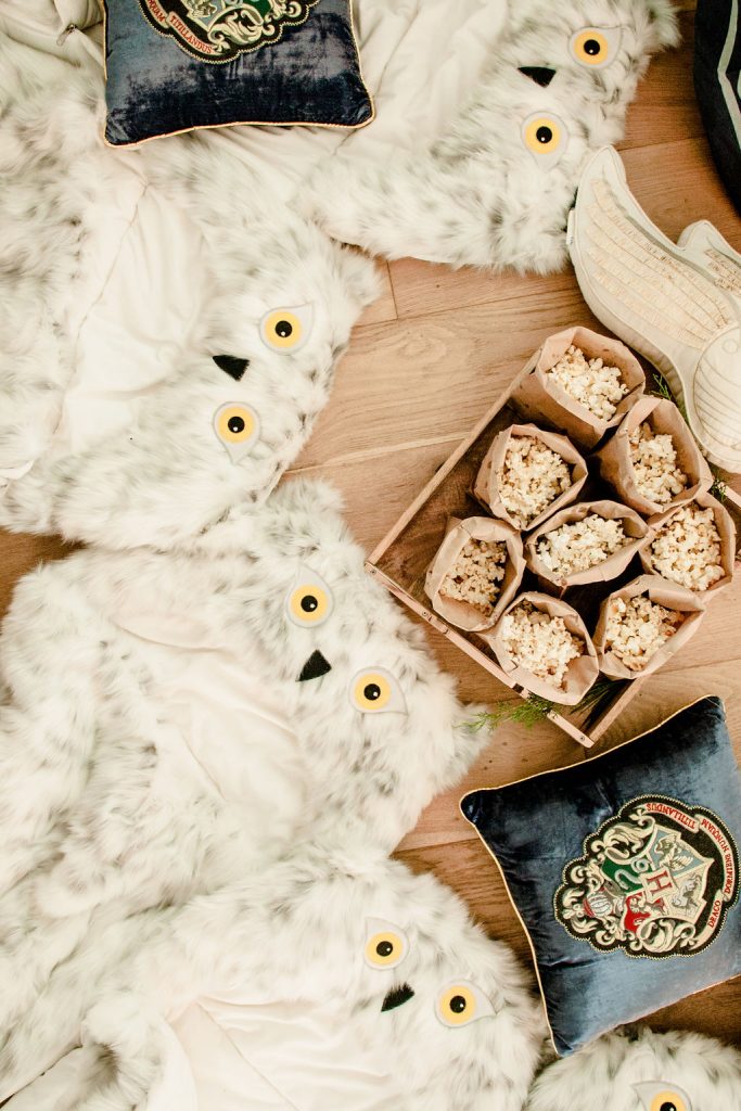 Remember when I said Hedwig would make another appearance?! Well here she is!!! These sleeping bags are AMAZING!!! So soft and cuddly, we basically had to tear my dog Dolly away because she kept wanting to lay on them, haha!! I set the sleeping bags up with pillows and popcorn for each little one, and that’s what I call the ultimate Harry Potter sleepover party!