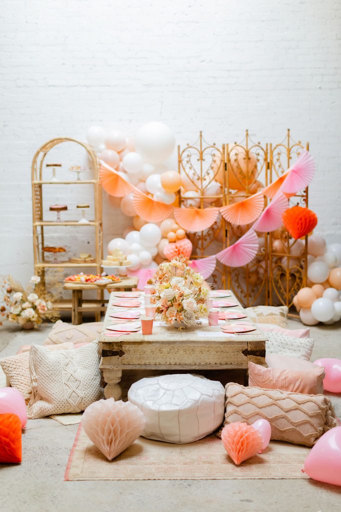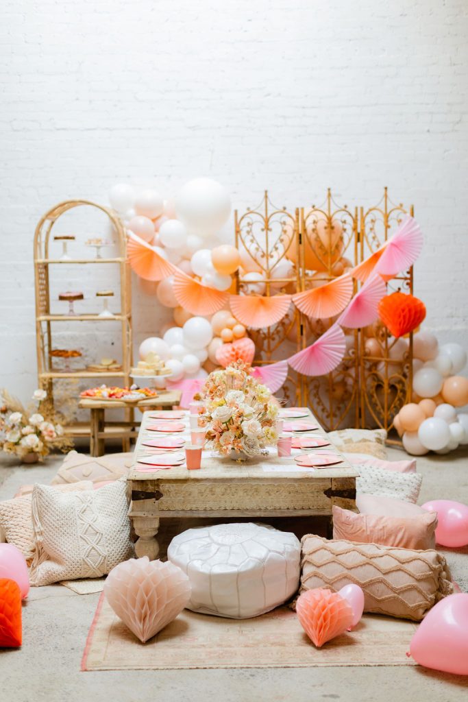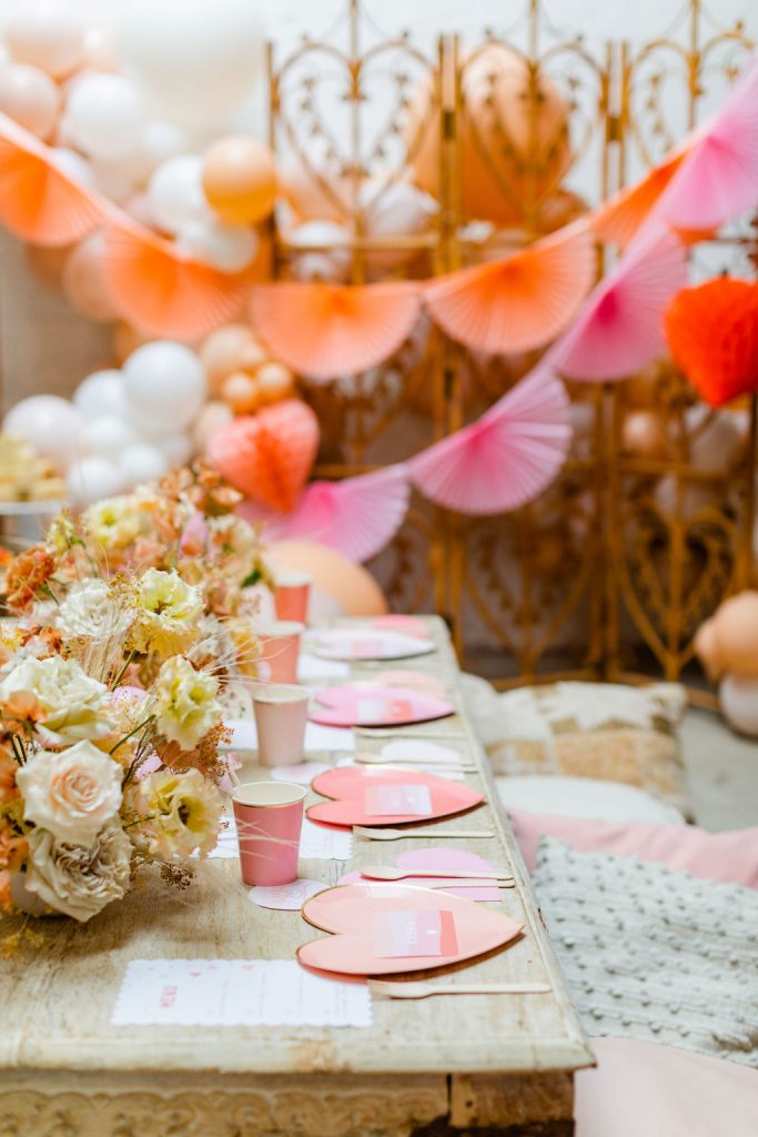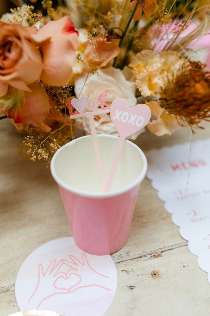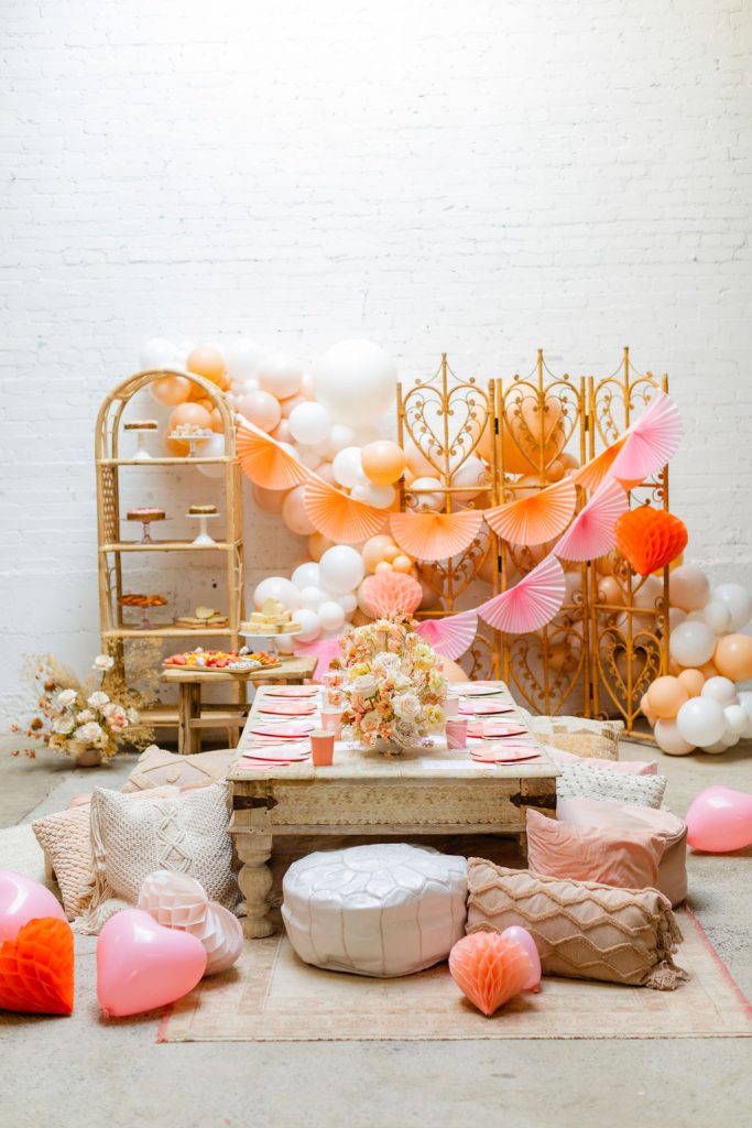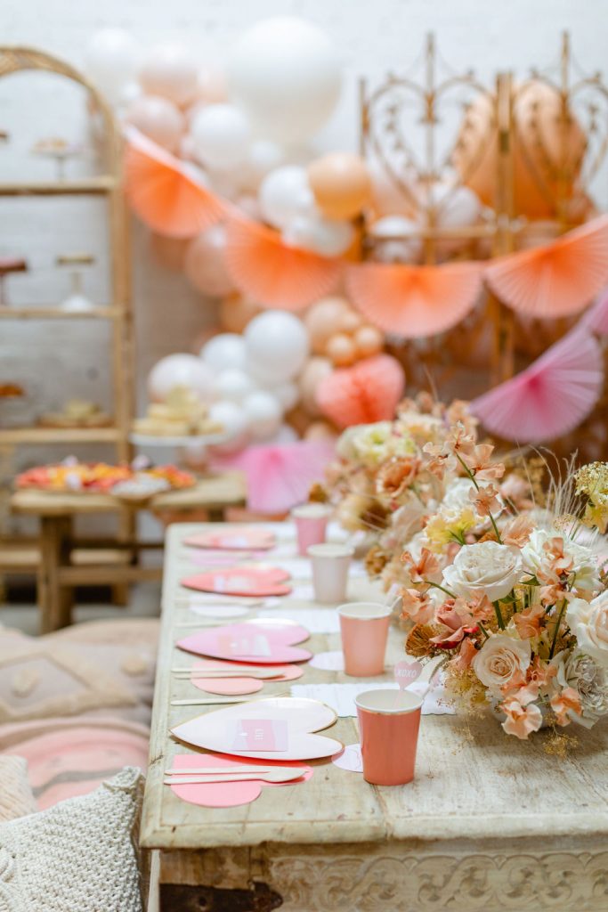 Now for this beauty of a set up! My heart is going pitter patter! I was inspired by Meri Meri’s new Valentine’s Day collection with this color scheme. That is where all of the tabletop is from and those fun heart honeycombs and banners in the backdrop. I started with that and then enlisted my team of super starts to make this cuteness come to life. The Pop Shop is responsible for the amazing balloons and Sweet Salvage Rentals went ahead and brought out all the rattan – and I love her for it!!