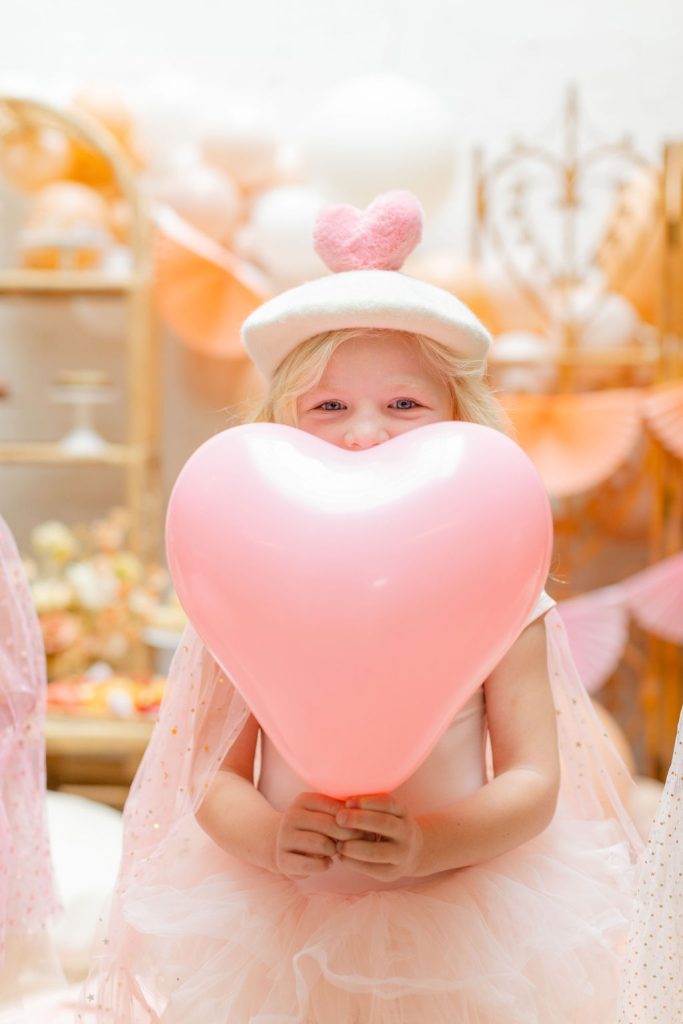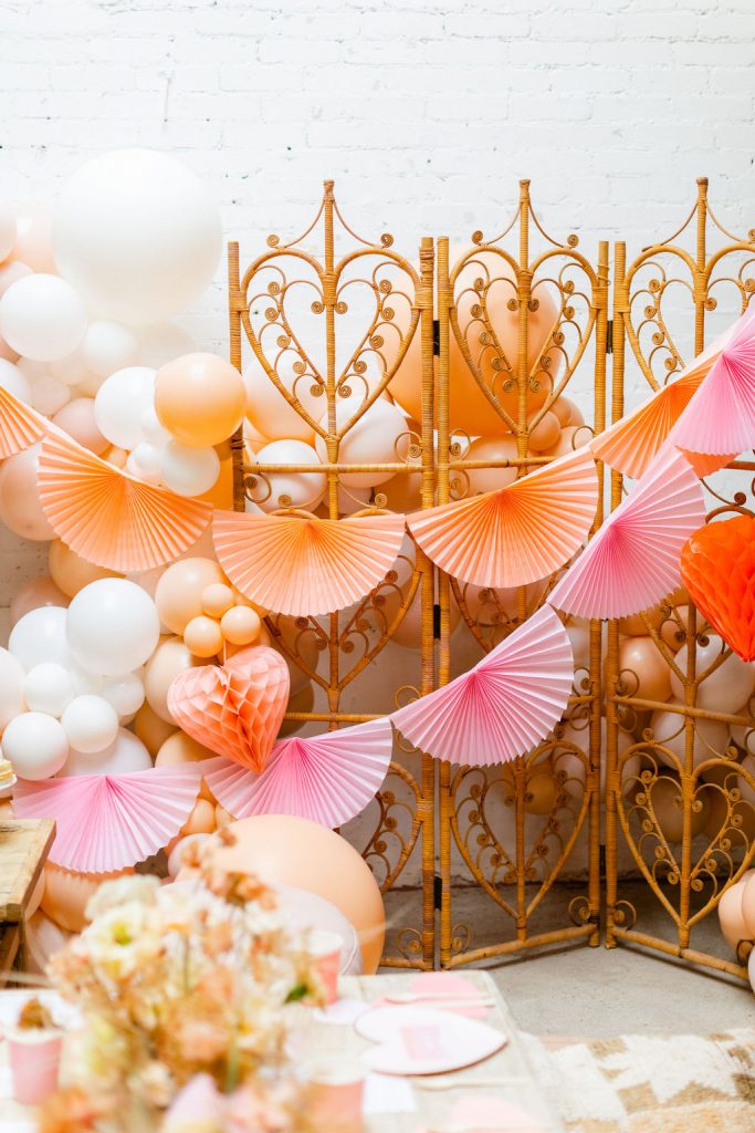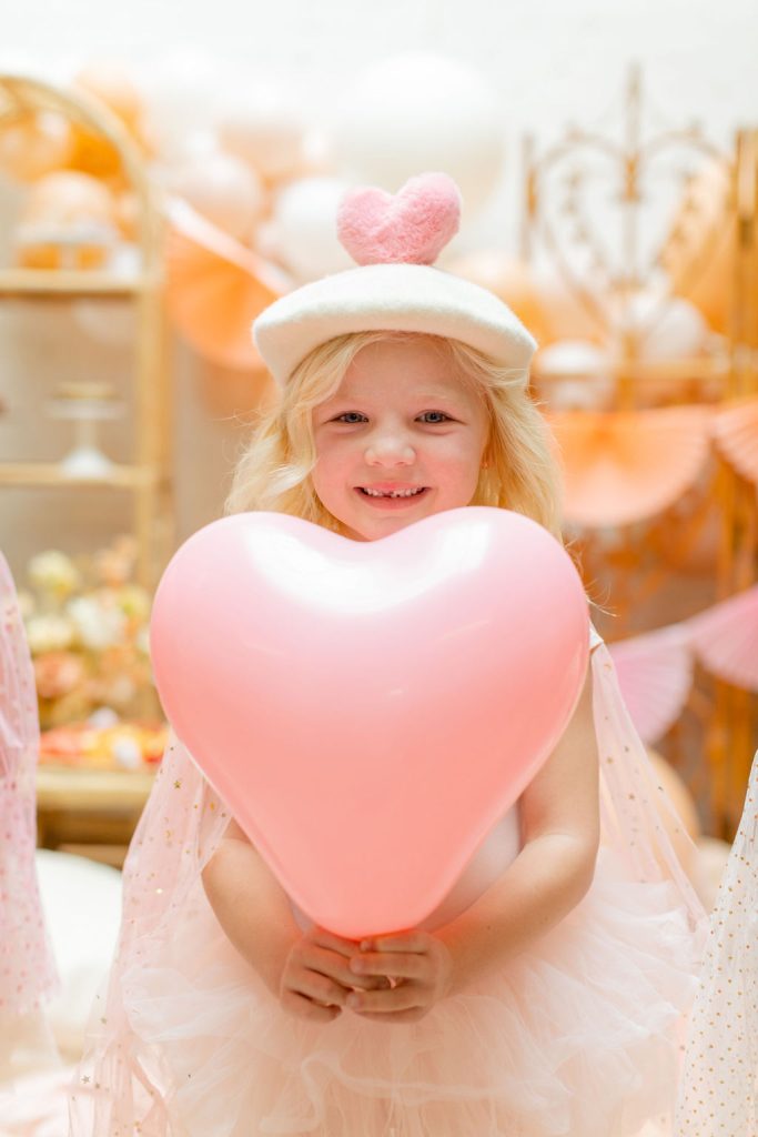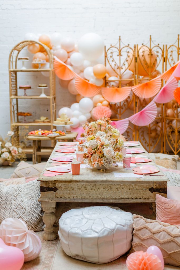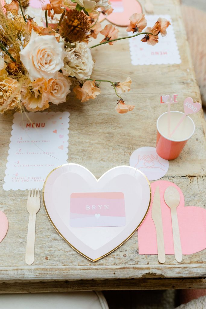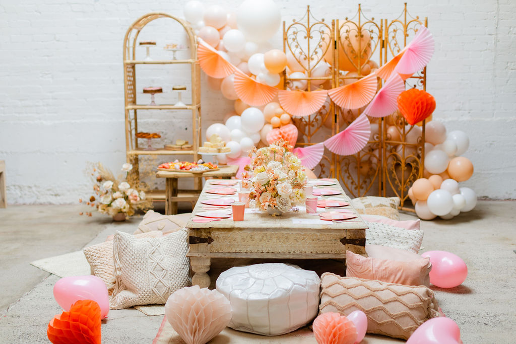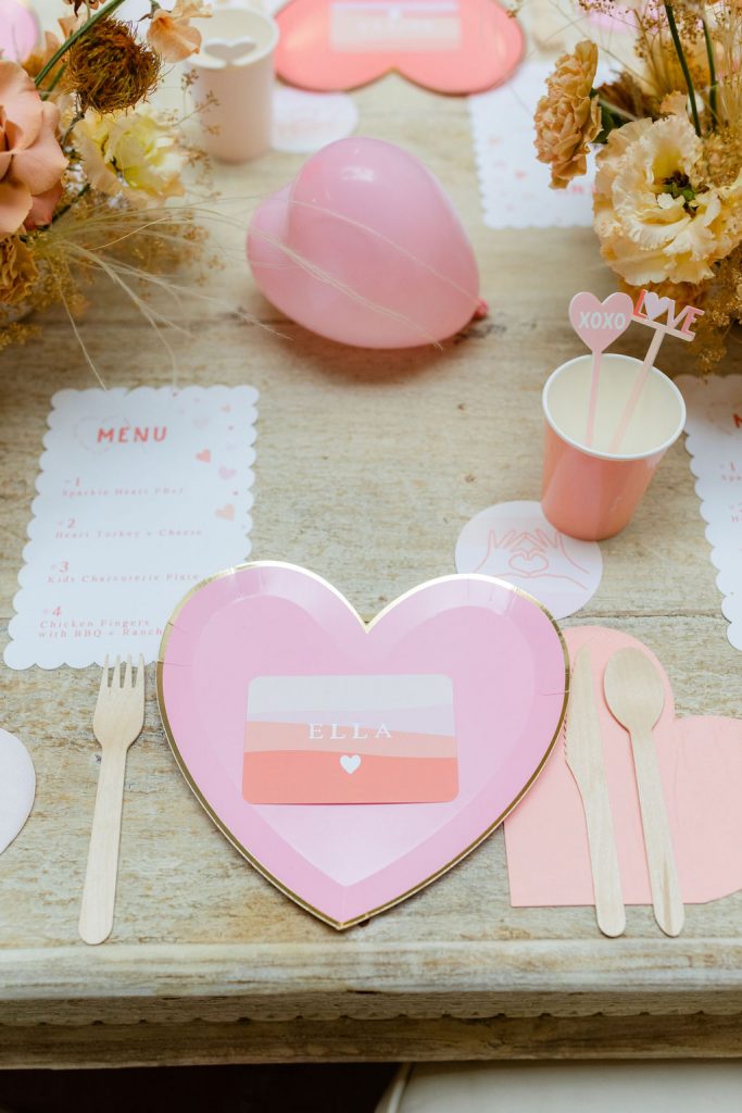 Now for this beauty of a set up! My heart is going pitter patter! I was inspired by Meri Meri’s new Valentine’s Day collection with this color scheme. That is where all of the tabletop is from and those fun heart honeycombs and banners in the backdrop. I started with that and then enlisted my team of super starts to make this cuteness come to life. The Pop Shop is responsible for the amazing balloons and Sweet Salvage Rentals went ahead and brought out all the rattan – and I love her for it!!
