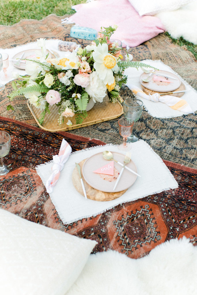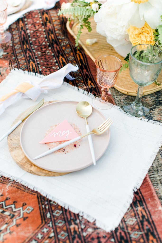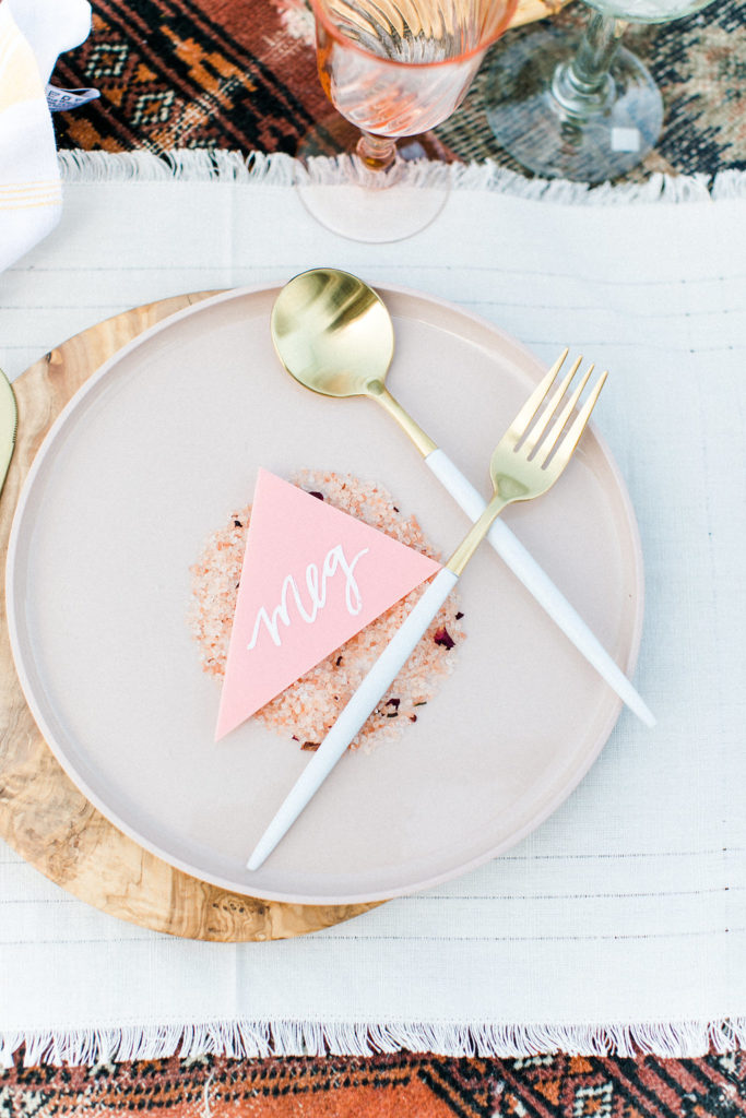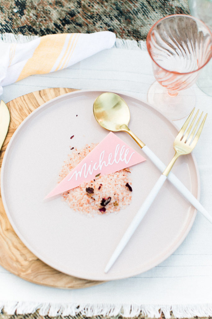 This picnic was all about relaxing and spoiling yourself. I took The Little Market’s Rose Soaking Salt and placed a little pile on each plate for the guest’s name to sit on. Each guest went home with their own bottle, can’t let the day go away without a relaxing bath!