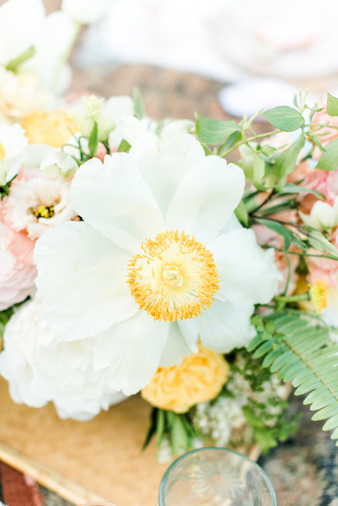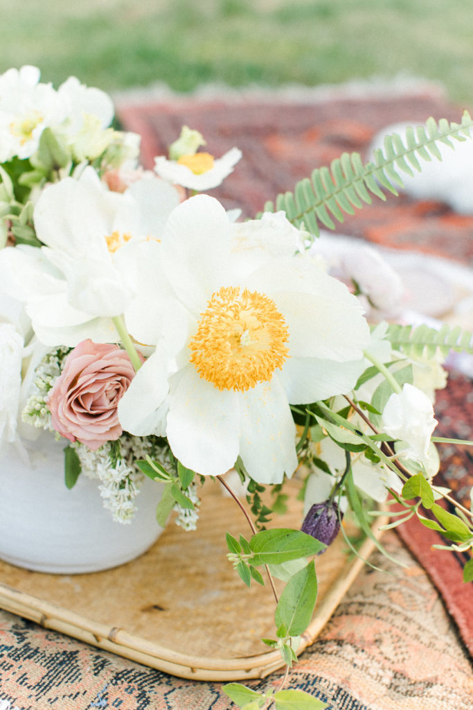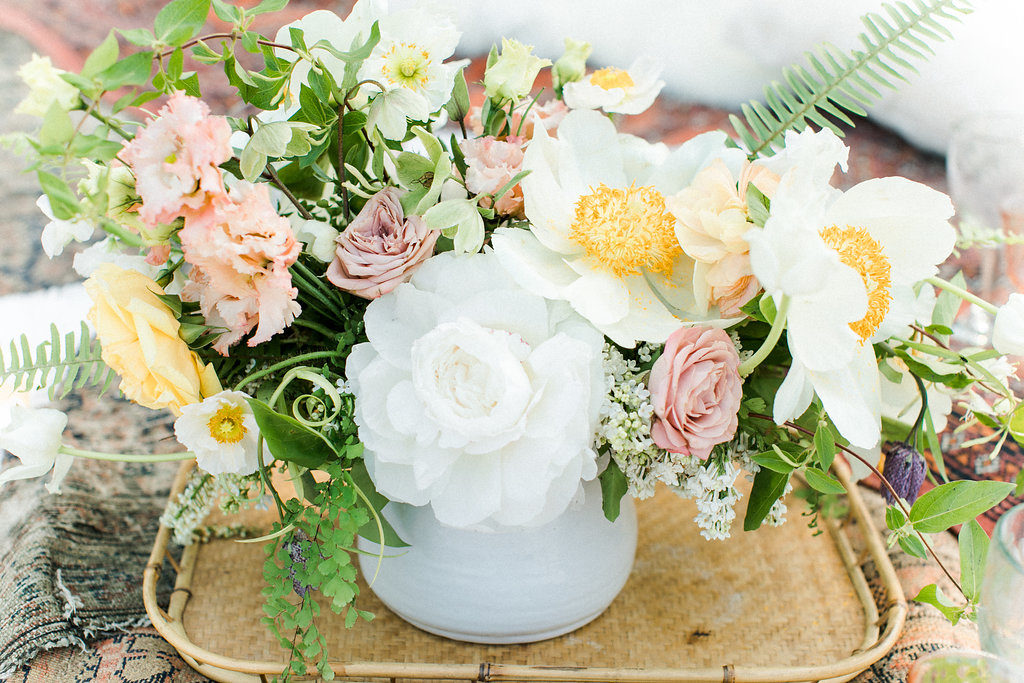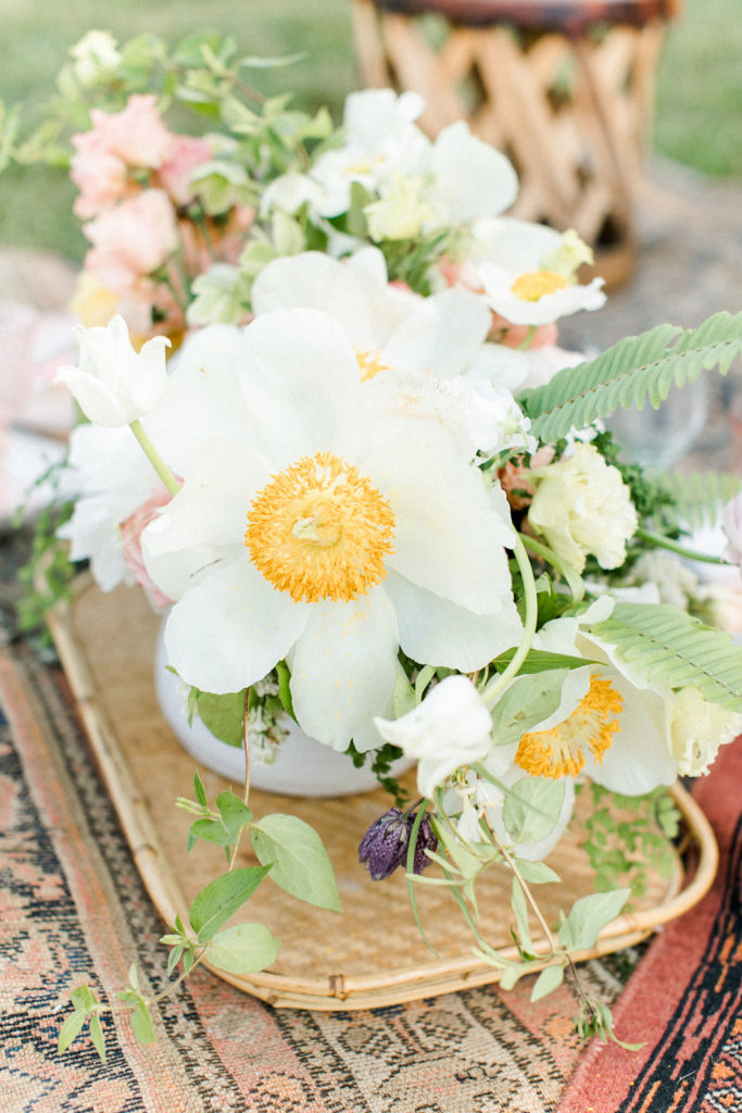This arrangement from Busy Bee Florals is gorgeous! Those claire delune peonies mixed in with those dusty rose pink roses… I could just stare all day. Sitting on a pretty rattan tray on top of layered vintage rugs really make those colors pop!