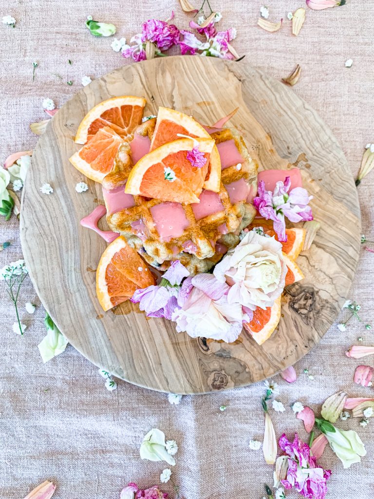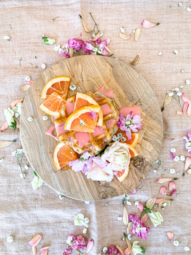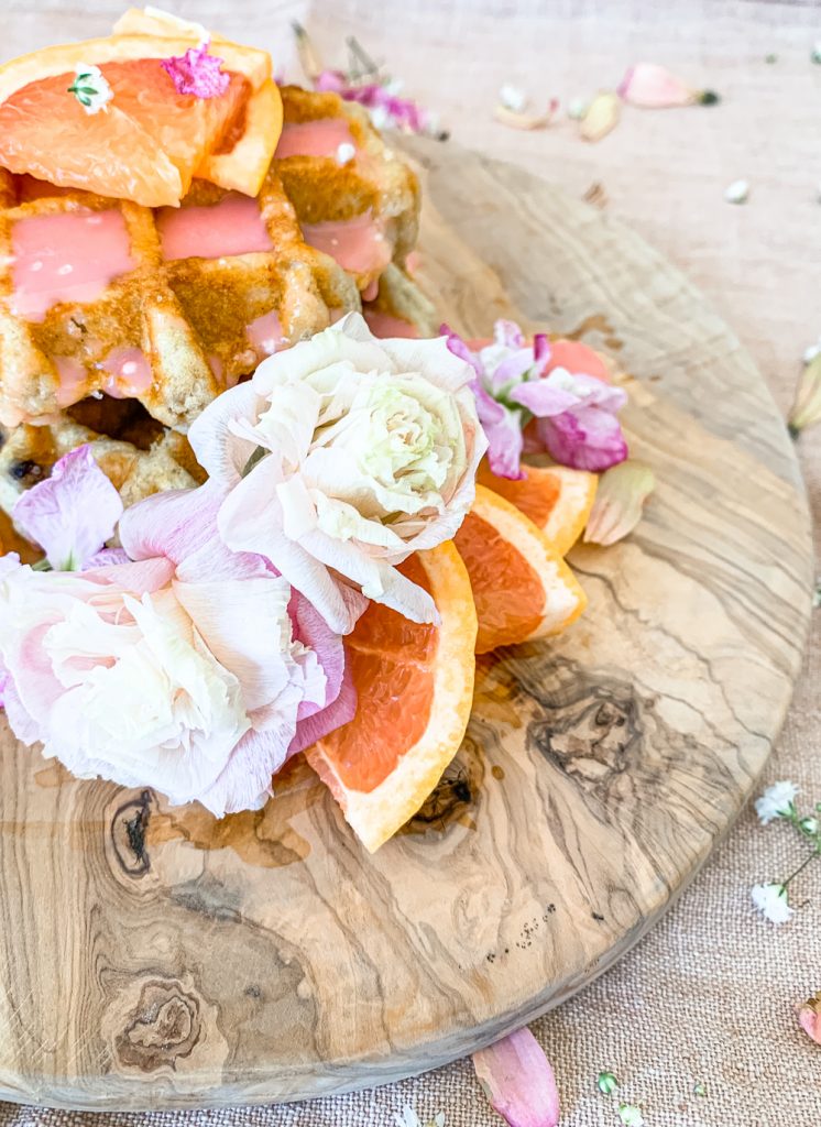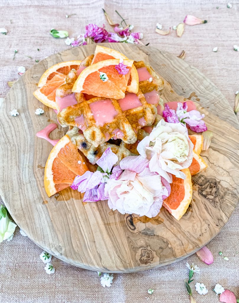 Let’s do this! Juice one blood orange and pour into a small bowl. Cut up triangles of the remaining blood oranges or whichever citrus you are using. Whisk ½ cup powdered sugar with 2 tablespoons of blood orange juice until completely smooth. It will help if you sift the lumps out of the sugar 1st. Use a whisk to create a smooth glaze. Pour the glaze over the warm waffles, and then place triangle slices of citrus on top. Serve right away, and watch the smiles appear!