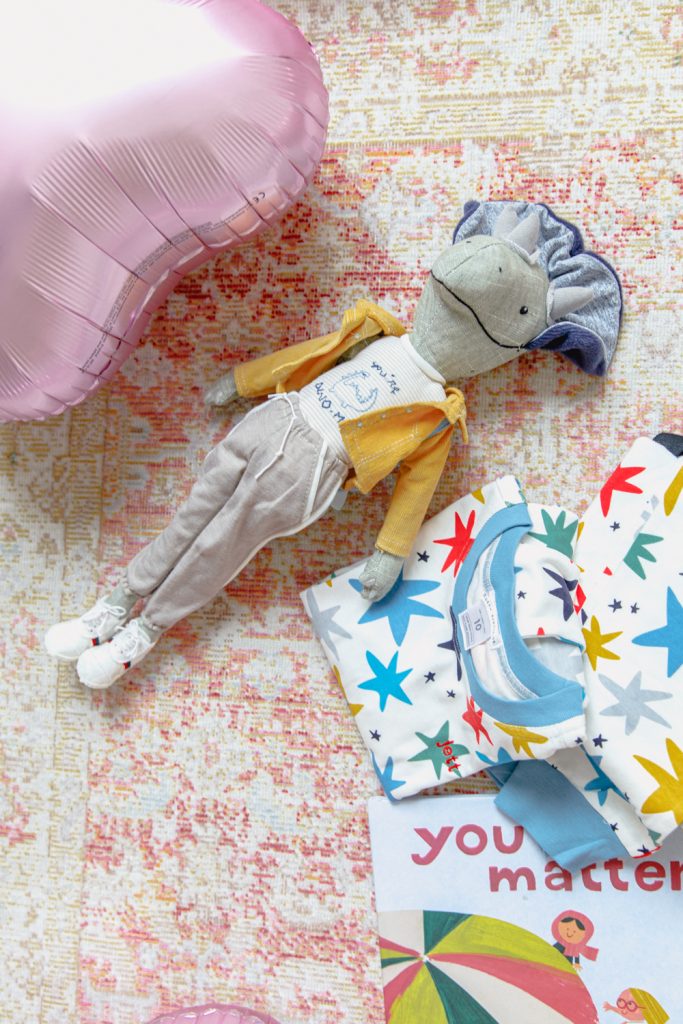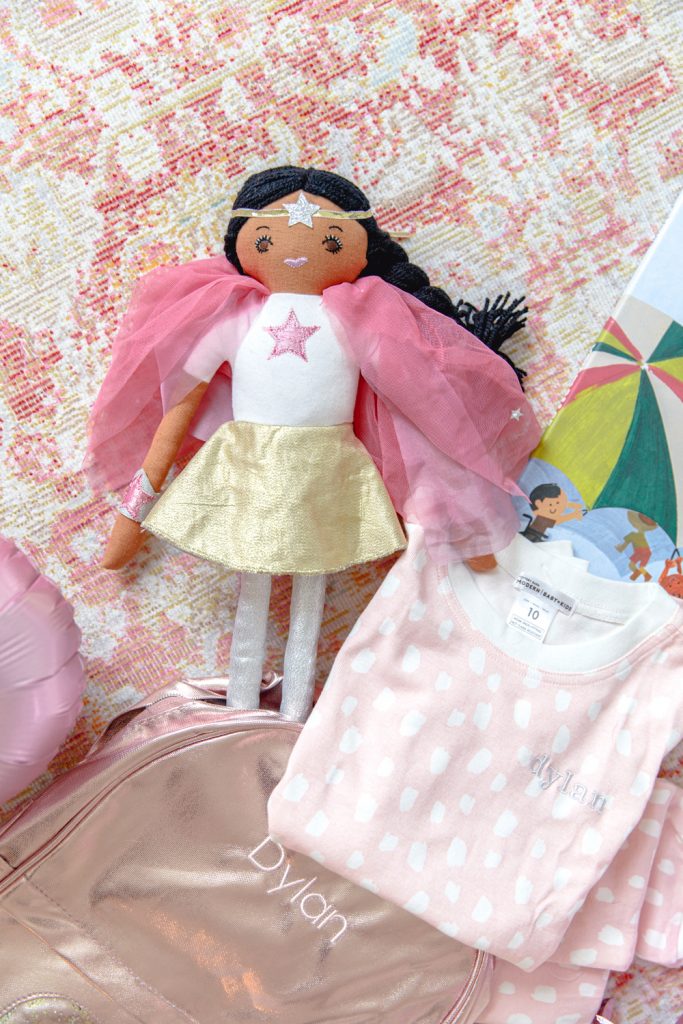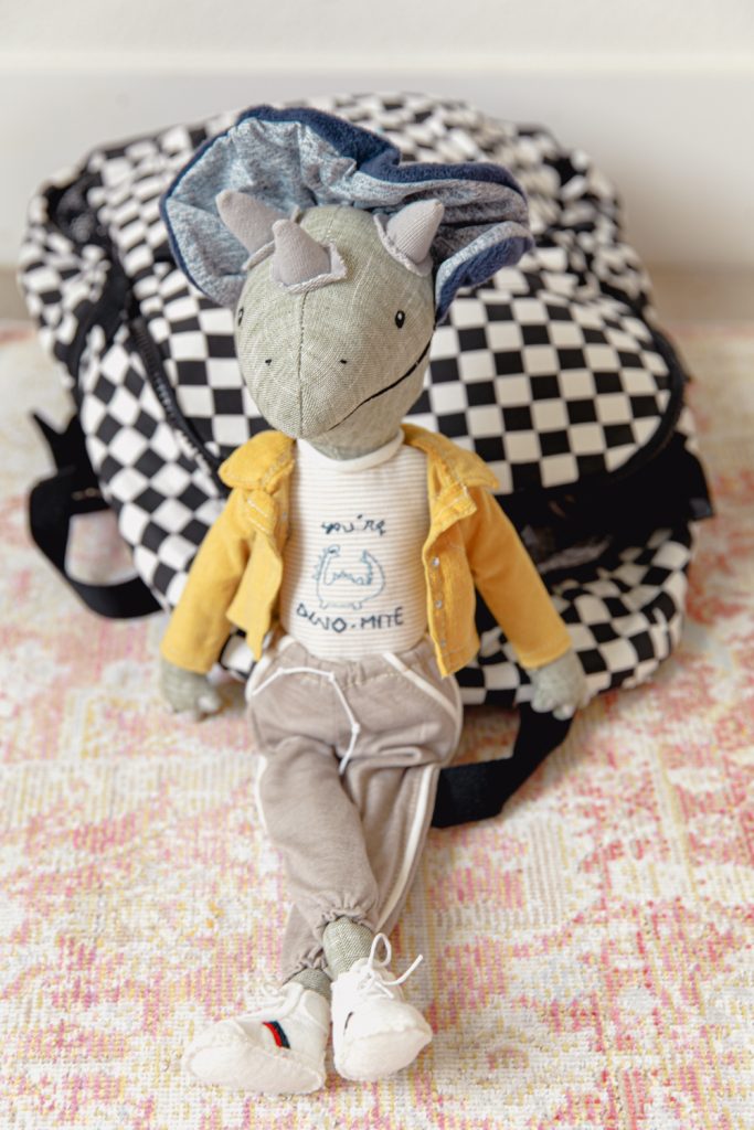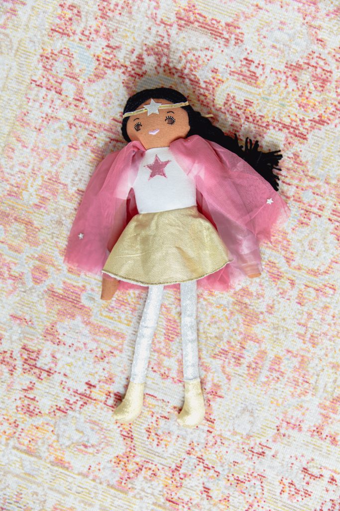 The last item in our giveaway is a doll. I don’t know what little one doesn’t like a cute doll to cuddle with. My son is hilarious with his dolls, he has named each one and created a story of who they are. Dolls are great for the kid’s imaginations. It’s always so fun to see how they are thinking. Taylor the Triceratops was a no brainer for my son. This fun guy, I know will have a great story about him. How cute are the details in this guy?!? Everything from his shoes to his cute blue backpack. And for daughter, a superhero doll! Cause all girls are superheroes!