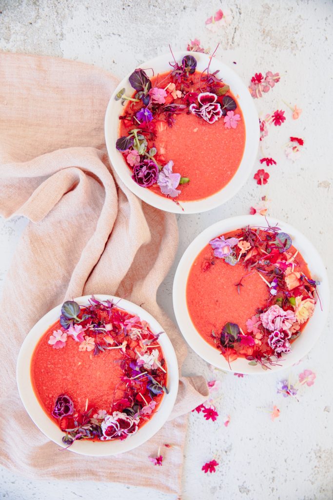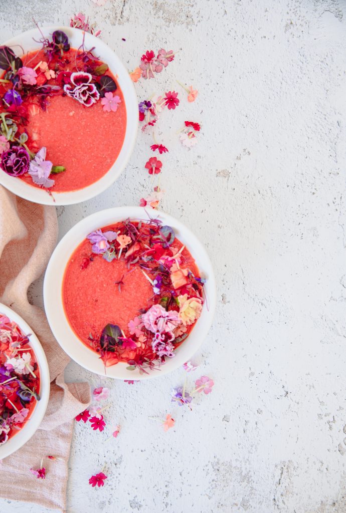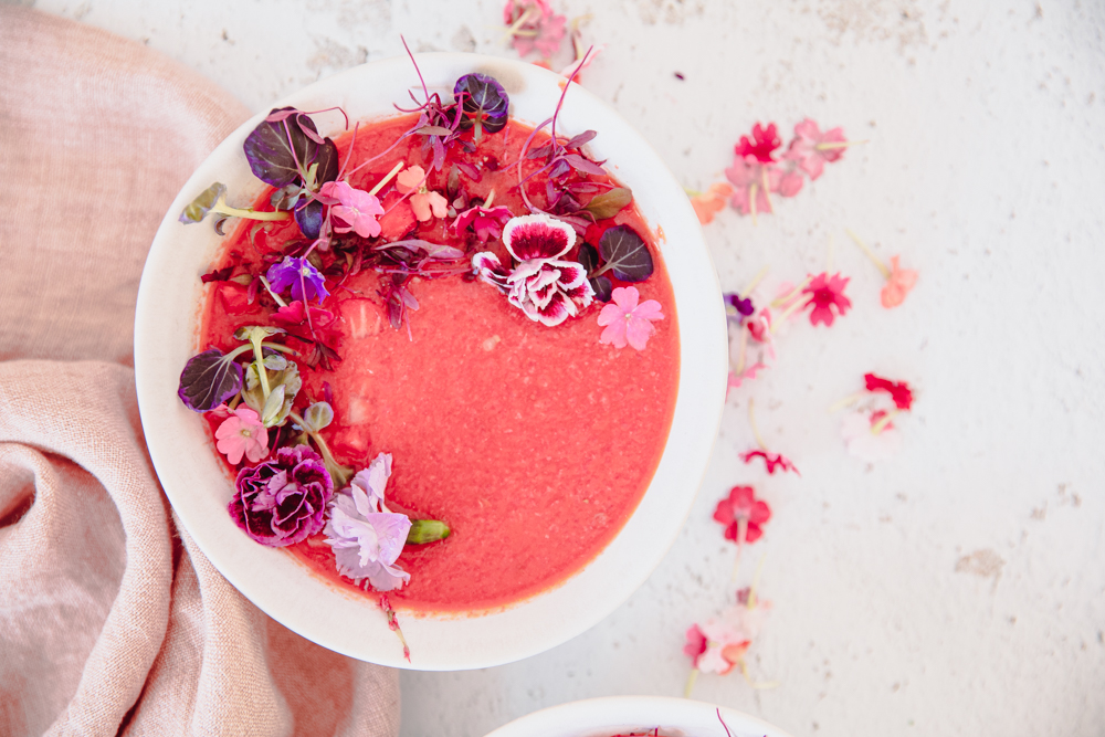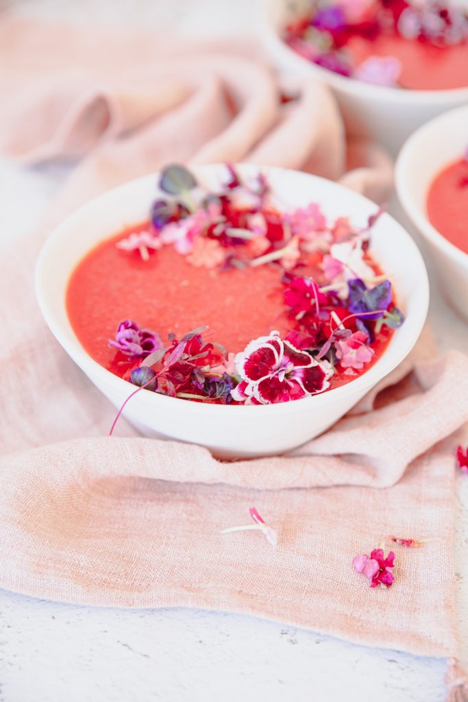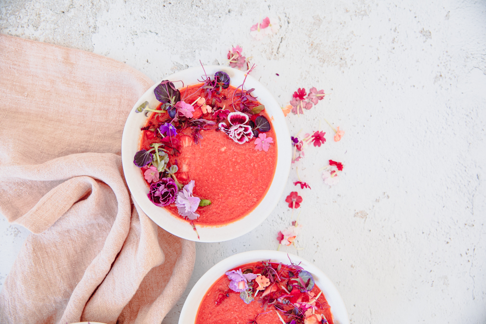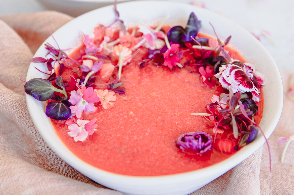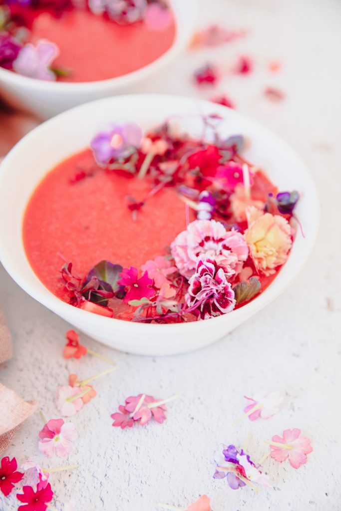 What is great about this soup is that it takes only 5 minutes to make. Throw all the ingredients in the blender except the olive oil. Start blending, and stream in the olive oil slowly for about 2-3 minutes. Once combined, taste and adjust to your liking. You may want to add more salt and pepper or lime juice. I like a lot of lime juice, so I added more. Cover and let the flavors combine and chill in the fridge for at least 2 hours. Serve up with garnished fruit, pepper, edible flowers, and a sprinkle of finishing salt.