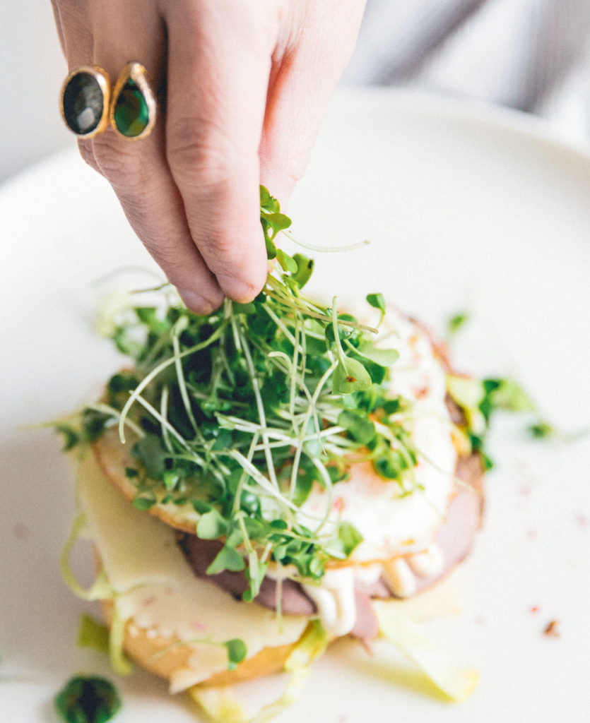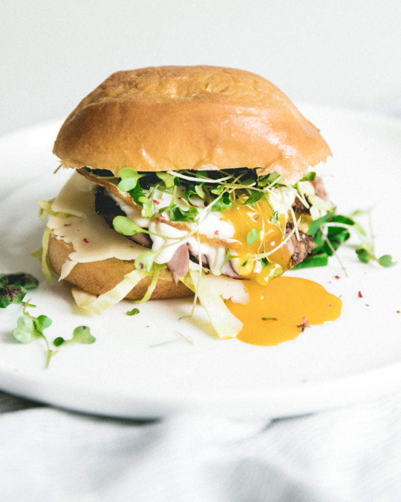 Fry up both eggs to your liking. I do sunny side up, gimmie all the runny yolk! Place your cheese on top of your fried egg as its cooking, and cover the pan. This process will help the cheese to melt. But keep an eye on it, so you don’t overcook your fried egg if you like it runny. Place the egg and cheese on top of the cabbage. Finally, top with sprouts and final bun.