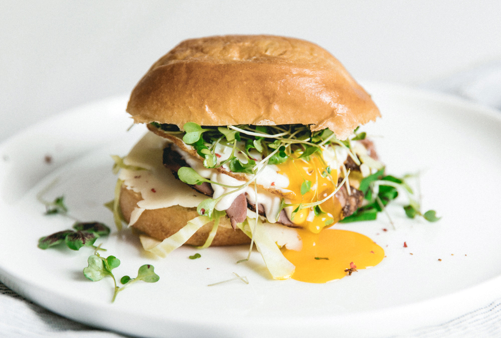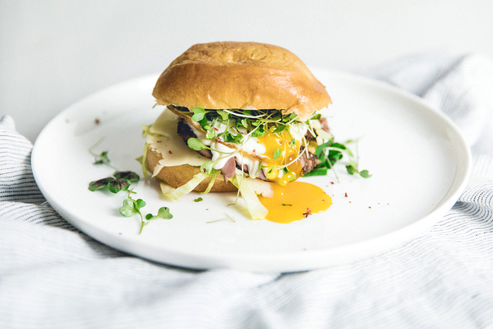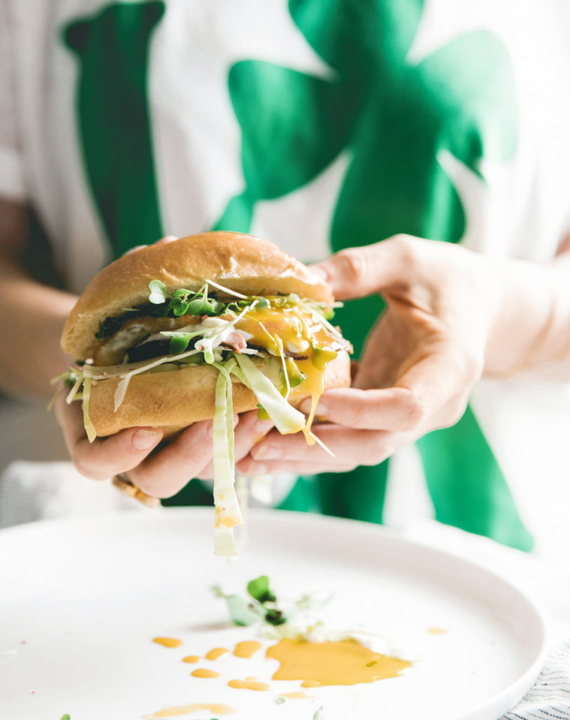 Move over corned beef and cabbage, there is a new fresh kid in town to help you celebrate St. Paddy’s day here in 2019! I don’t know about you, but my mom use to force us to eat corned beef and cabbage every St. Patrick’s Day! I promised myself that I would never do that to my kids! Unless they are being really bad, that seems like a great punishment, some soggy cabbage! I love a good sandwich, and this spicy sriracha cabbage and pastrami egg sandwich will have you loving St. Paddy’s day again!  A modern take on a St. Paddy’s sandwich with its Siracha infused cabbage and grilled pastrami, gooey melted white cheddar, and my favorite part, a runny fried egg! An addition of some spicy sprouts and a fresh citrus hint from lemon aioli and you are ready to dig in! Don’t forget a good pint to go with it!