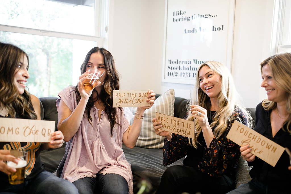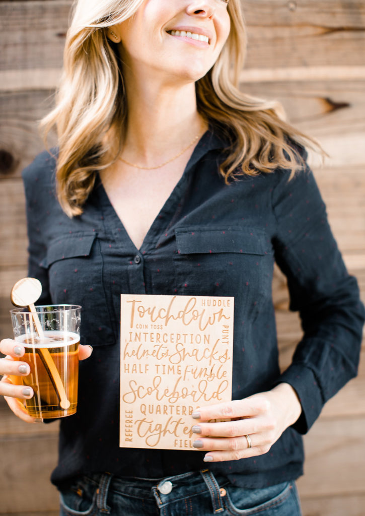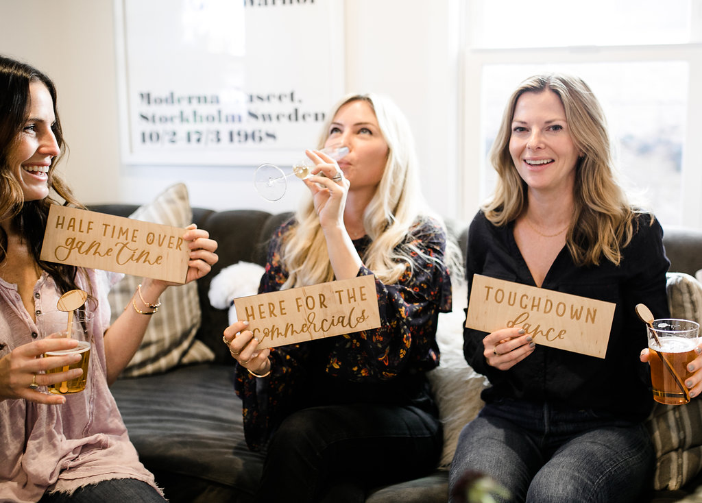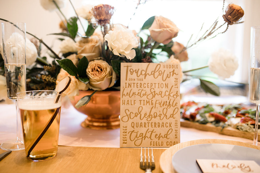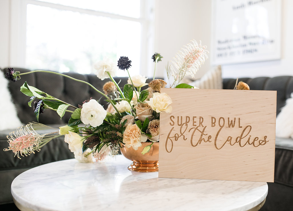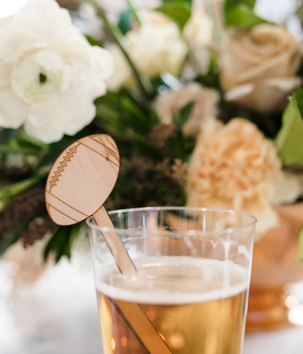 Next, you need to add florals… We’ve said this before but they make an event!  Yes, even for a Super Bowl party…  You don’t need much but if you have a few stand out arrangements like these from Rooted and Wild you are set!  Get your coffee table, kitchen table and possible mantle styled up and you are good to go!  Now after that, don’t forget the details.  My friend Courtney from Poppy Jack Shop created fun signage pieces for us to play with and football cocktail stirrers.  Plus she made the cutest invite for our guests!