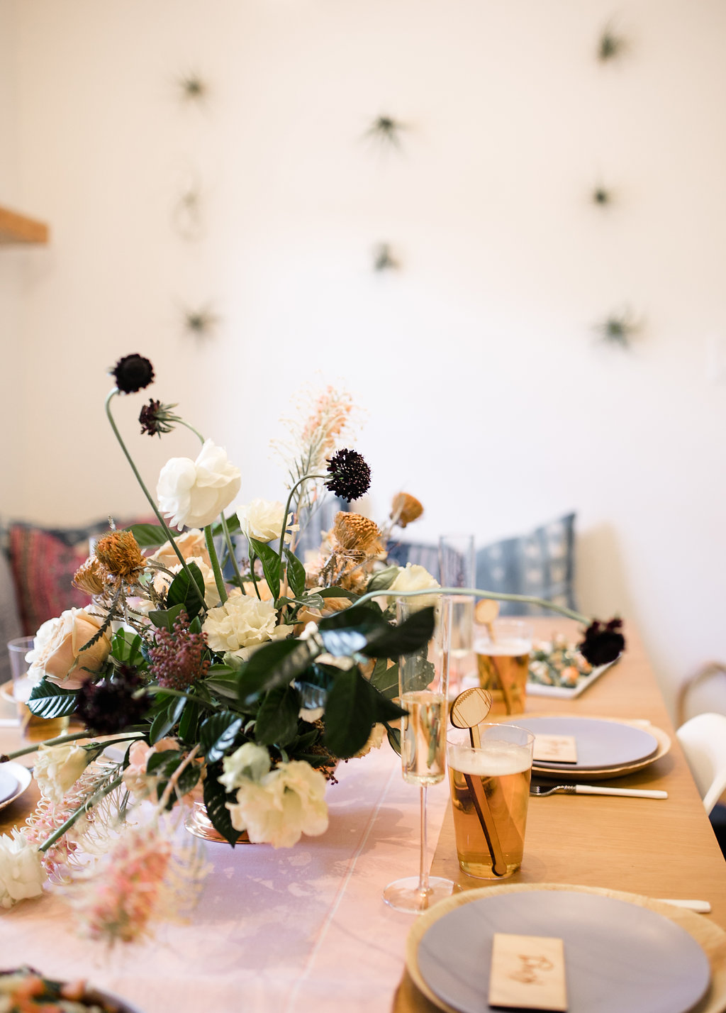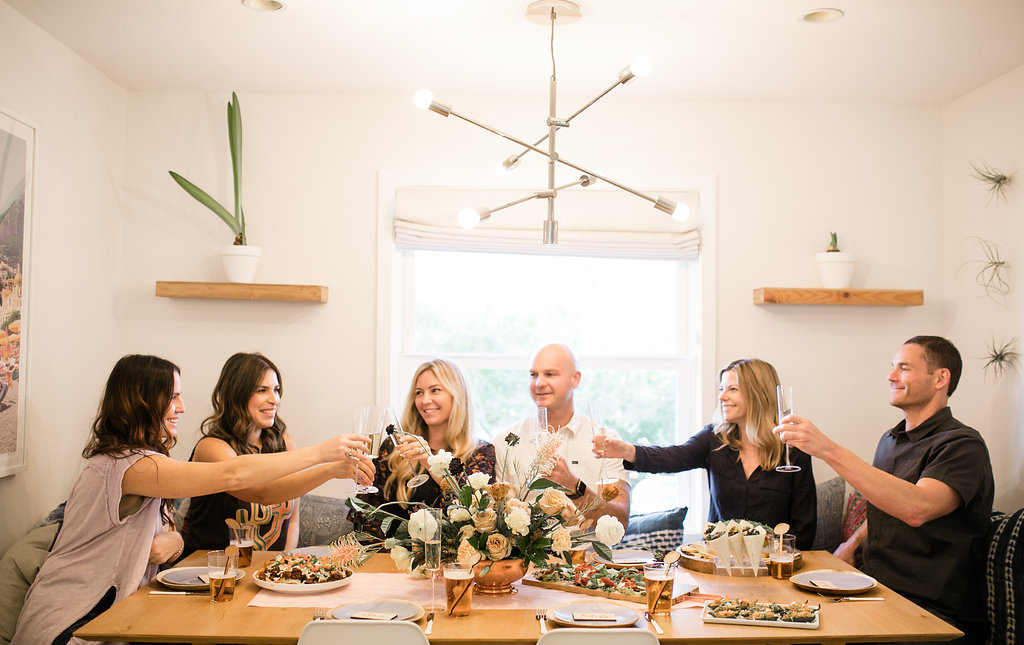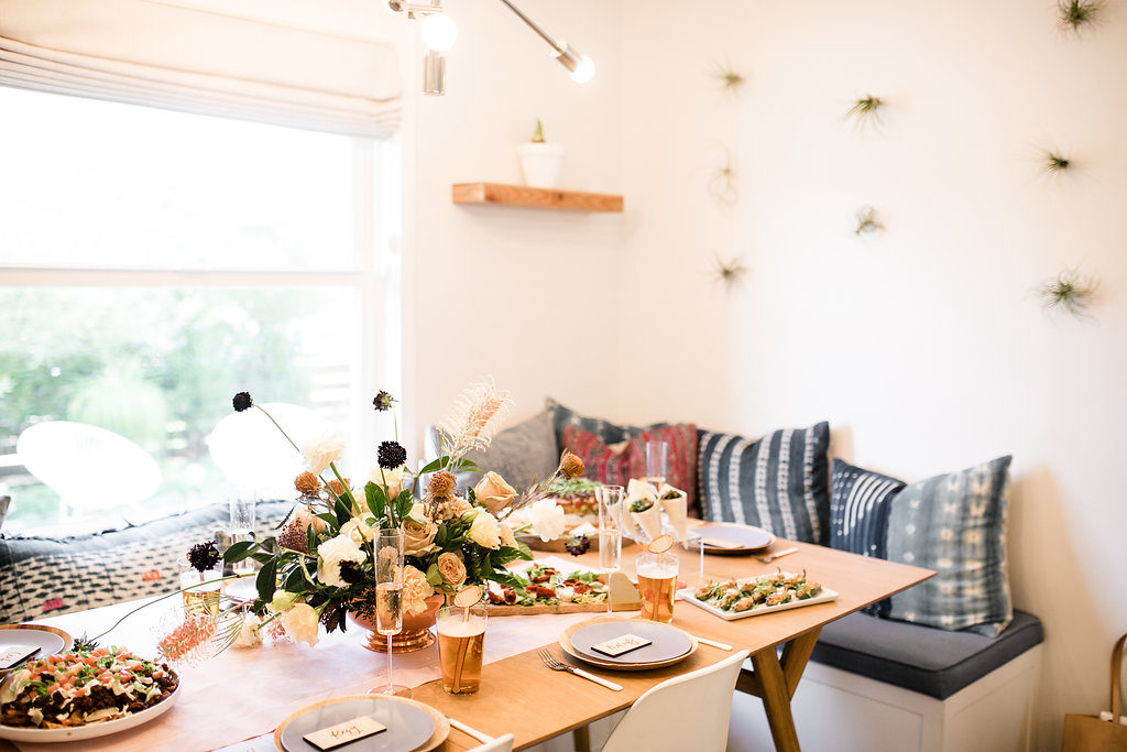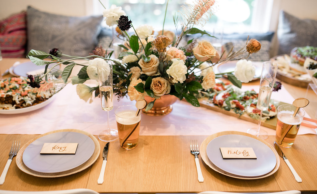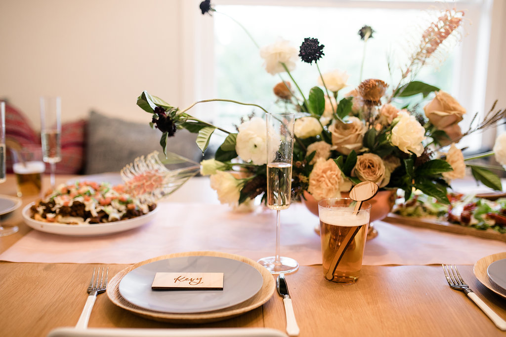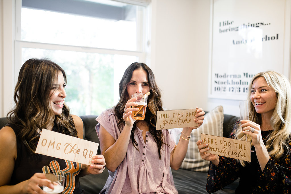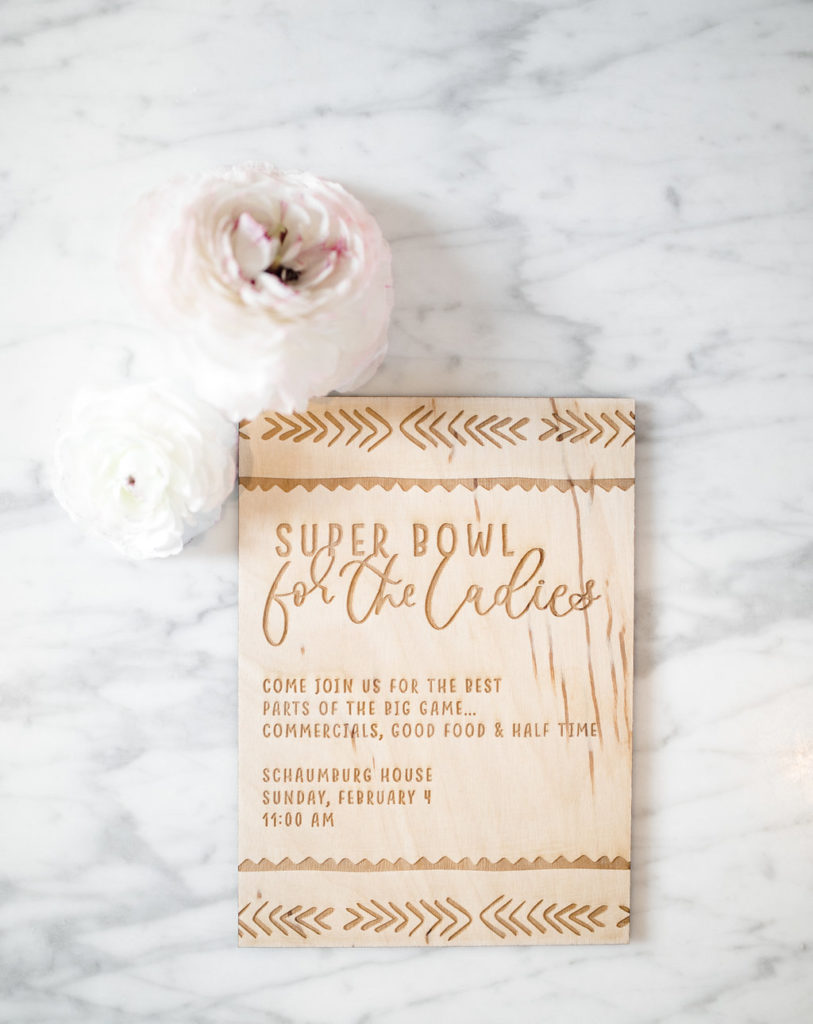 Next, you need to add florals… We’ve said this before but they make an event!  Yes, even for a Super Bowl party…  You don’t need much but if you have a few stand out arrangements like these from Rooted and Wild you are set!  Get your coffee table, kitchen table and possible mantle styled up and you are good to go!  Now after that, don’t forget the details.  My friend Courtney from Poppy Jack Shop created fun signage pieces for us to play with and football cocktail stirrers.  Plus she made the cutest invite for our guests!