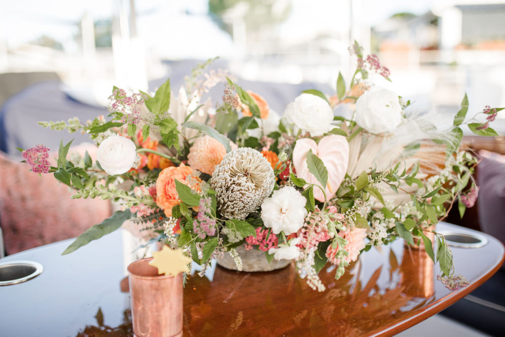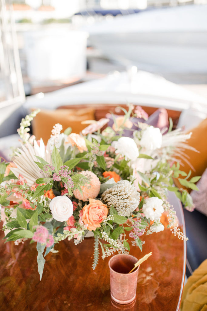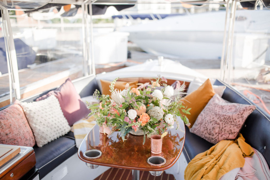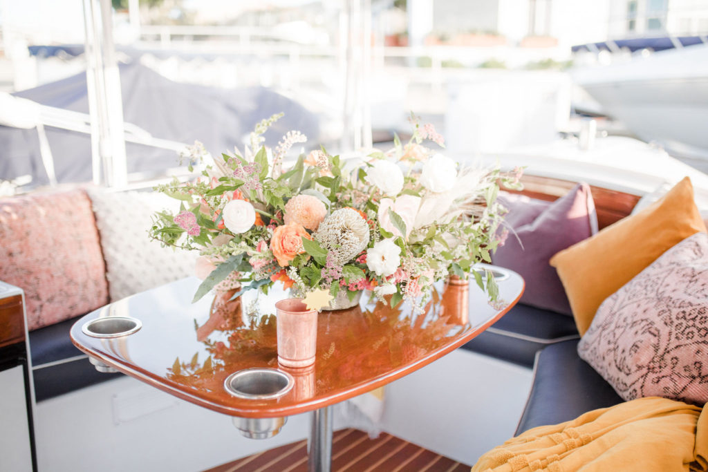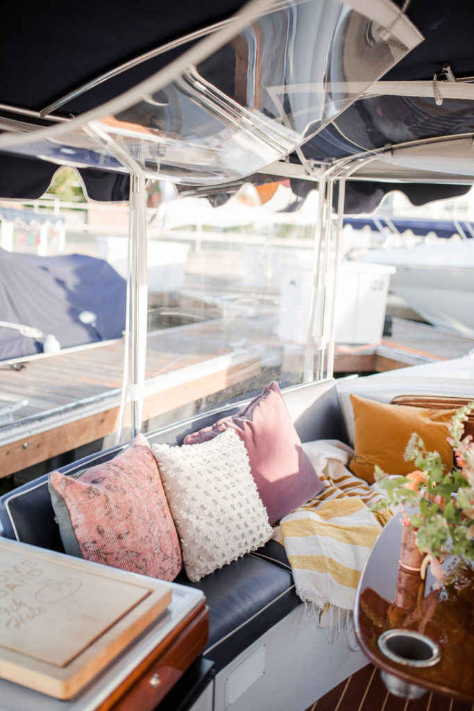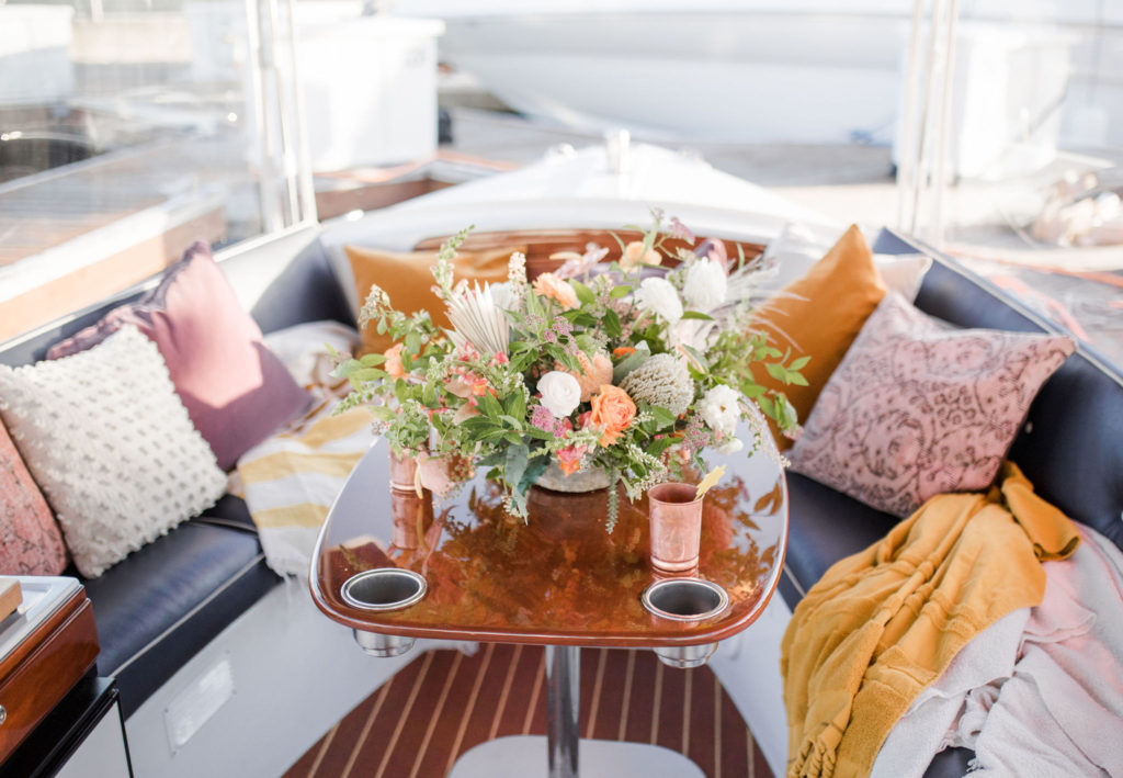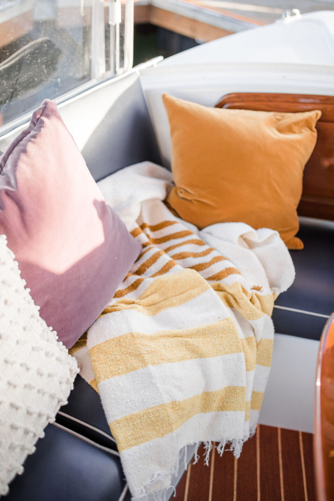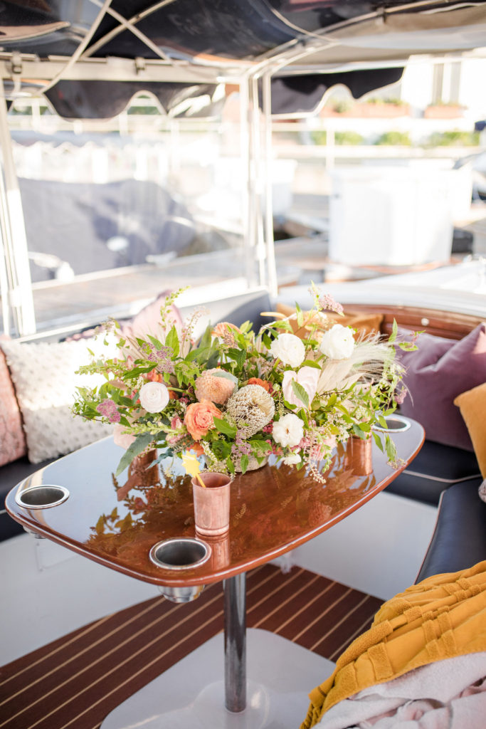 We set our duffy up pretty nicely! Lots of pretty pillows borrowed from Sweet Salvage Rentals, cozy blankets from Gunn & Swain and Seaesta Surf and of course gorgeous florals!! Alex from Third & Park initiated the whole idea of taking this duffy out, so she of course supplied the florals. It was a pretty boho arrangement that added so much pretty to the boat.