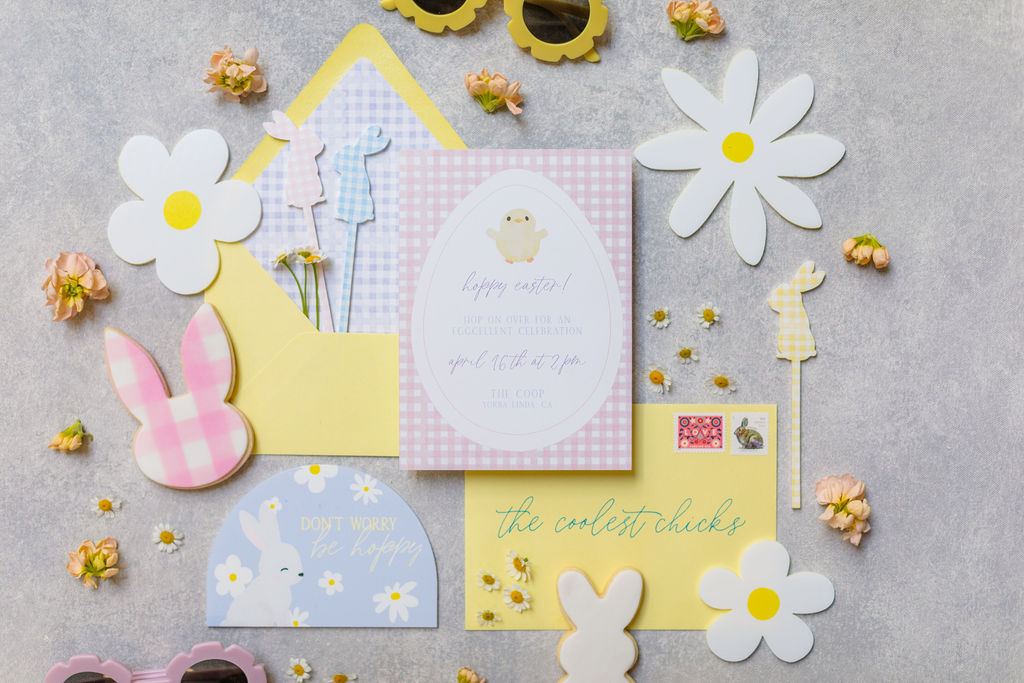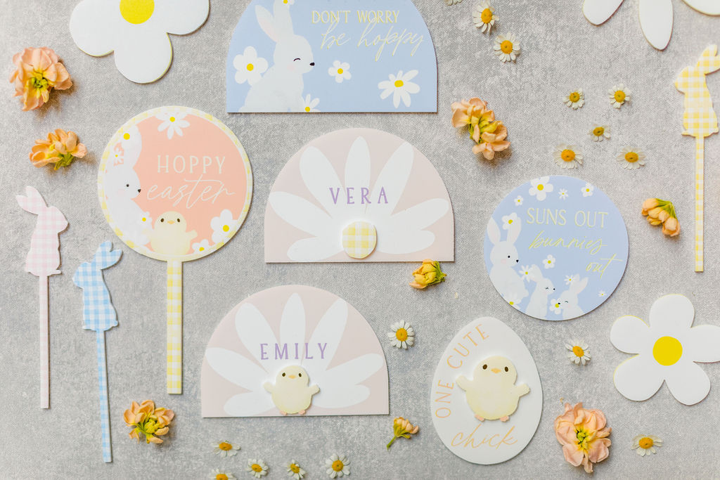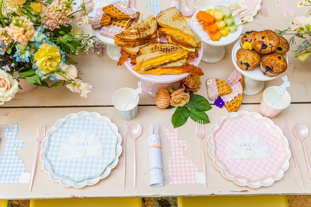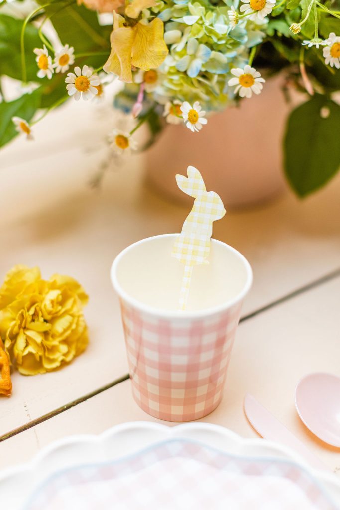I’m loving this gingham tabletop from Meri Meri. It’s new and it’s so darn fun for Spring!! Gotta love our cutie details with it too – the bunny stir sticks and those sweet place cards all by Pirouette Paper & Creative Amme.