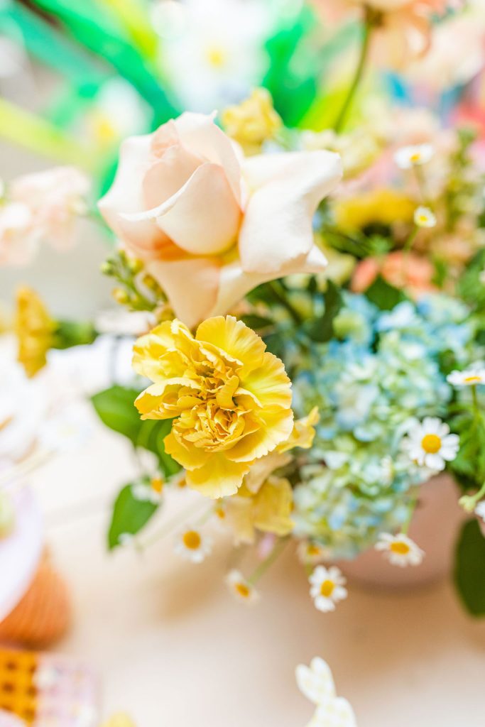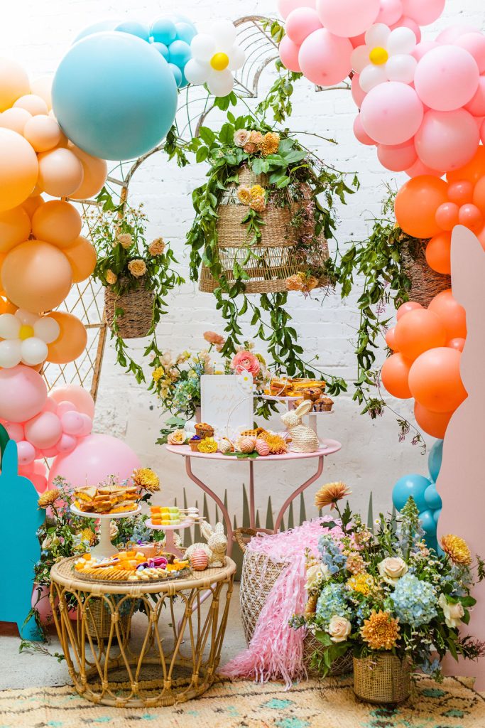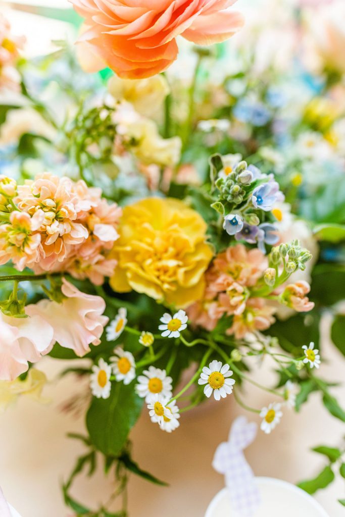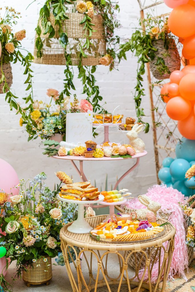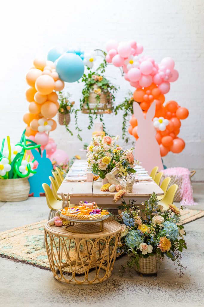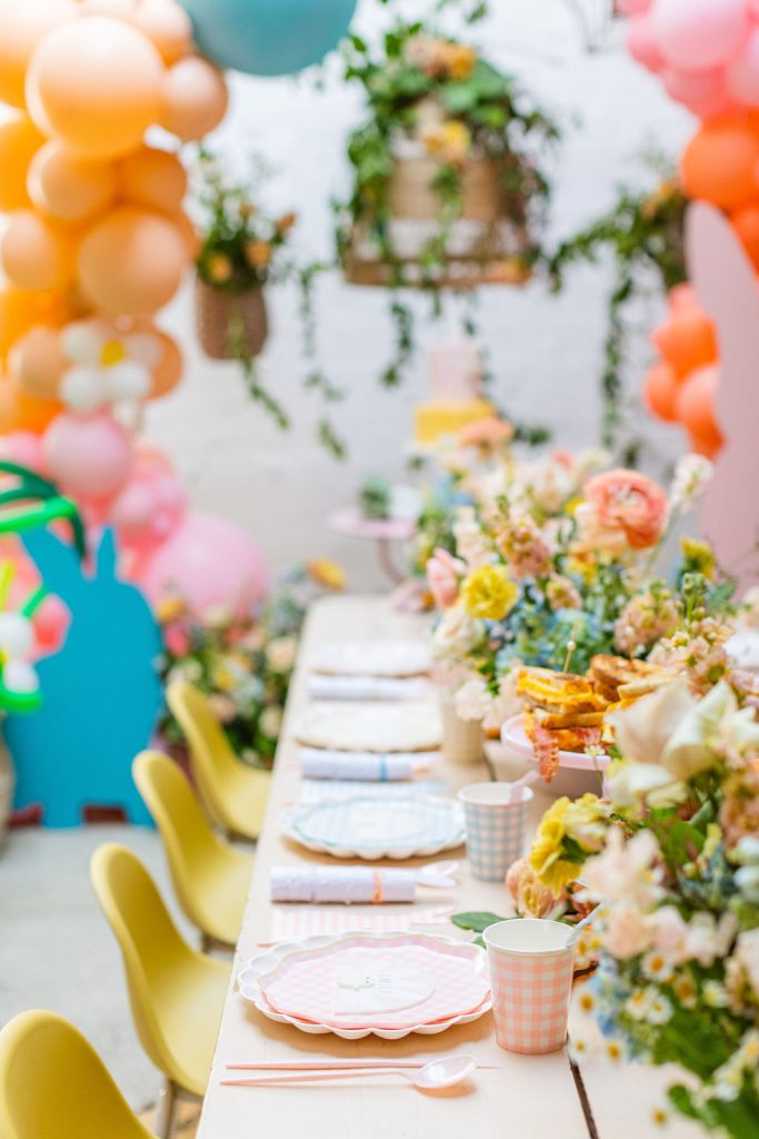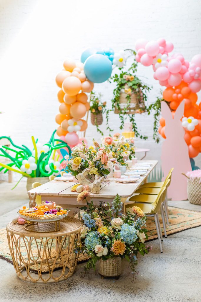Onto our pretty set up!! Of course we used the best kid’s rentals from our friend Marnie at Sweet Salvage Rentals. I am in love with her new and modern yellow kid’s chairs – aren’t they adorable? Then The Pop Shop did her thing with an amazing balloon arch filled with flowers that complimented Paper Garden XOXO’s cute bunny cut outs perfectly. Last but not least, this was a floral filled affair with all the amazing spring blooms from Fleur.ish. I love how she added pretty from the backdrop to the table to the floor! Flowers galore!!!