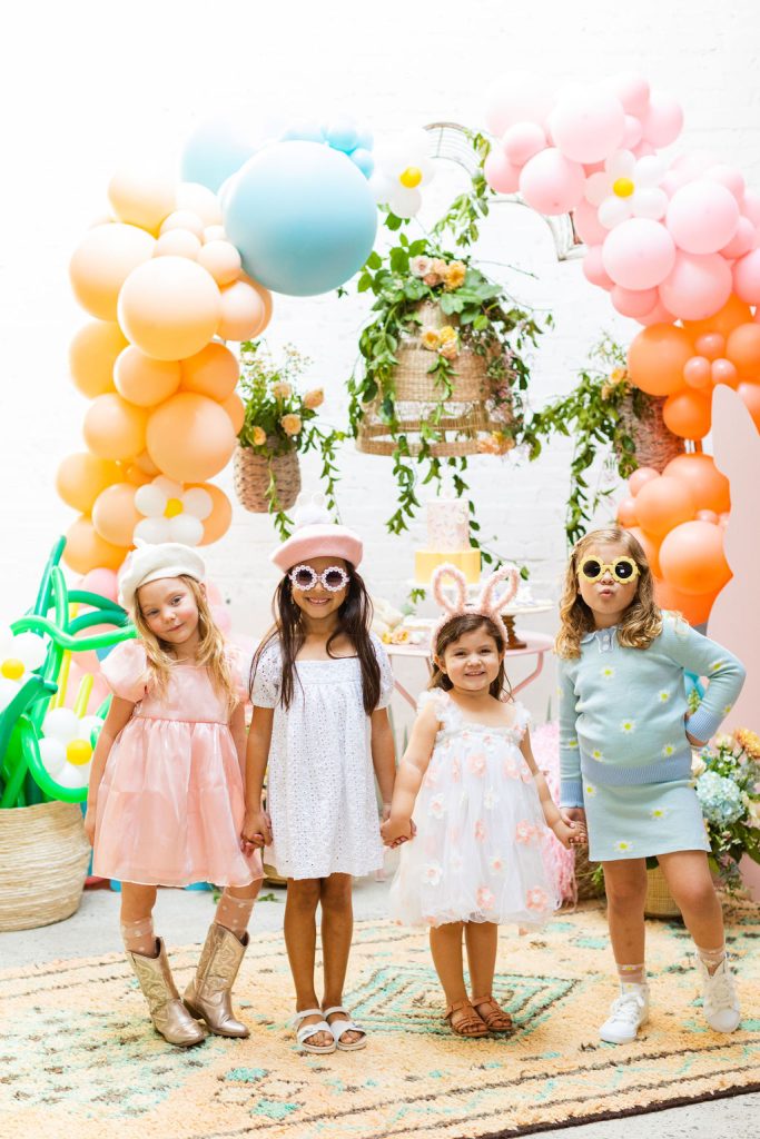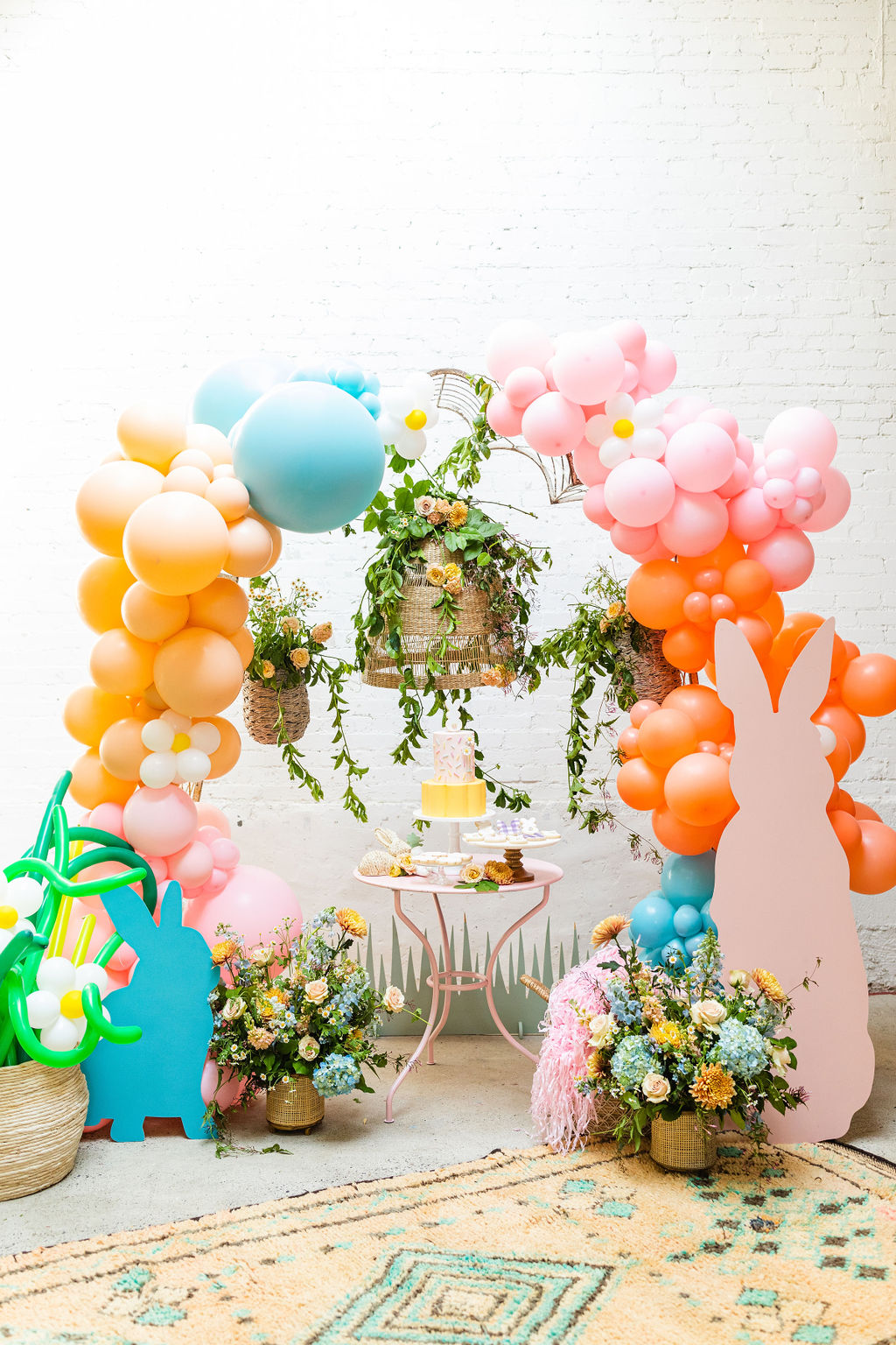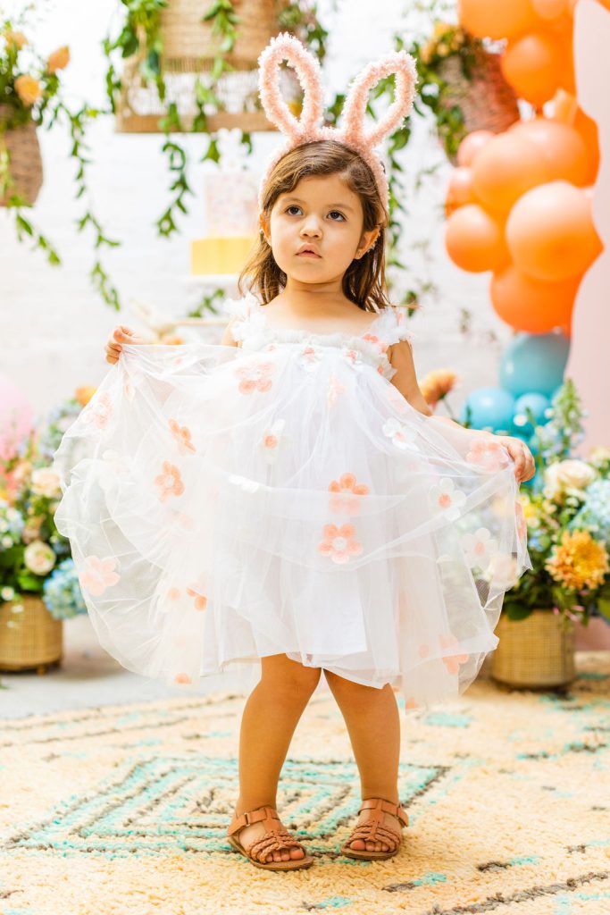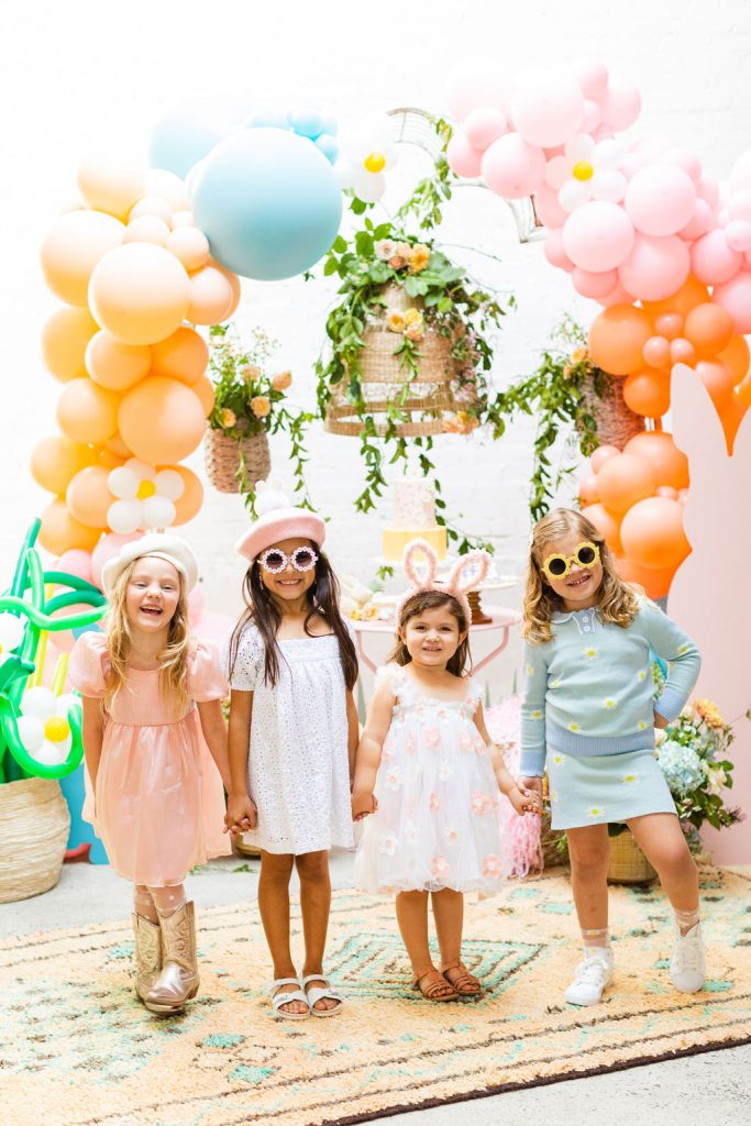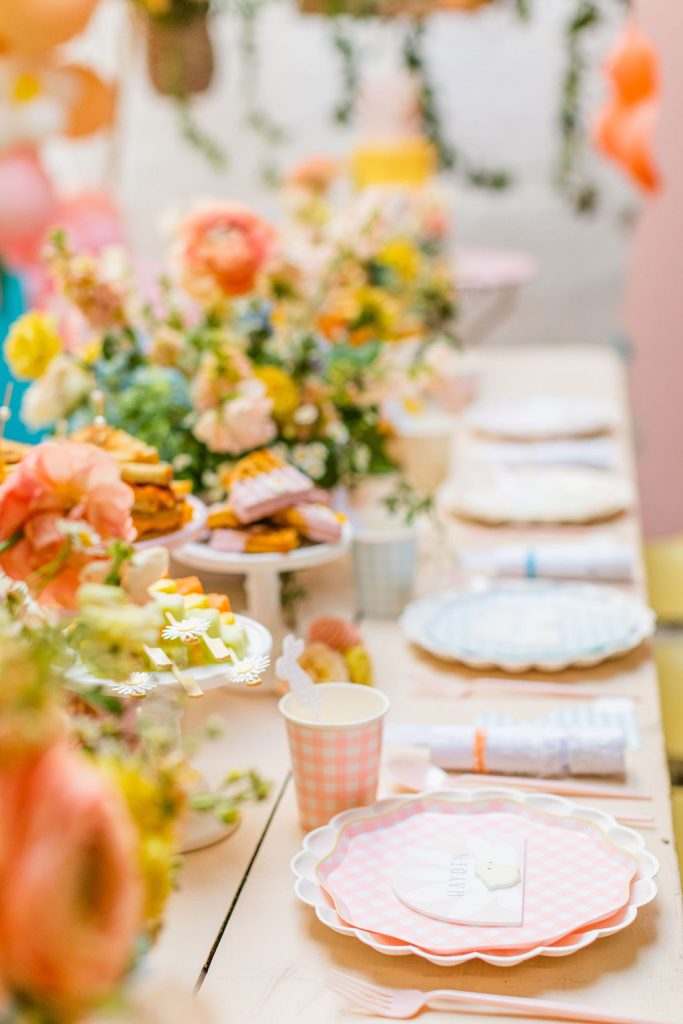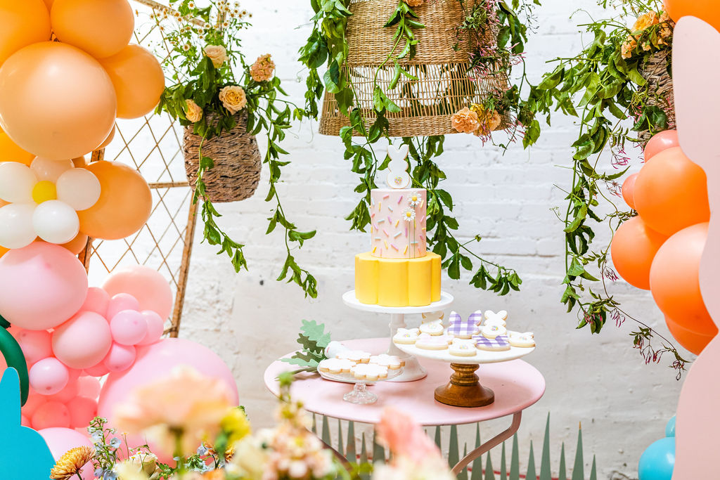Onto our pretty set up!! Of course we used the best kid’s rentals from our friend Marnie at Sweet Salvage Rentals. I am in love with her new and modern yellow kid’s chairs – aren’t they adorable? Then The Pop Shop did her thing with an amazing balloon arch filled with flowers that complimented Paper Garden XOXO’s cute bunny cut outs perfectly. Last but not least, this was a floral filled affair with all the amazing spring blooms from Fleur.ish. I love how she added pretty from the backdrop to the table to the floor! Flowers galore!!!