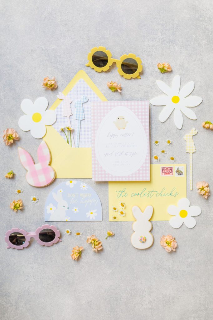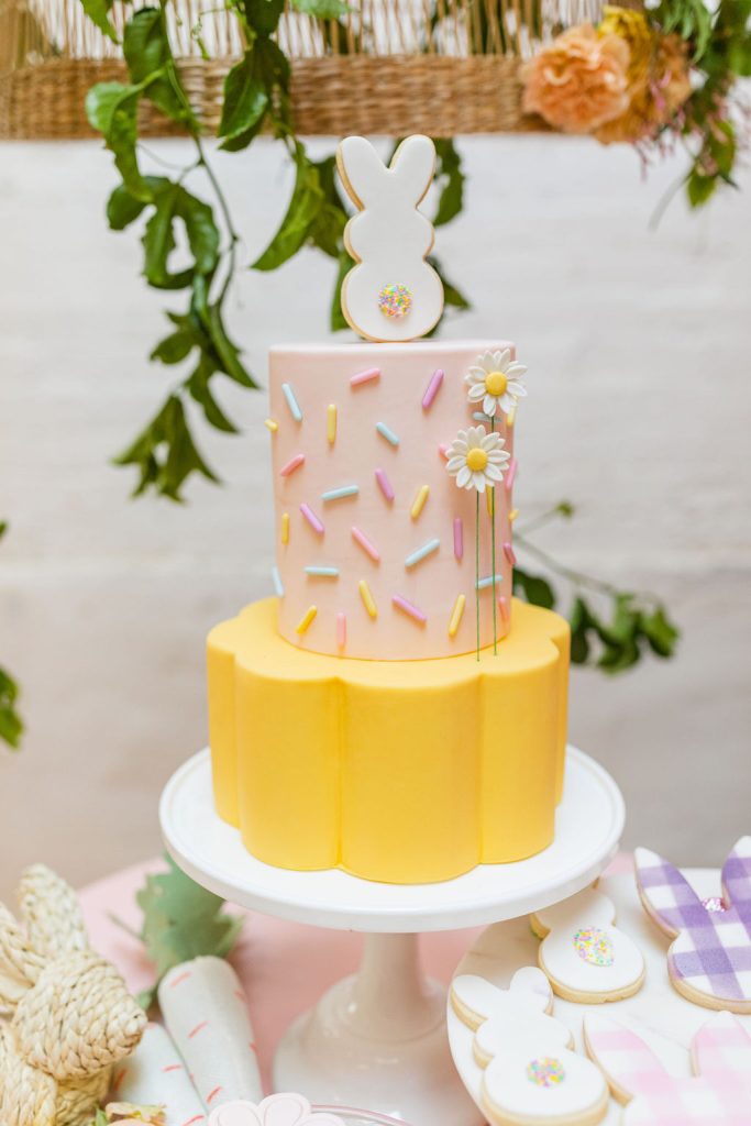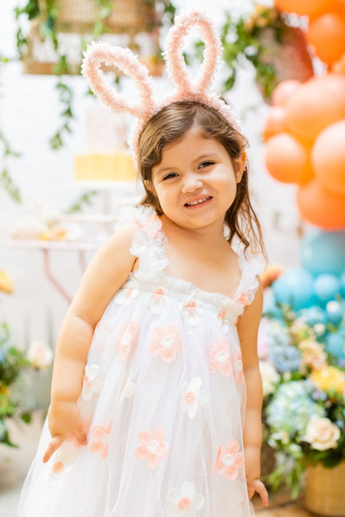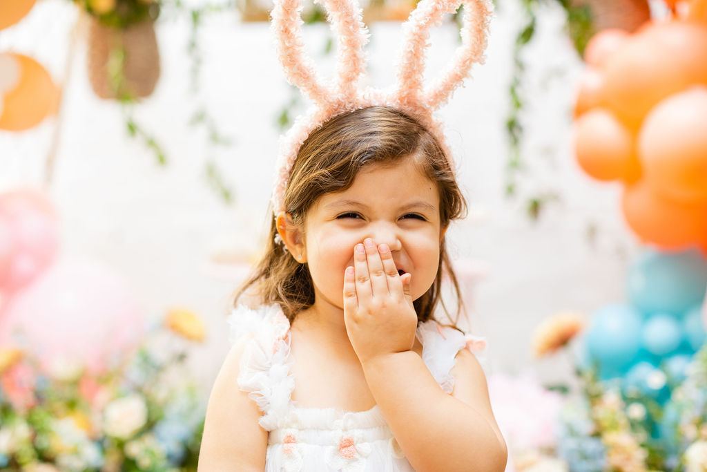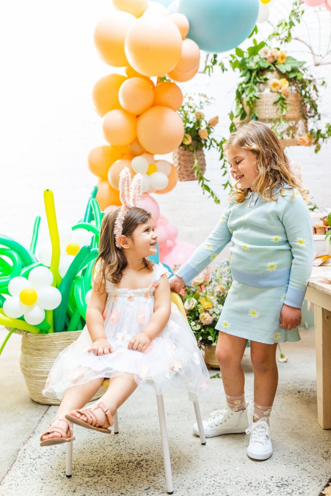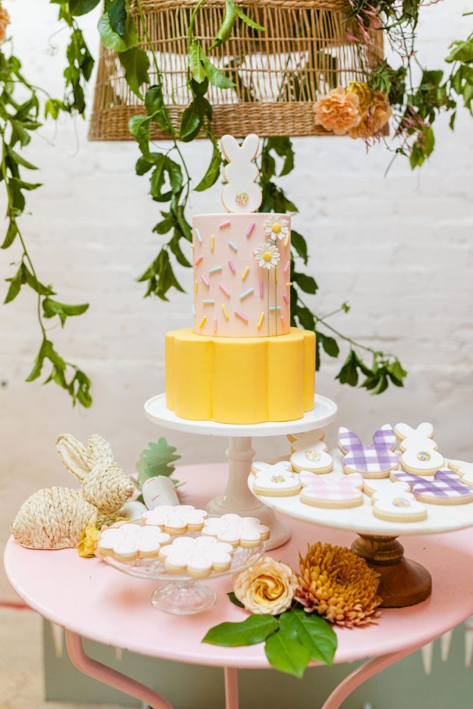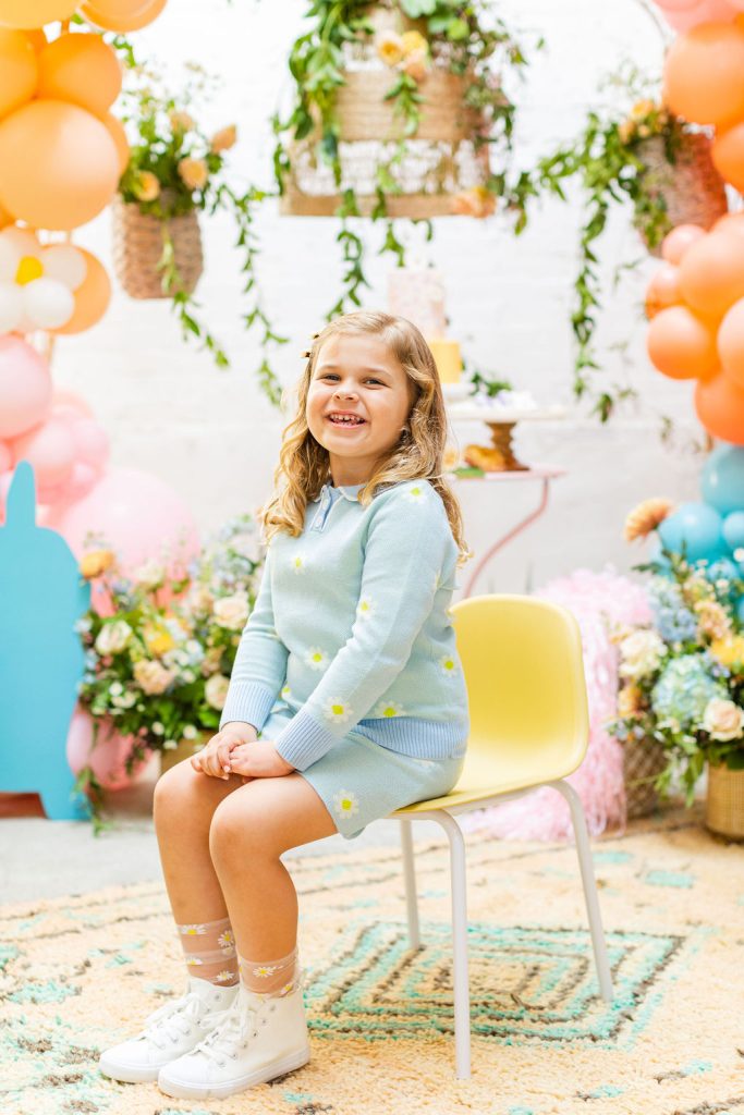 Onto our pretty set up!! Of course we used the best kid’s rentals from our friend Marnie at Sweet Salvage Rentals. I am in love with her new and modern yellow kid’s chairs – aren’t they adorable? Then The Pop Shop did her thing with an amazing balloon arch filled with flowers that complimented Paper Garden XOXO’s cute bunny cut outs perfectly. Last but not least, this was a floral filled affair with all the amazing spring blooms from Fleur.ish. I love how she added pretty from the backdrop to the table to the floor! Flowers galore!!!