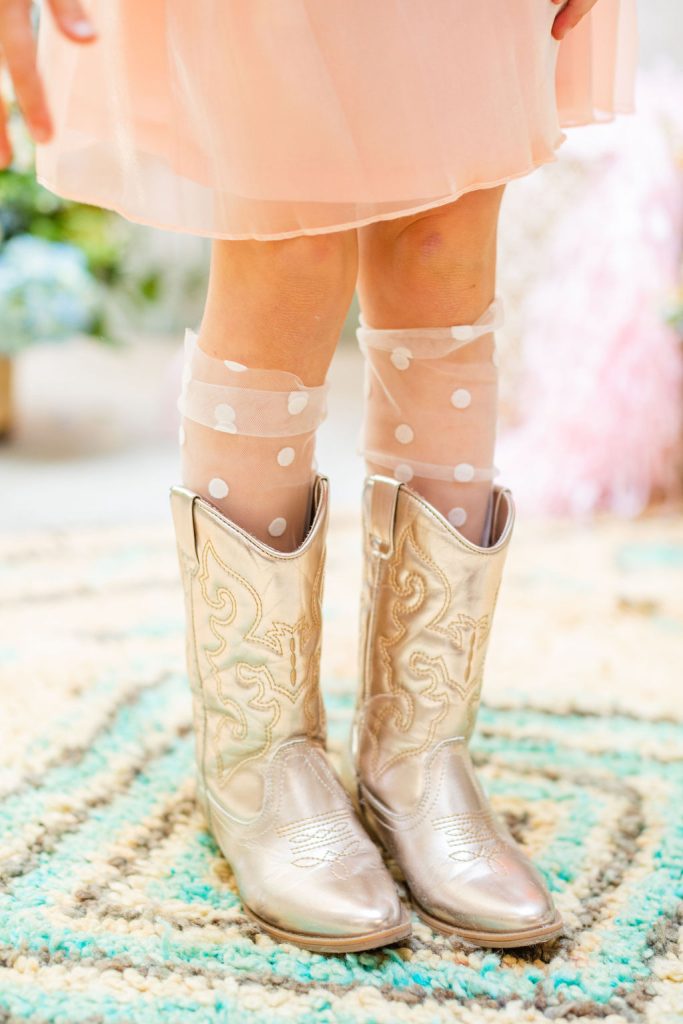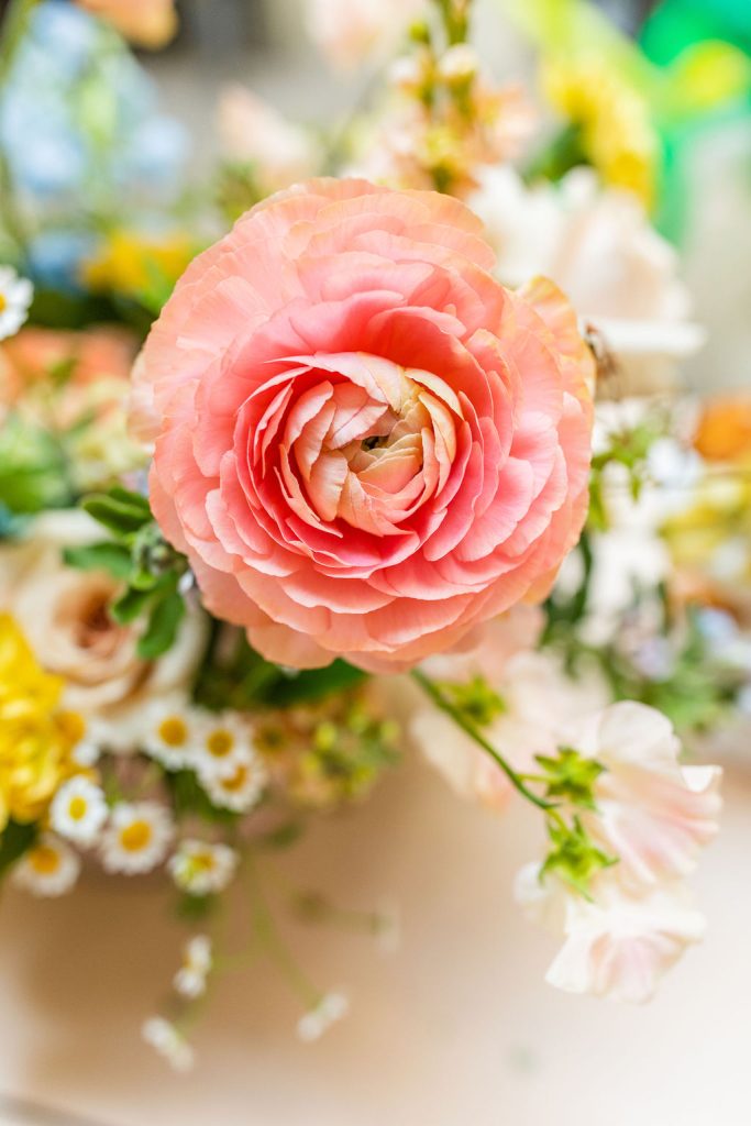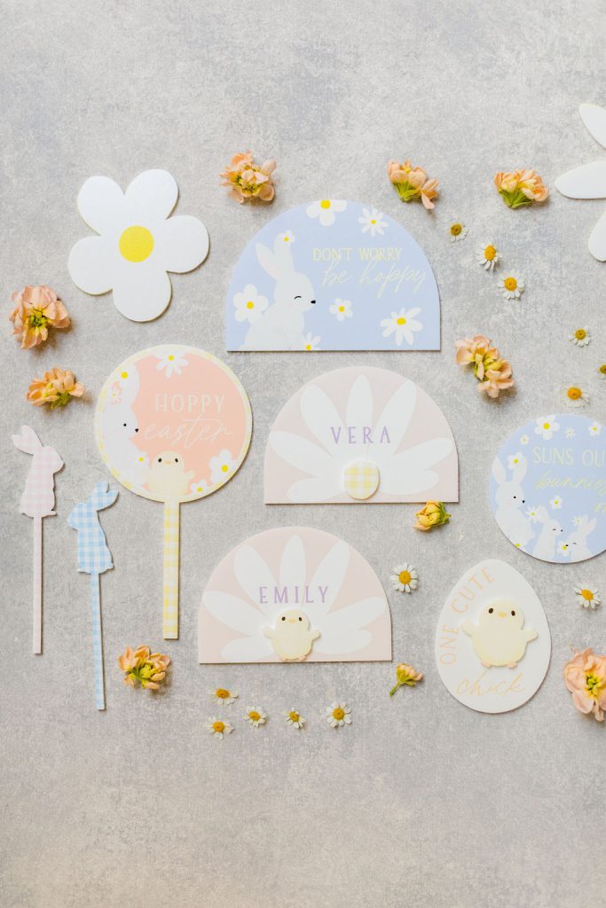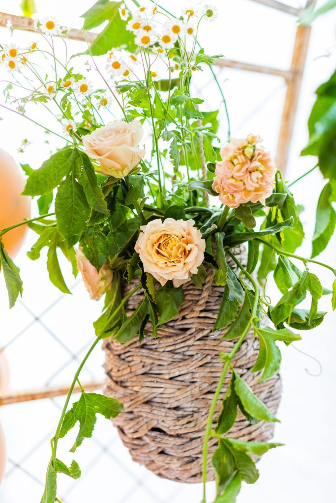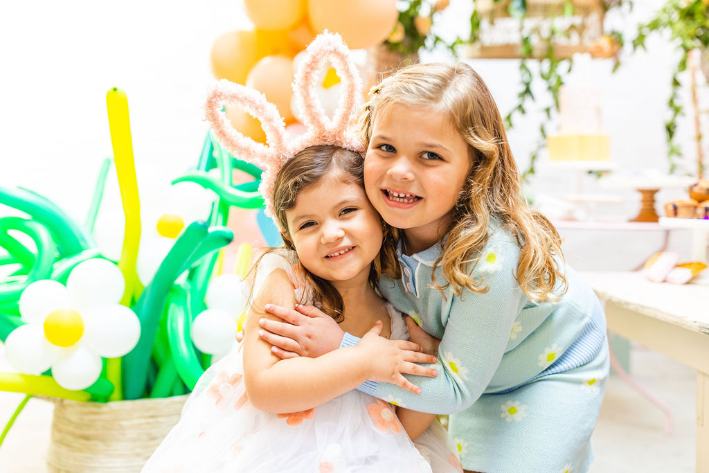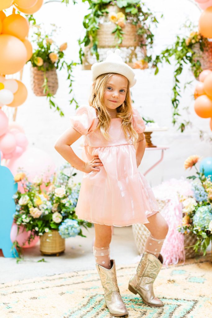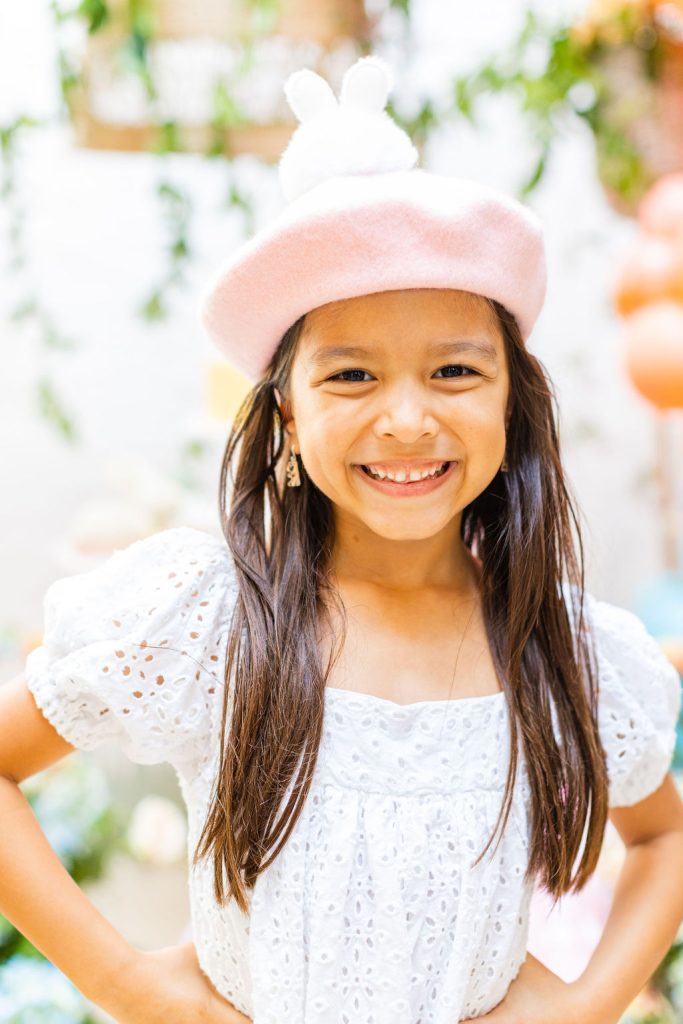Onto our pretty set up!! Of course we used the best kid’s rentals from our friend Marnie at Sweet Salvage Rentals. I am in love with her new and modern yellow kid’s chairs – aren’t they adorable? Then The Pop Shop did her thing with an amazing balloon arch filled with flowers that complimented Paper Garden XOXO’s cute bunny cut outs perfectly. Last but not least, this was a floral filled affair with all the amazing spring blooms from Fleur.ish. I love how she added pretty from the backdrop to the table to the floor! Flowers galore!!!