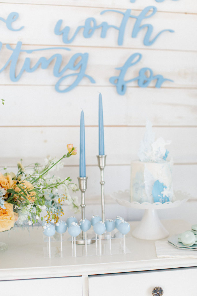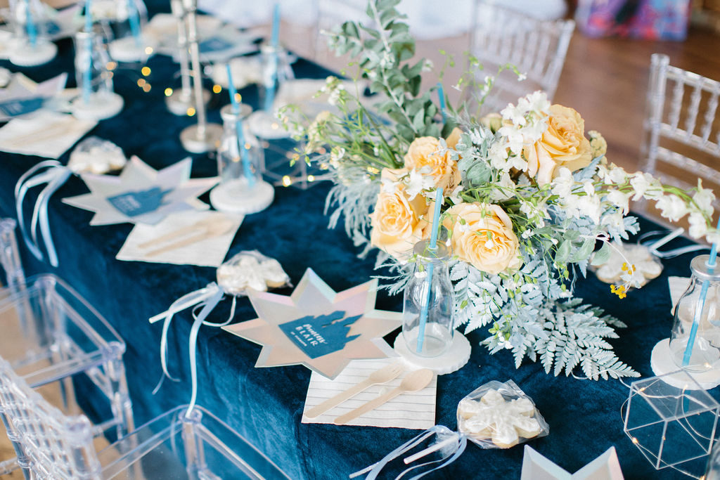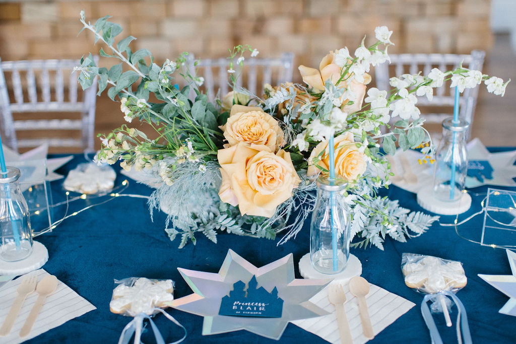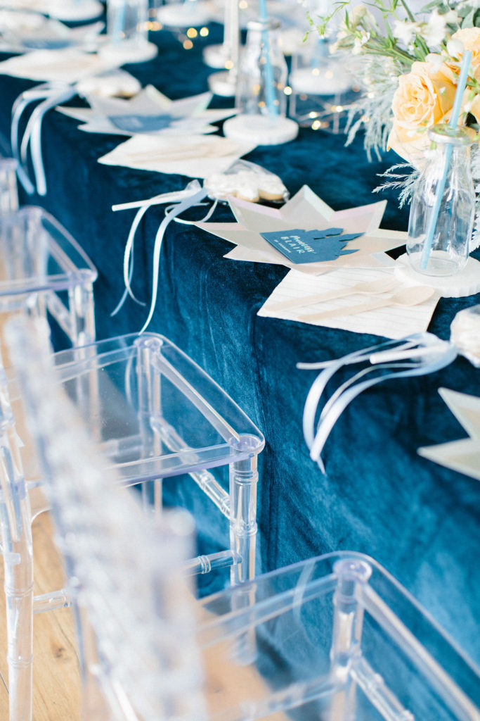 I started pulling ideas together, but it wasn’t until I found her dress, complete with a silver nordic patterned cape, that the color palette was really established. A dusty muted navy, accented by shades of french blue, and popped with caramel warmth in the floral and wood elements for contrast. Icy pieces were a must- acrylic chiavari chairs at the kids table, the iridescent finish of the plates and napkins, and Kristoff’s “ice blocks” were incorporated into the centerpiece.