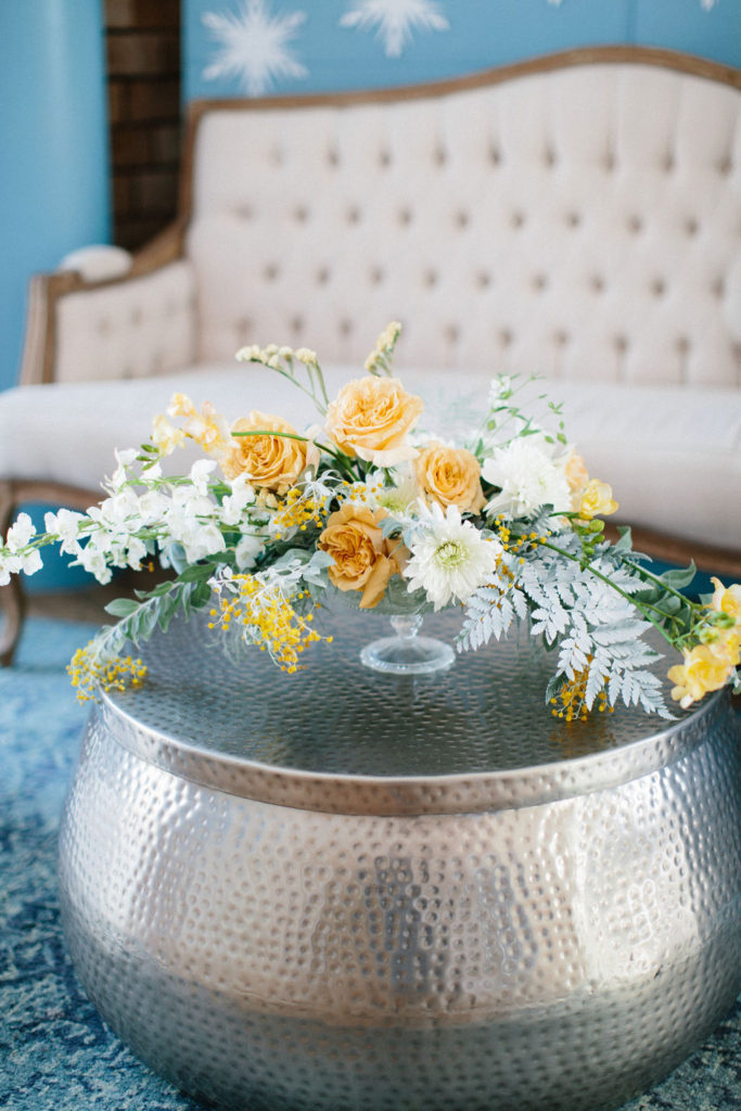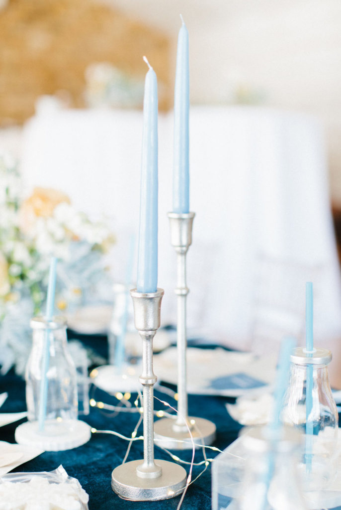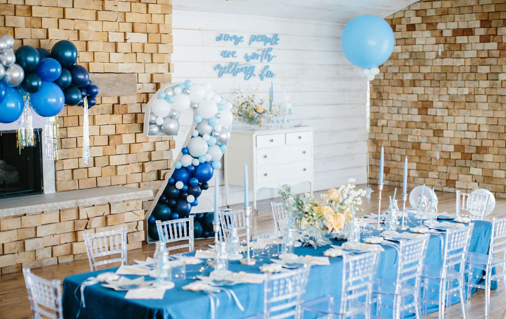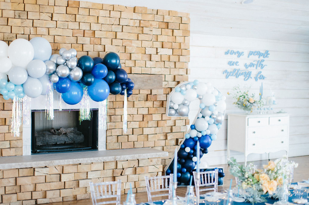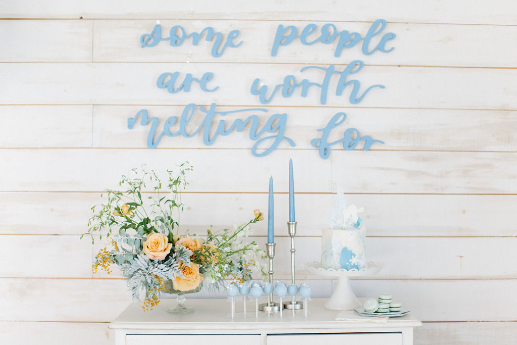 I started pulling ideas together, but it wasn’t until I found her dress, complete with a silver nordic patterned cape, that the color palette was really established. A dusty muted navy, accented by shades of french blue, and popped with caramel warmth in the floral and wood elements for contrast. Icy pieces were a must- acrylic chiavari chairs at the kids table, the iridescent finish of the plates and napkins, and Kristoff’s “ice blocks” were incorporated into the centerpiece.