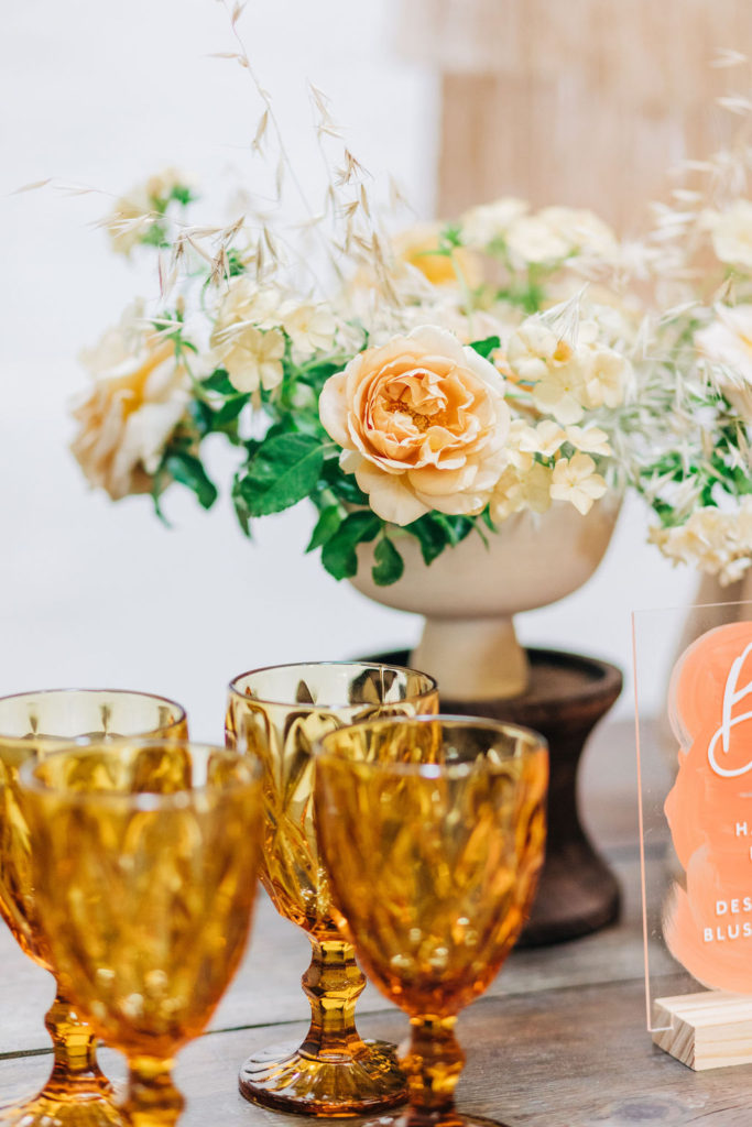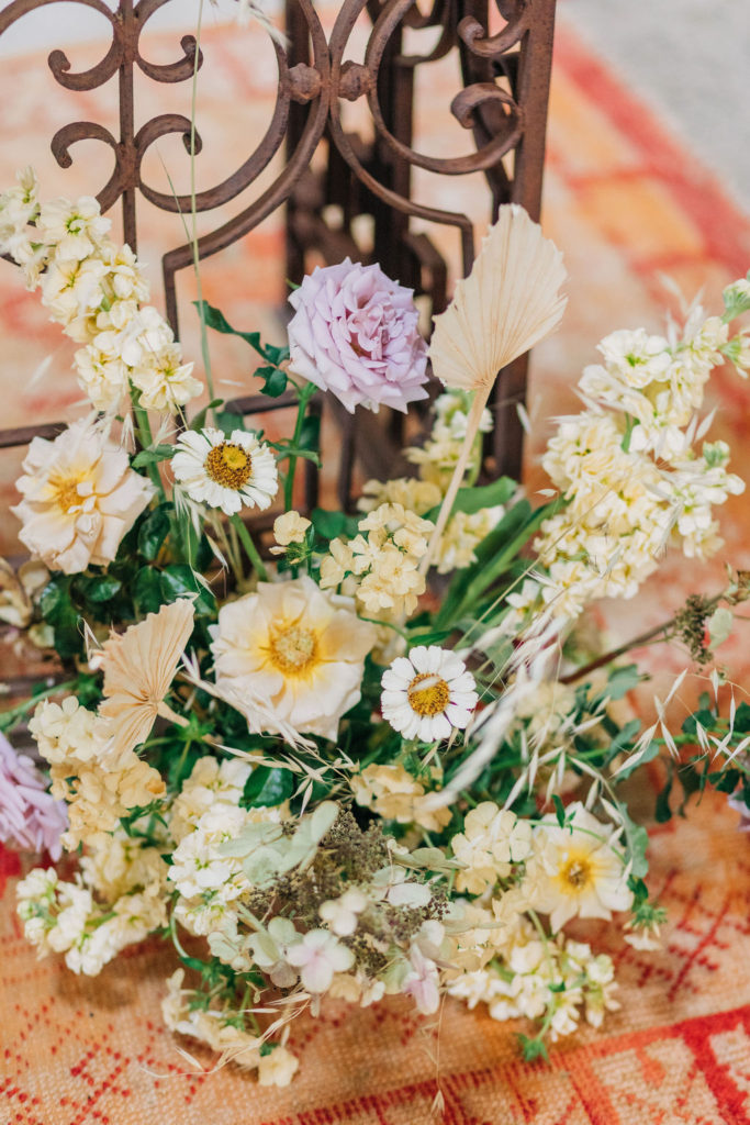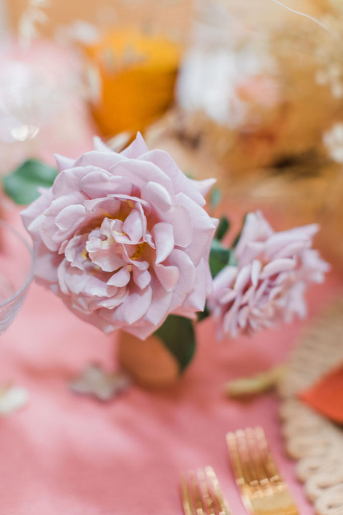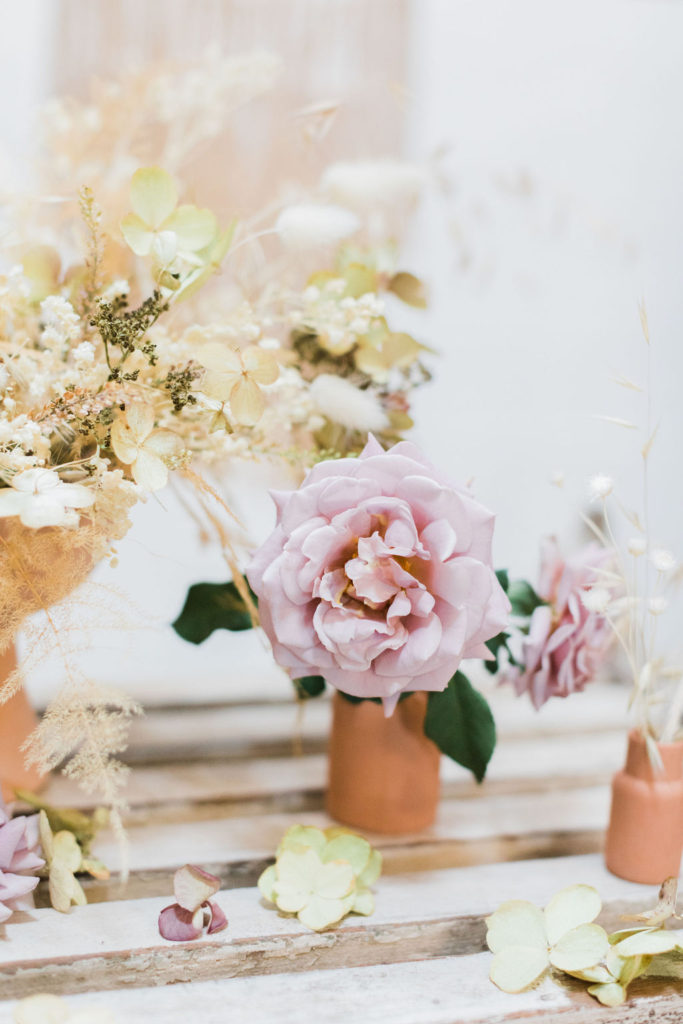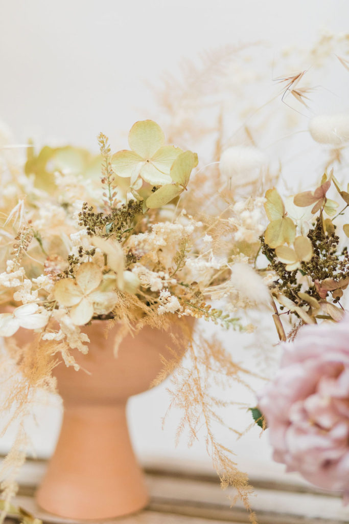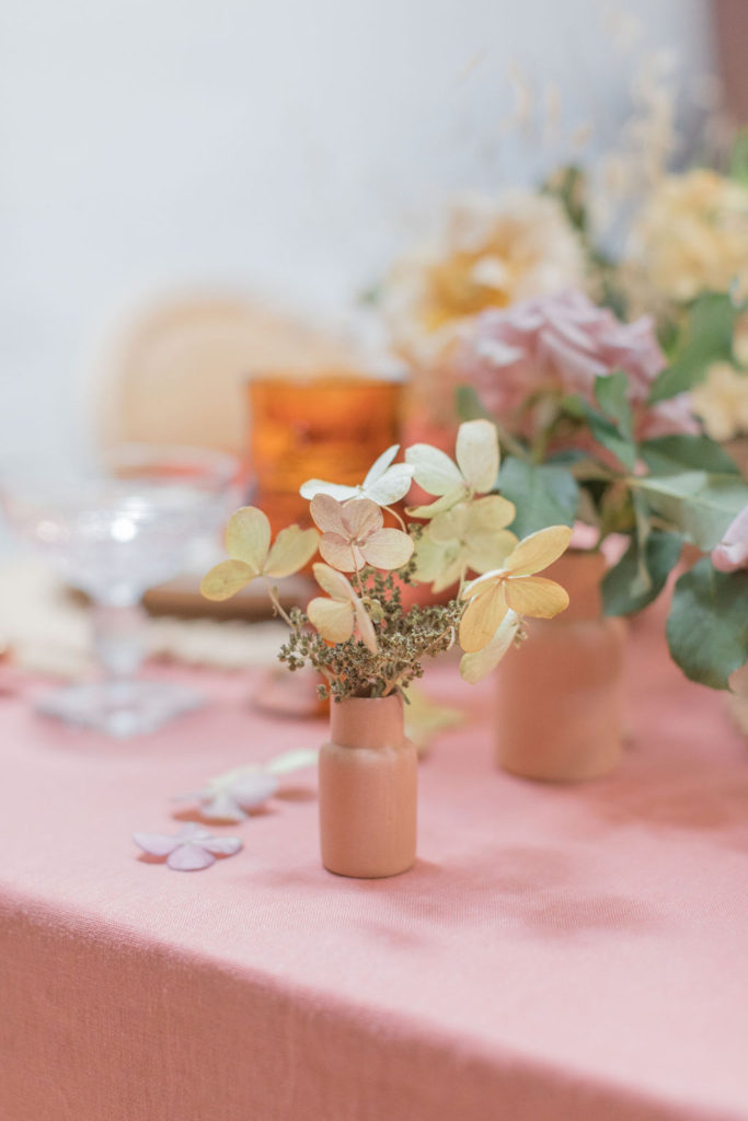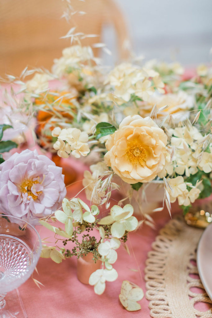 “I chose neutral-hued blooms to complement the overall palette of the tablescape. Creme brûlée Phlox, koko loko and honey Dijon garden roses from psalterfarms in San Diego and dried wild grasses. The lavender flowers were koko loko garden roses, and I used pee gee hydrangea.  I also used handcrafted terra-cotta pottery from Leila Ray ceramics!”