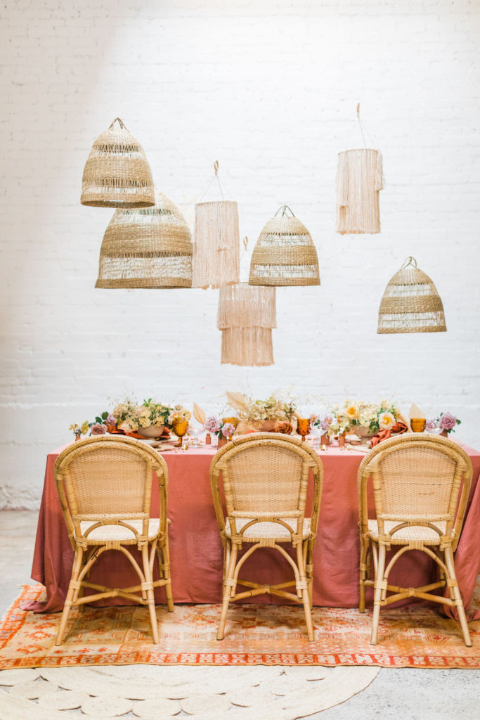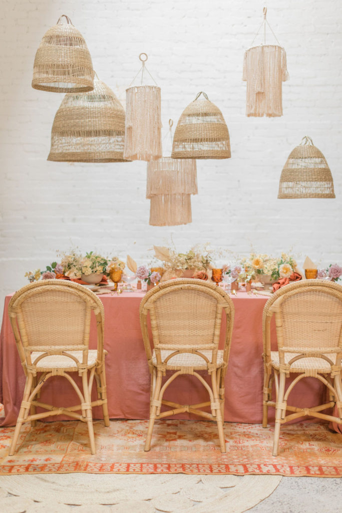 The colors of the florals by Third & Park were a mix of neutrals with pops of lavender that paired so well with the rust tones.  We also added a touch of rattan with more chandeliers, chairs, and placemats.  With all this layering of elements, details, and textures our vision came to life!