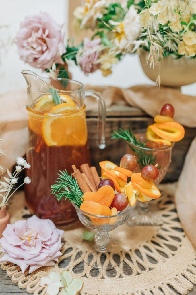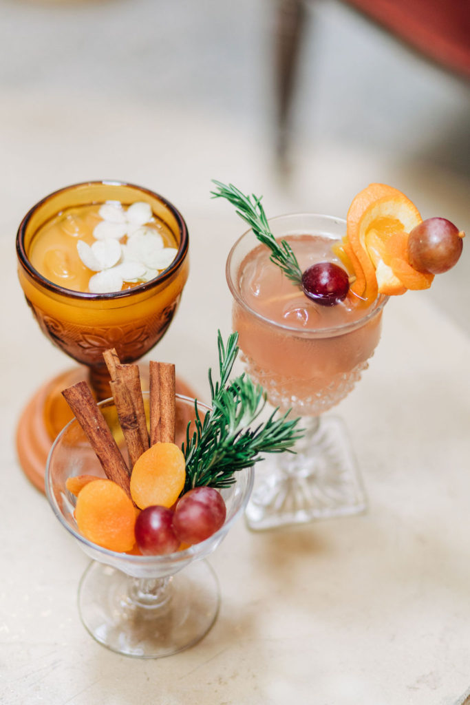 Who doesn’t love a good sangria? This fun play on a traditional sangria combines a crisp rosé with fruit juices, a delectable apricot brandy, all topped off with spicy ginger ale and macerated fruits. We garnished this cocktail with a fresh rosemary skewer stacked with grapes, dried apricots, and citrus for a delicious and flavorful treat. This Sangria is sure to bring everyone together for the holidays.