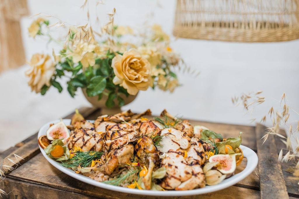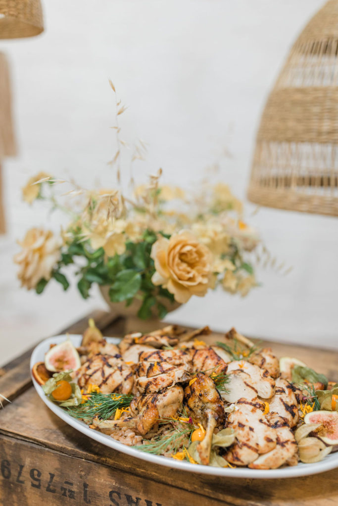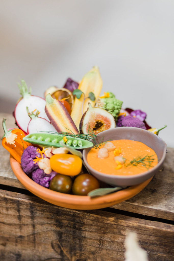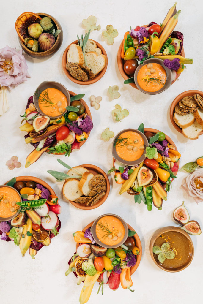 “For the menu, not only were we inspired by the lovely hue of terra cotta, but seasonally inspired small dishes added to the fall gathering experience. First, we choose to do a grazing table where each guest can choose their small plates. The menu consisted of Grilled Organic Chicken with Farro, Figs, and Herbed Jus, and the most inspired dish of all — Fall Crudités with Roasted Pepper Hummus. We work with some great local farmers and purveyors when it comes to seasonal produce. The mini crudités included tri-colored baby carrots, romanesco florets, heirloom tomatoes, french radishes, and purple cauliflower, all of which reflect a true Southern Californian harvest. Of course, we had to incorporate the color scheme into the overall food display and plating, to round out the entire vision.”