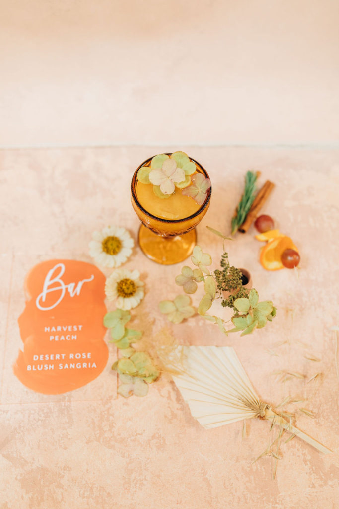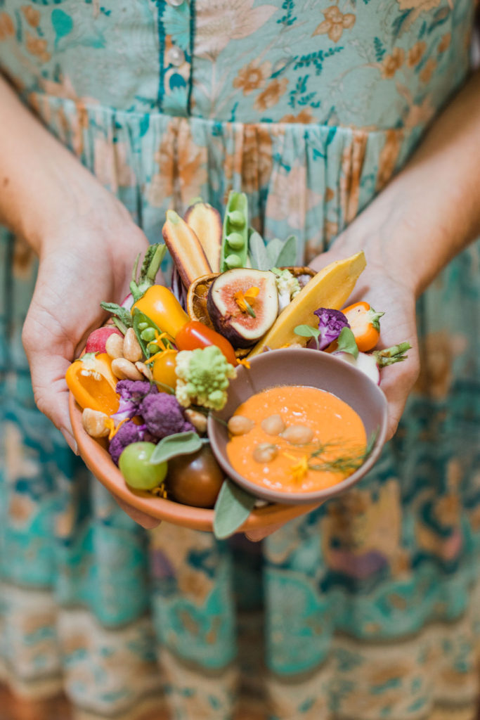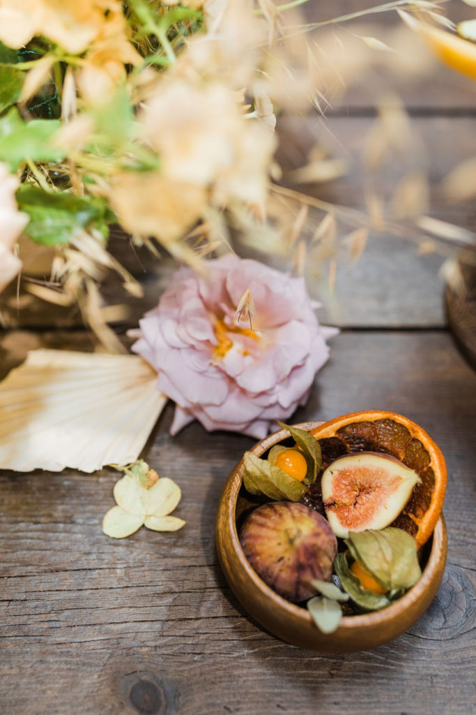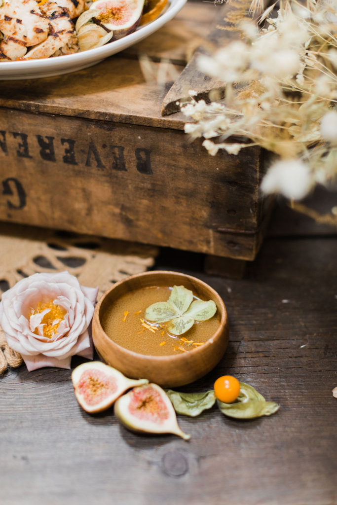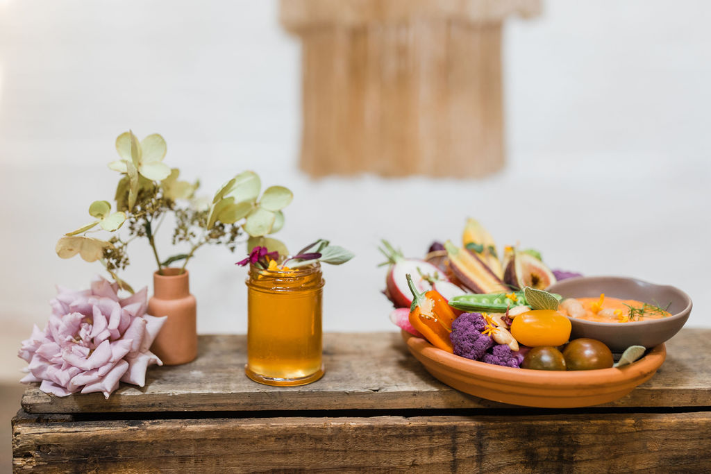 “For the menu, not only were we inspired by the lovely hue of terra cotta, but seasonally inspired small dishes added to the fall gathering experience. First, we choose to do a grazing table where each guest can choose their small plates. The menu consisted of Grilled Organic Chicken with Farro, Figs, and Herbed Jus, and the most inspired dish of all — Fall Crudités with Roasted Pepper Hummus. We work with some great local farmers and purveyors when it comes to seasonal produce. The mini crudités included tri-colored baby carrots, romanesco florets, heirloom tomatoes, french radishes, and purple cauliflower, all of which reflect a true Southern Californian harvest. Of course, we had to incorporate the color scheme into the overall food display and plating, to round out the entire vision.”