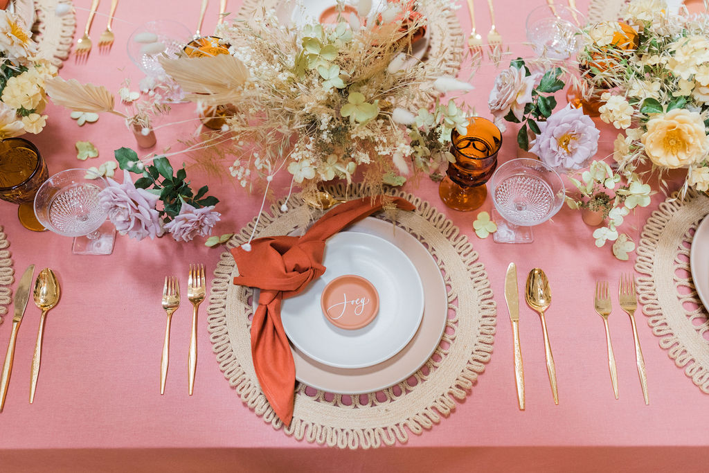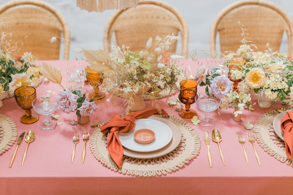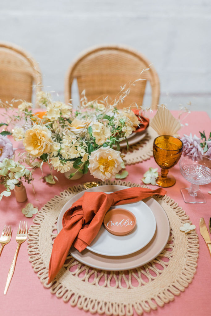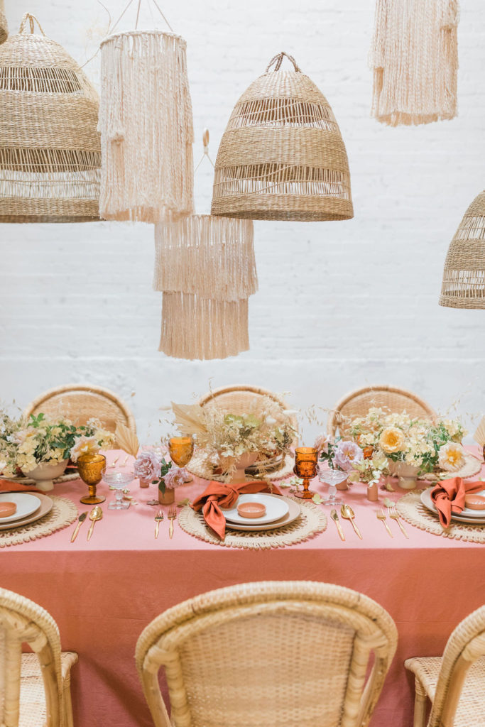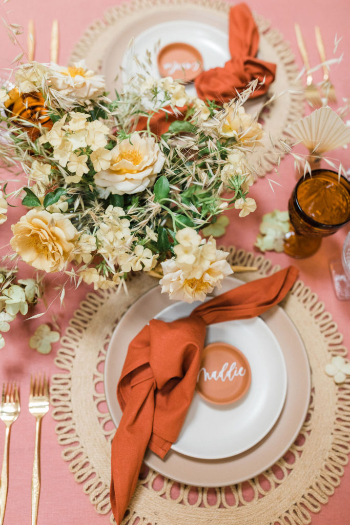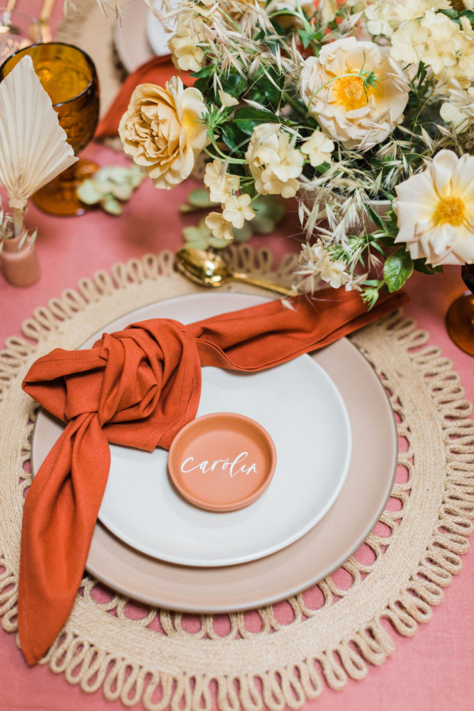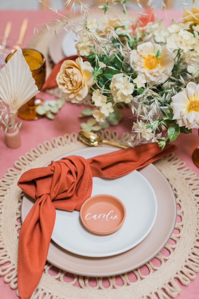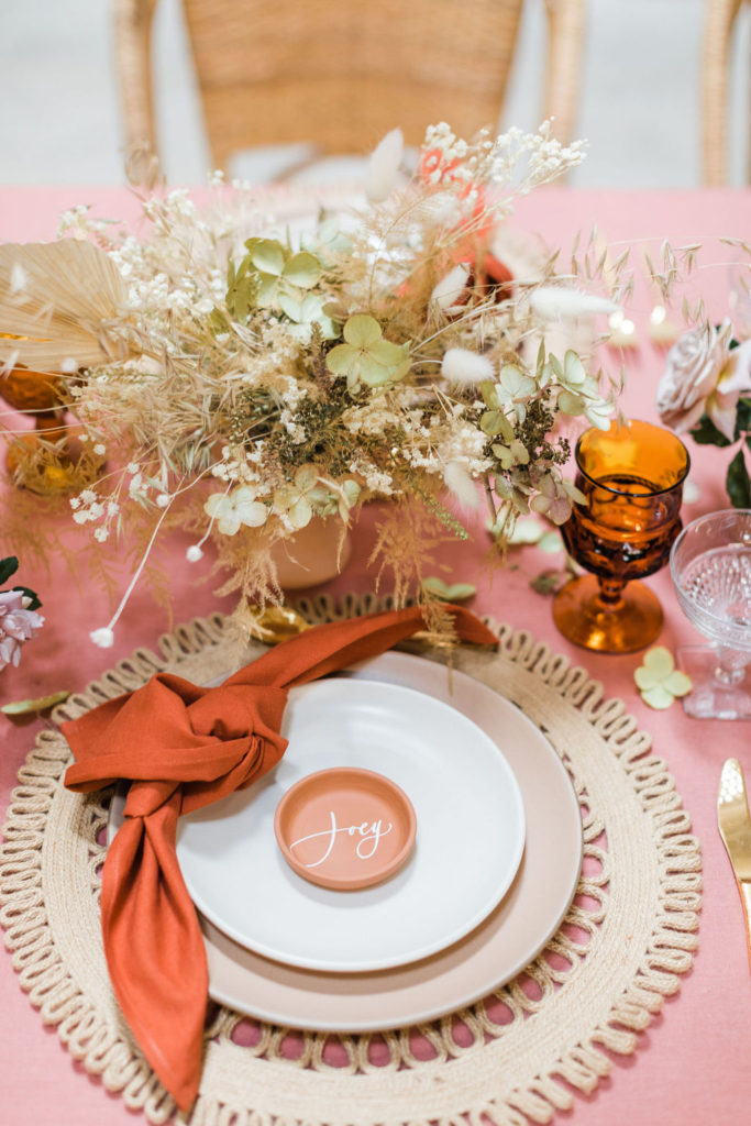 When planning an event there are so many different aspects to consider.  We started with the table using a gorgeous terra cotta linen tablecloth from Party Crush Studio and having macrame chandeliers overhead created by The Neutral Knot.  There were the terra cotta place cards by Proper Letter and vessels used for the amazing floral arrangements.