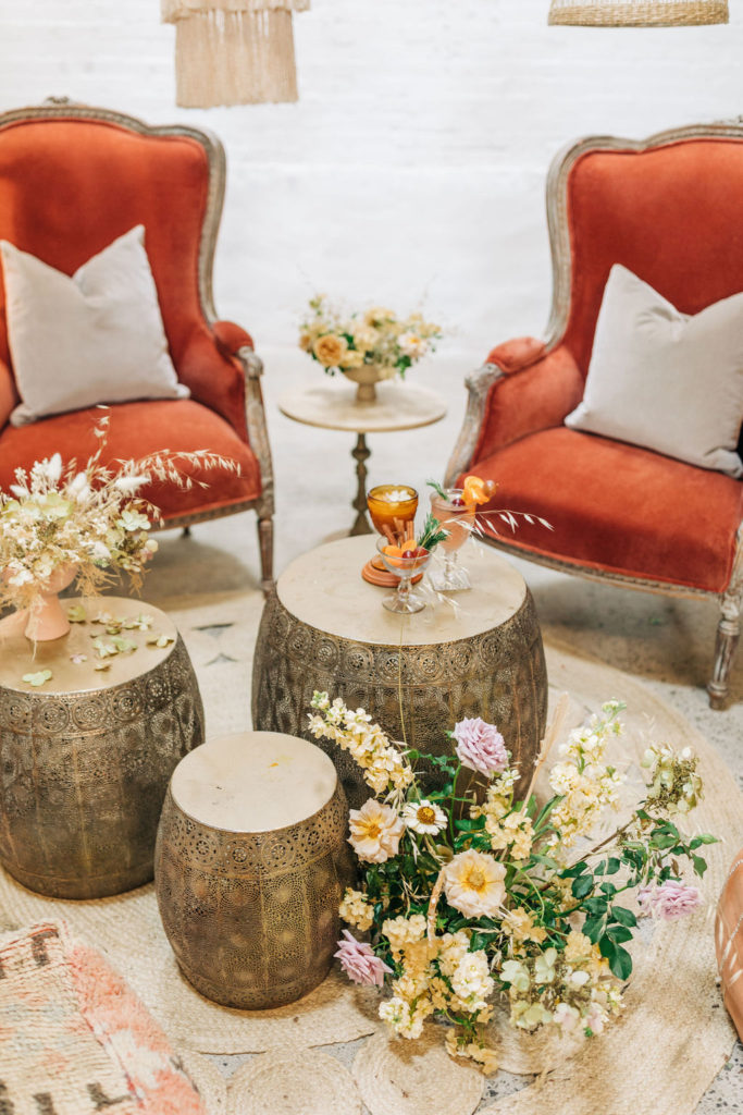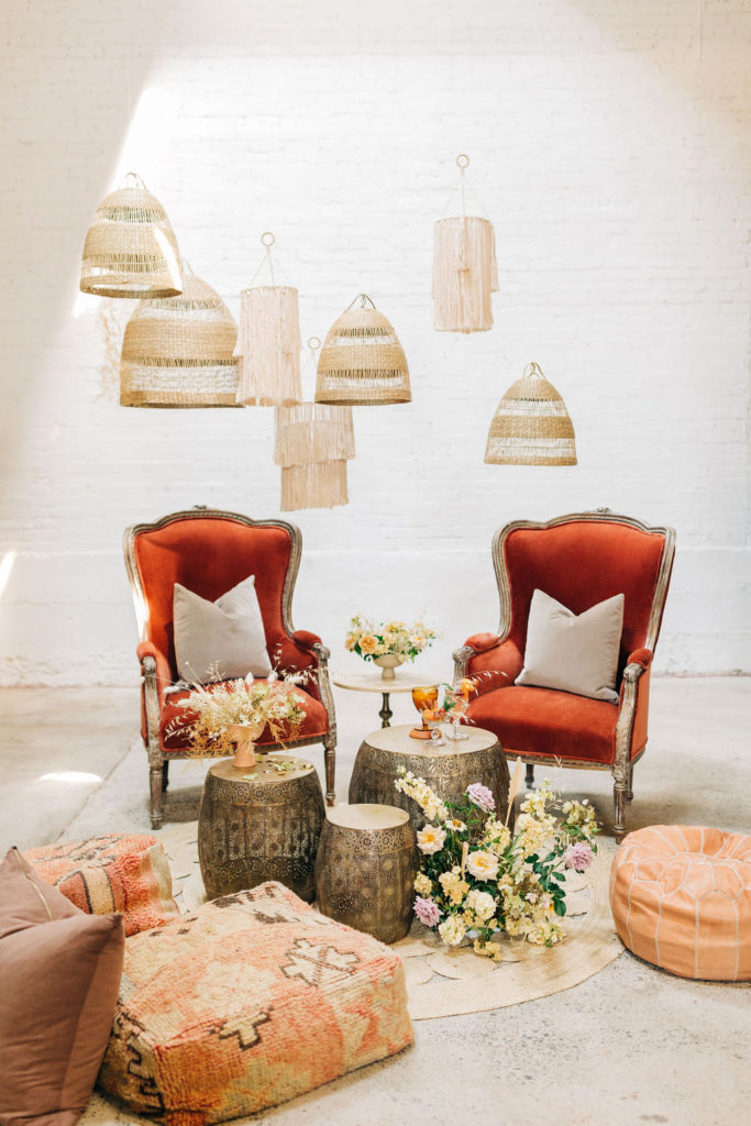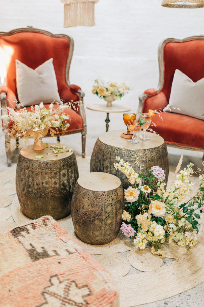 By not going full bohemian with all low seating, we’ve combined sumptuous velvet high-back chairs that compliment the pouf and pillow arrangement.  Pair that with some tables in varying heights and you’ve pulled off the perfect ‘seating landscape’ that makes each guest comfortable.”