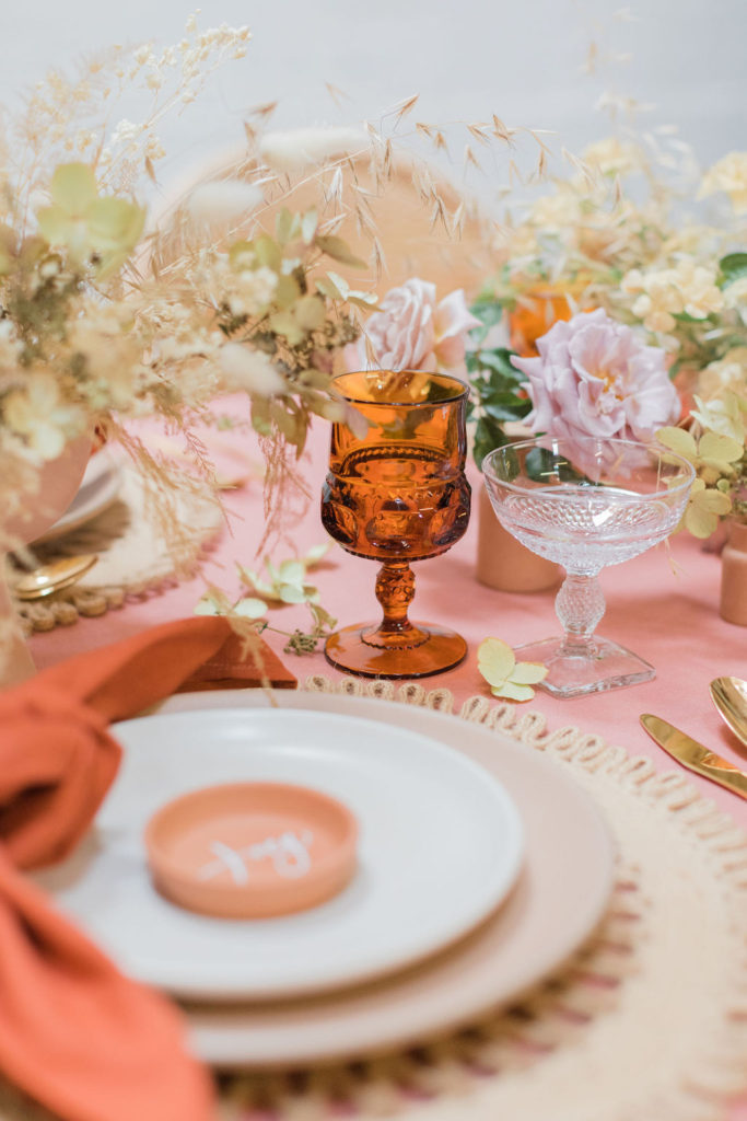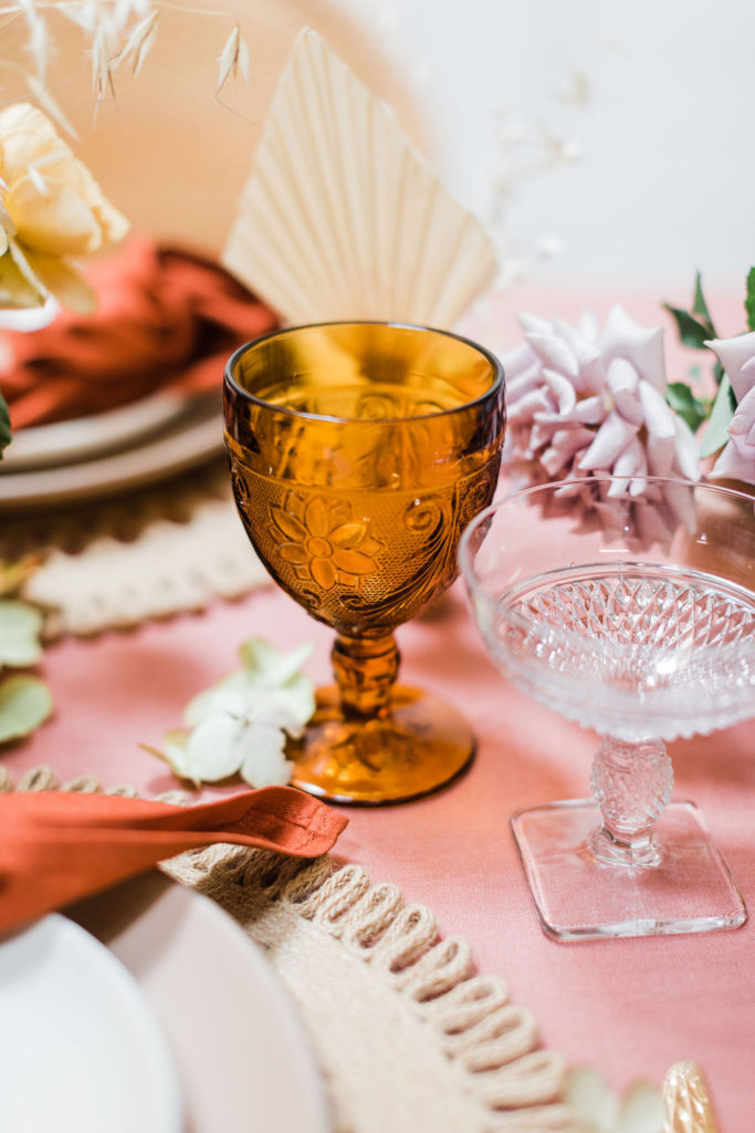 I love a layered look for a table and including pretty details.  For this table, as I said, we layered a beautiful rust-colored tablecloth from Party Crush Studio with placemats from Third & Park along with a beautiful series of heath plates and amber glassware from Cherished Rentals.  Of course, we had to add another rust element with the napkin from Hostess Haven.