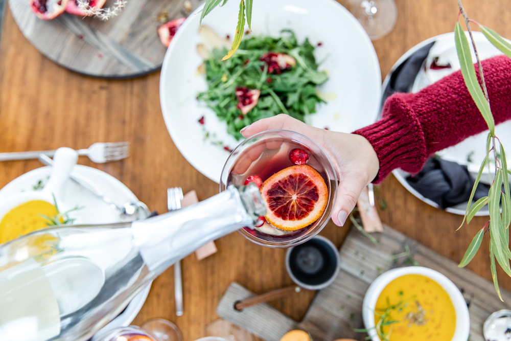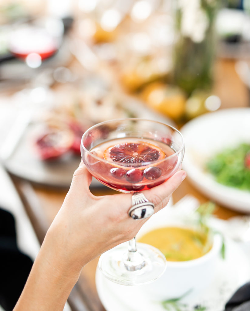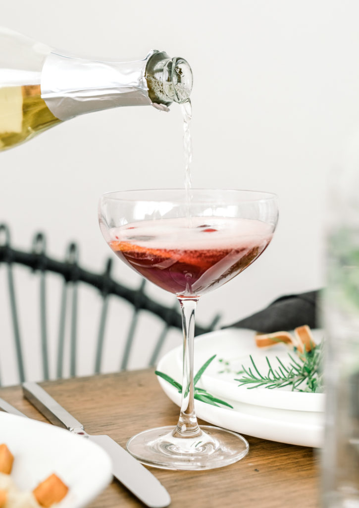 Pour about a quarter full of cranberry juice in a champagne flute. Fill the rest with sparkling champagne and garnish with a slice of blood orange and 3-4 cranberries! Simple and delicious!
