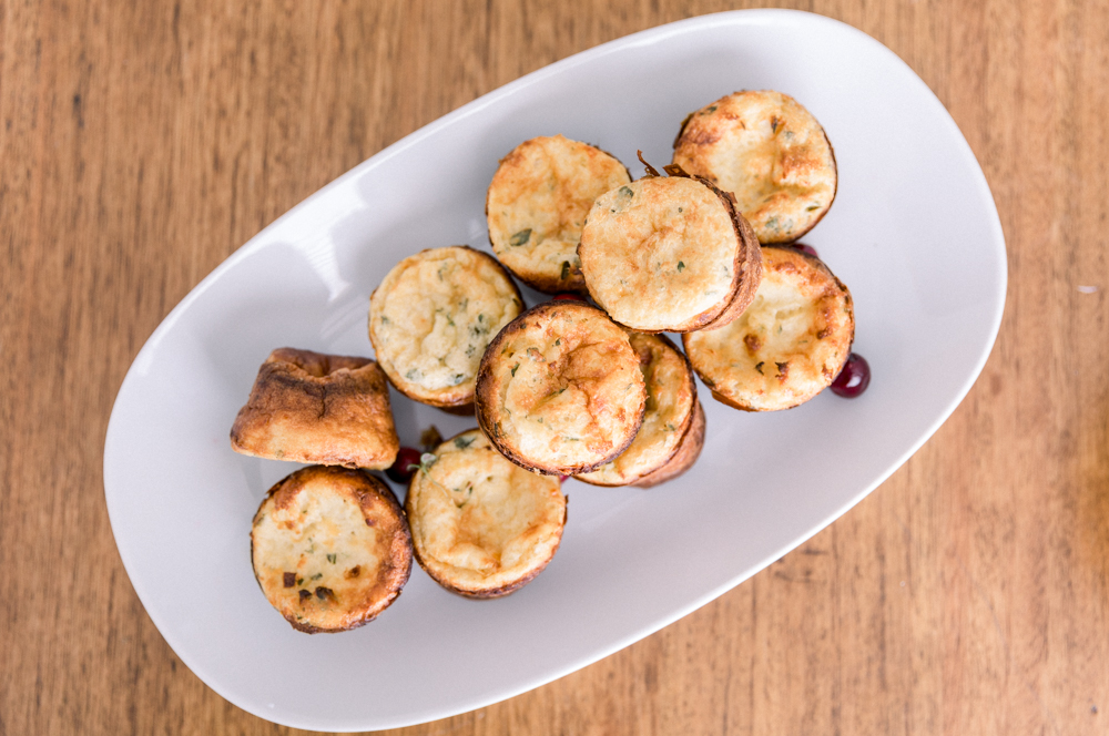 Popovers are culinary sleight of hand. Their simple ingredients and mixing method belie the great heights to which they rise during baking, puffing up like crispy brown balloons. All of the ingredients may be measured in advance, but do not combine them until you are ready to bake the popovers. A popover pan is designed to optimize that rise, with tall narrow cups that force the batter upward. You can bake popovers in a regular muffin pan although they don’t rise as high and they develop a rounded depression at the bottom that, when turned upside down, is the perfect spot for some gravy. Popovers do not hold or store well, so plan on enjoying them when they are fresh from the oven. If they have cooled, reheat them briefly in a 350°F oven for 5 to 10 minutes, until warm.