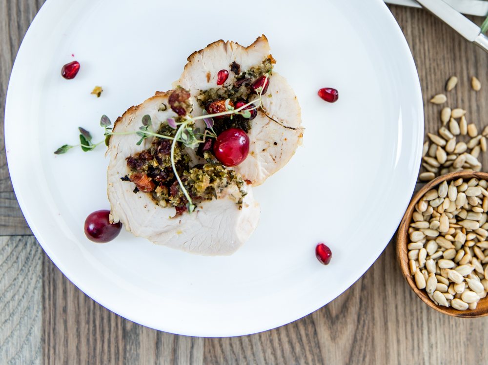 In a small bowl, combine the bread crumbs, parsley, sage, rosemary, garlic, cranberries, ¼ teaspoon of the salt, ⅛ teaspoon of the pepper, and 3 tablespoons (45 ml) of the olive oil. Stir well to combine.