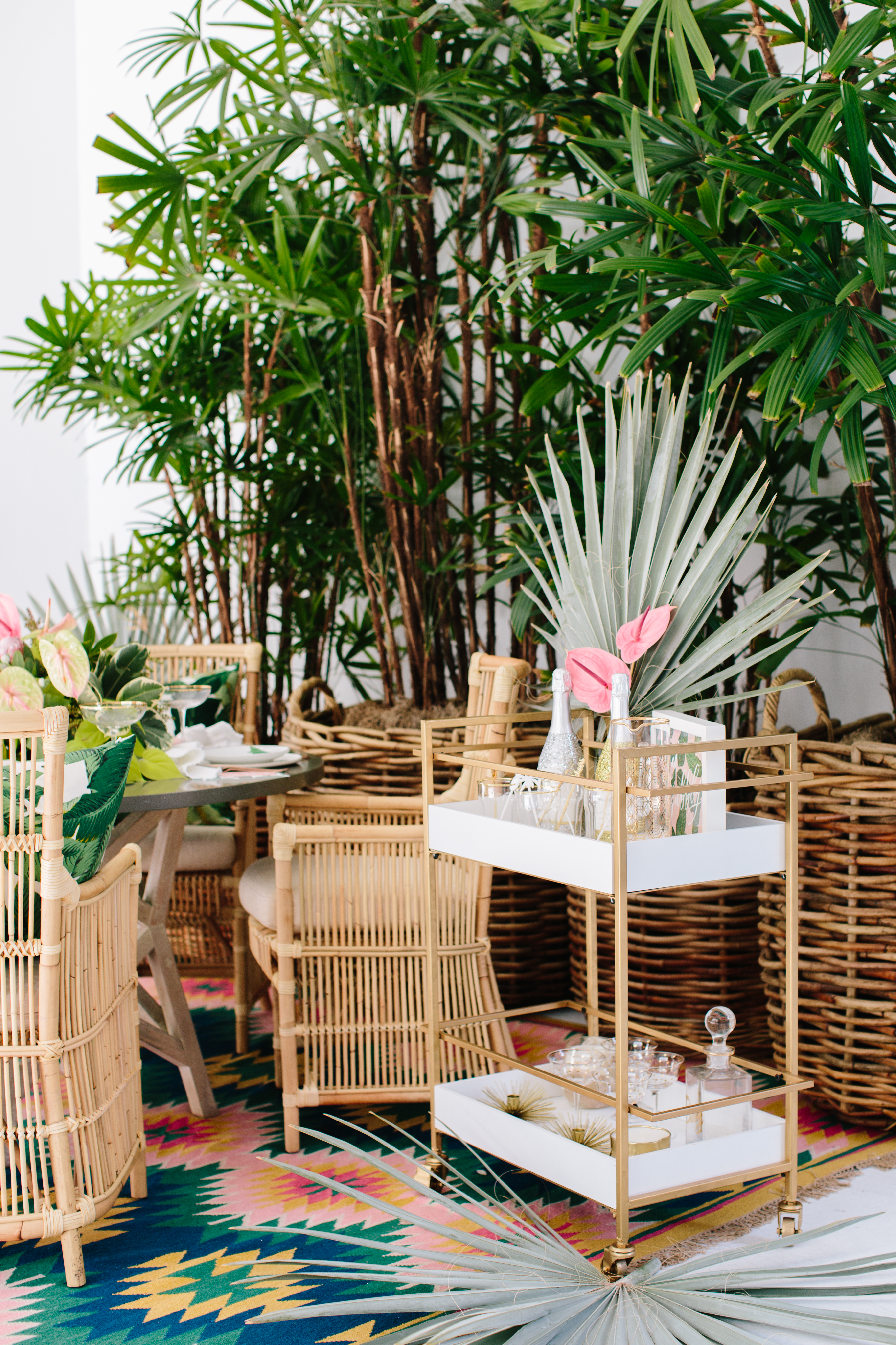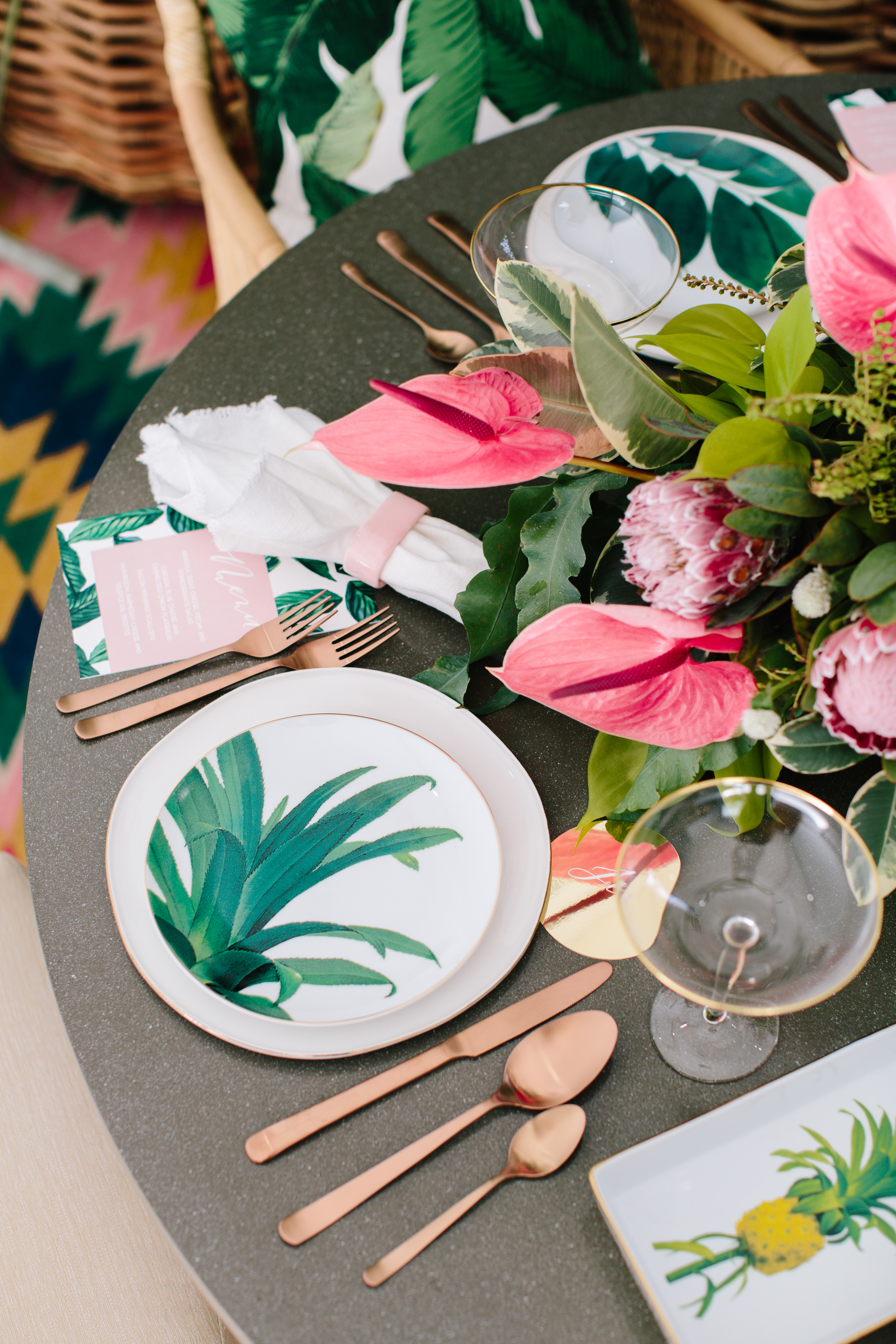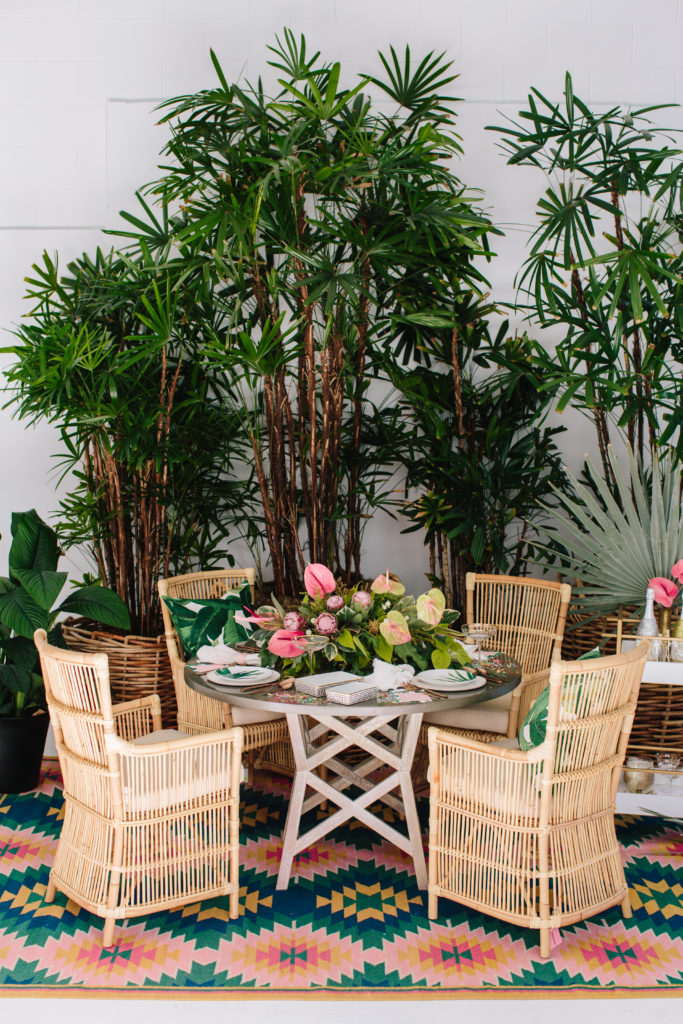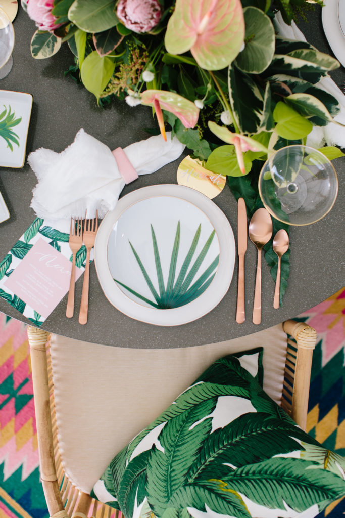 Everything used for this shoot from the furniture to the tabletop is from Lulu & Georgia! So you can literally recreate this yourself! These tropical palm leaf plates were the perfect addition to the table and really make it pop! And I fell in love with the super tropical floral arrangement from the Bloom Babes!