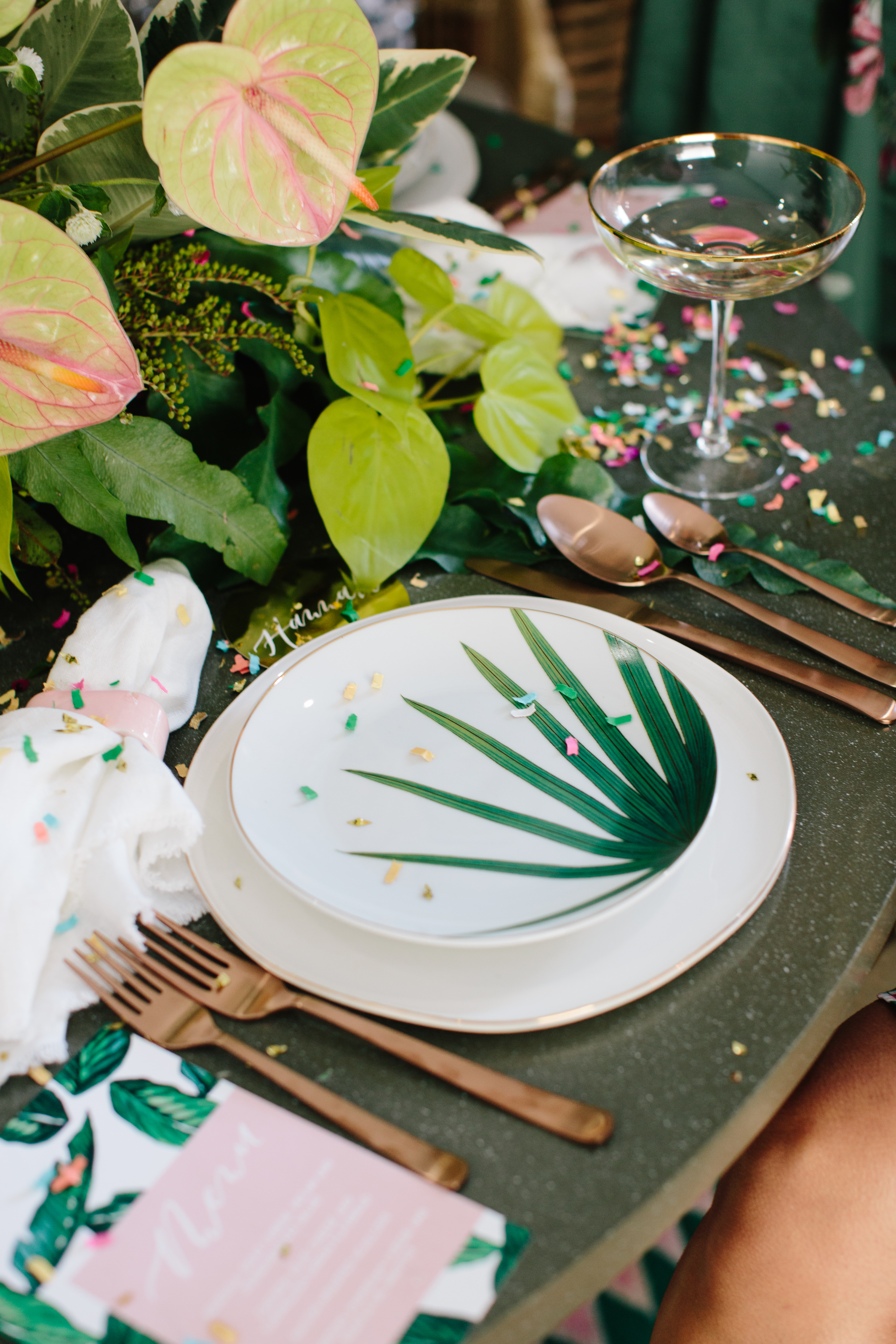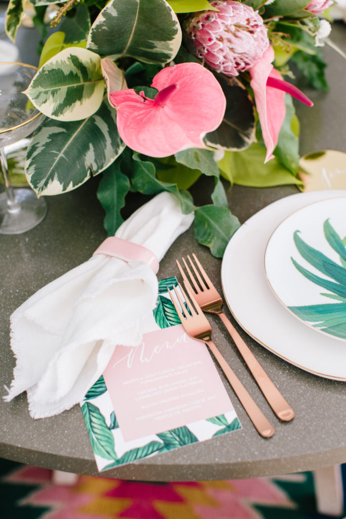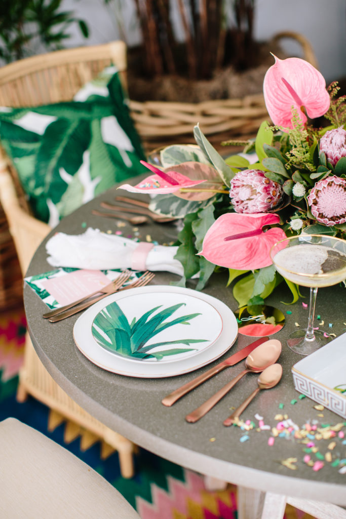 I always have to start with a gorgeous invite, and who else but my girl Taryn from Twinkle & Toast. Palm leaves and pink, sort of the perfect combination, am I right?! She created all of the paper goods for this shoot. And you’ll see that amazing custom confetti from The Confetti Bar and cutest cocktail stirrers from The Roc Shop through-out this shoot!
