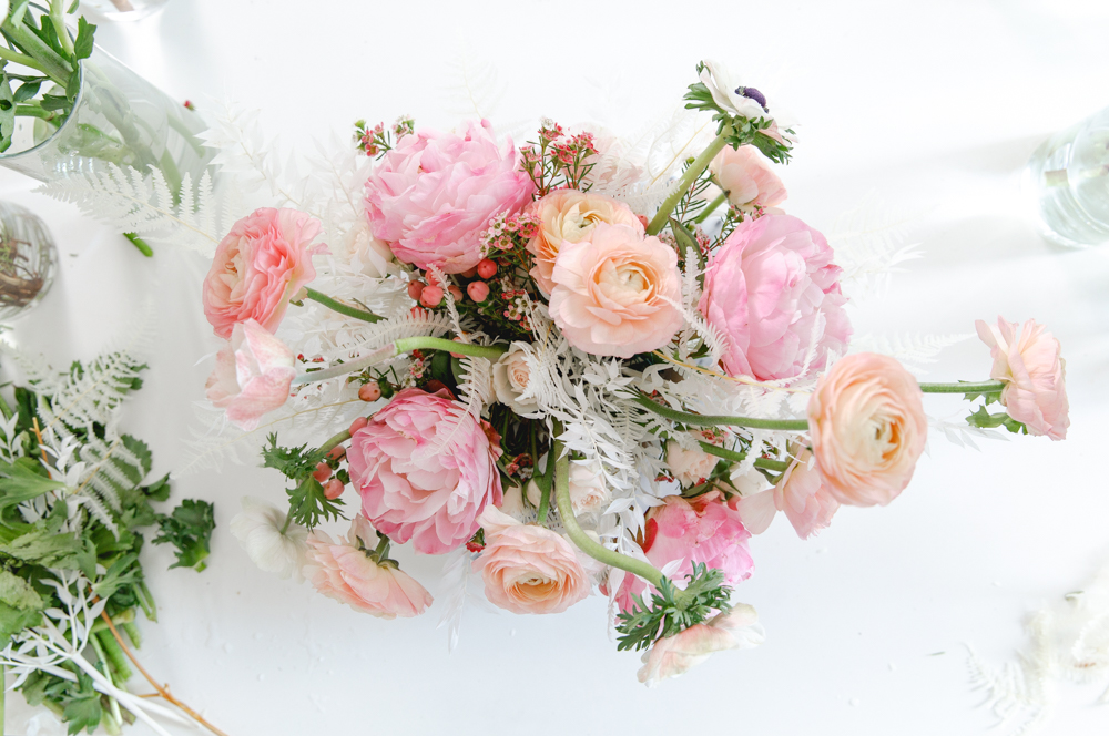 At this point, most of your compote should be filled up. Now, you can start to add your more fragile flowers like ranunculus. These can be placed low in your bowl, and float up high as well.
